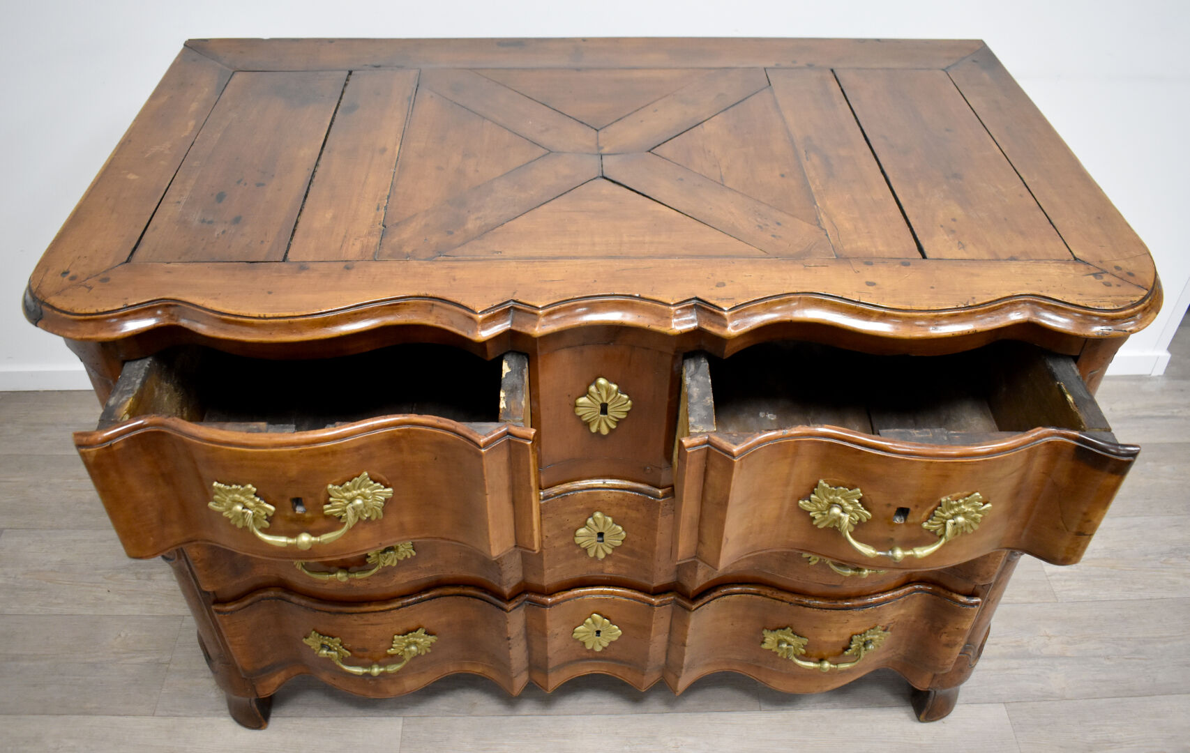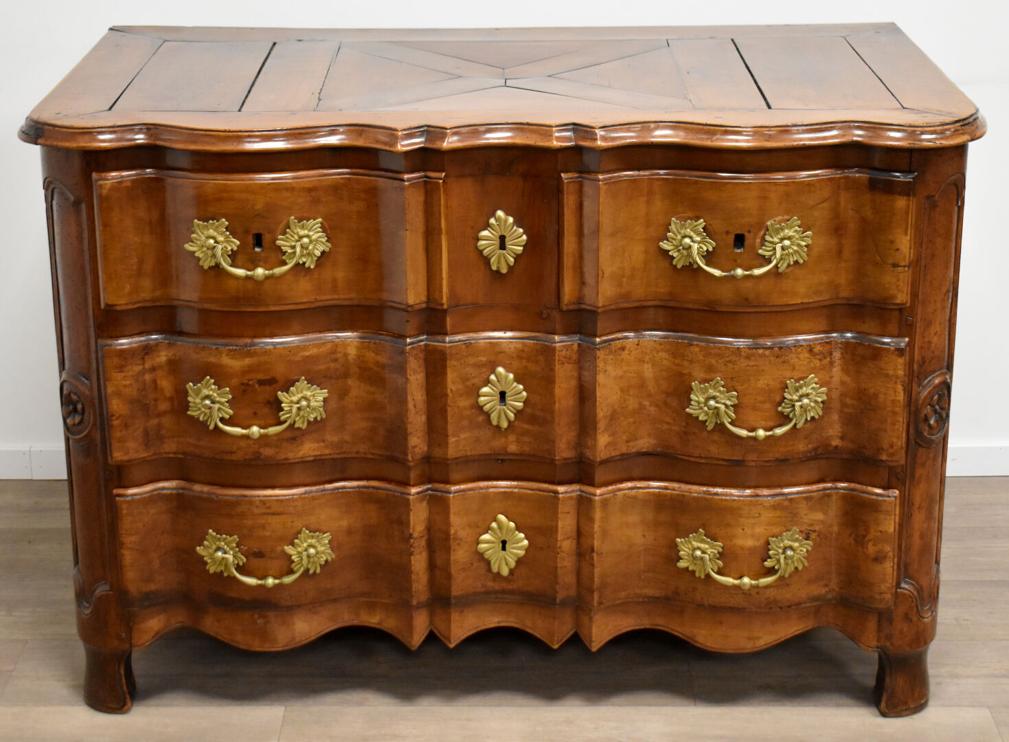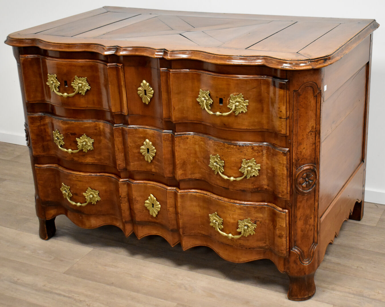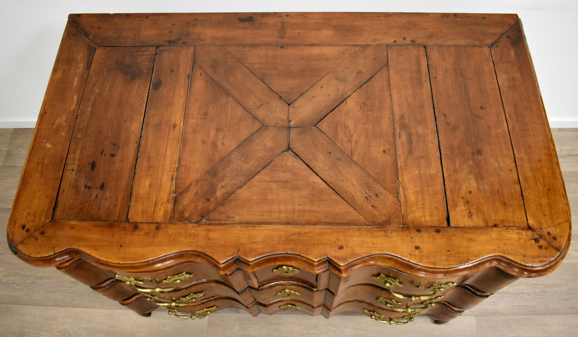Commode à façade en arbalète en bois fruitier. Elle ouvre à 4 tiroirs sur 3 rangs. Traverses apparentes (usures, restaurations, les côtés et le plateau en partie rapportés). Elle repose sur de petits pieds droits. Ornementation de bronze ciselé anciennement doré telle que poignées de tirage et entrées de serrures (rapportées ?). Le plateau parqueté. Époque régence. Haut. : 86 cm – Larg. : 117 cm – Prof. : 72 cm.