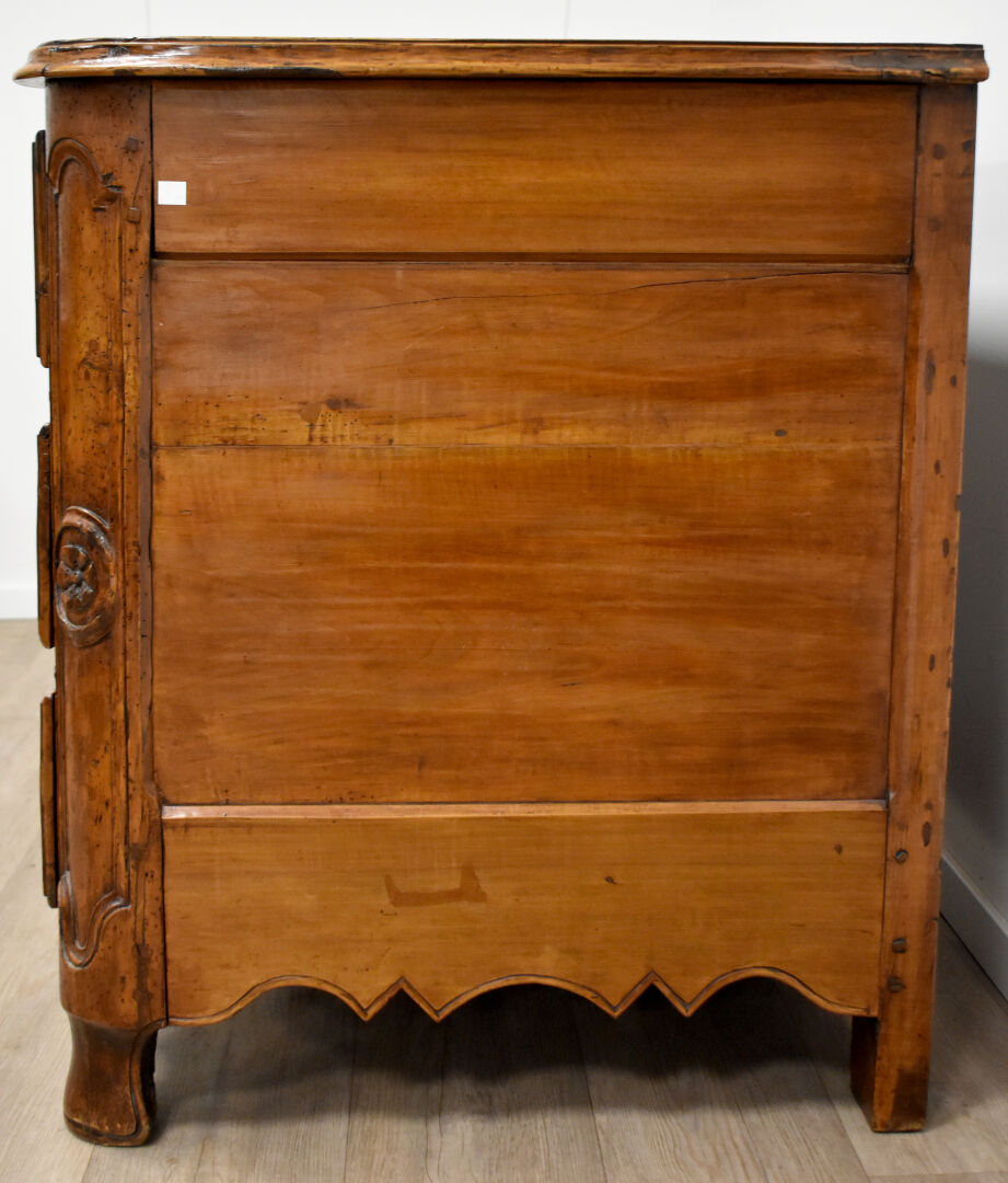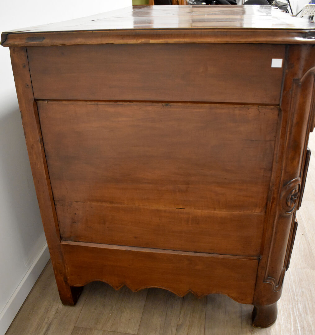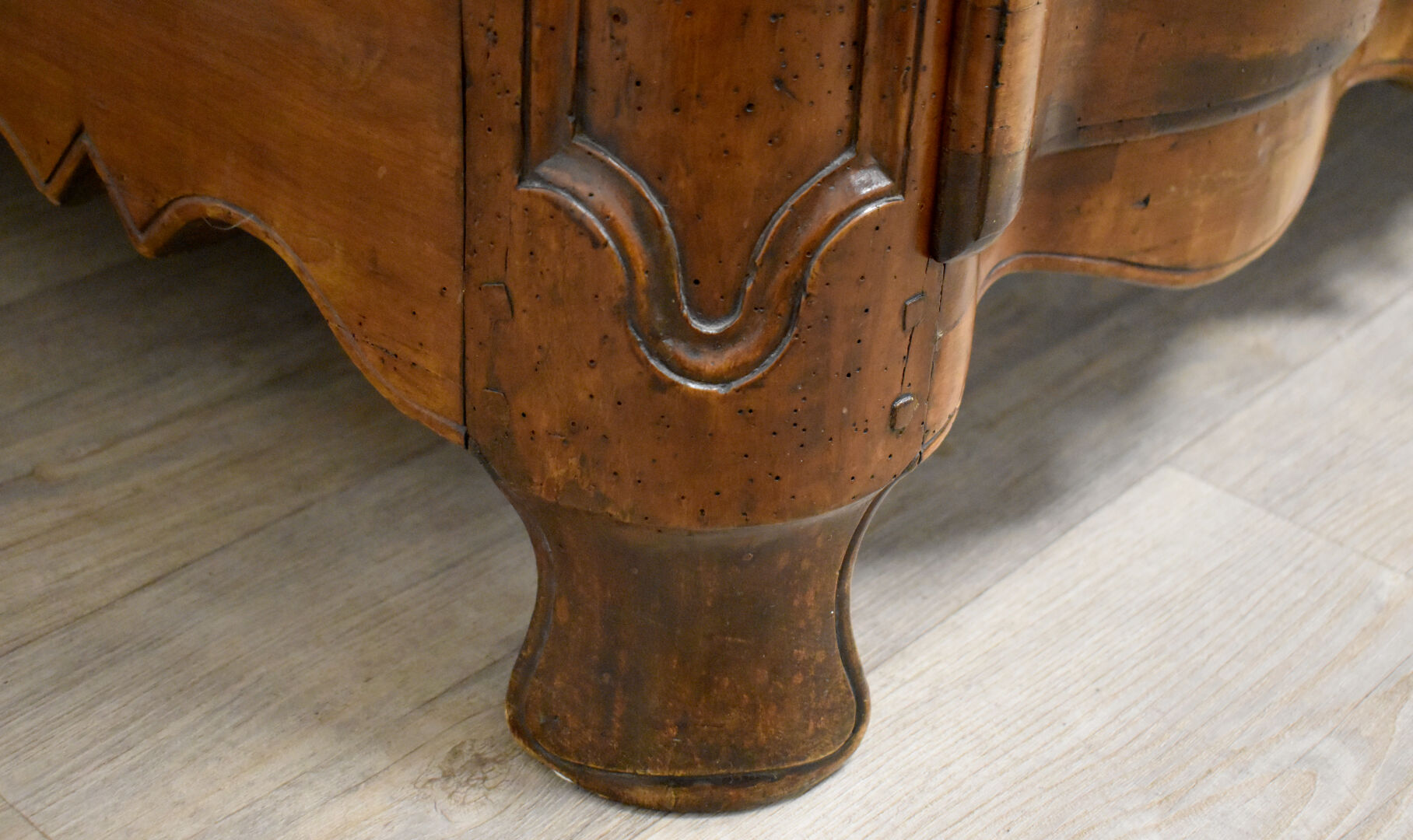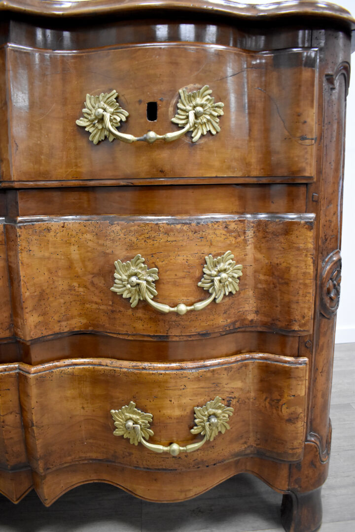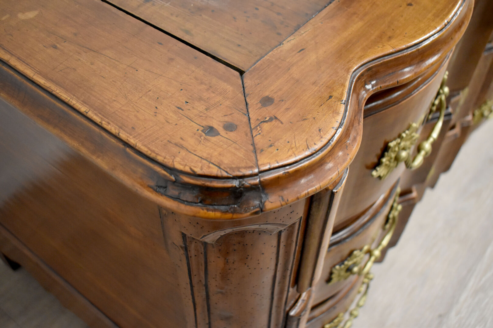 Commode à façade en arbalète en bois fruitier. Elle ouvre à 4 tiroirs sur 3 rangs. Traverses apparentes (usures, restaurations, les côtés et le plateau en partie rapportés). Elle repose sur de petits pieds droits. Ornementation de bronze ciselé anciennement doré telle que poignées de tirage et entrées de serrures (rapportées ?). Le plateau parqueté. Époque régence. Haut. : 86 cm – Larg. : 117 cm – Prof. : 72 cm.