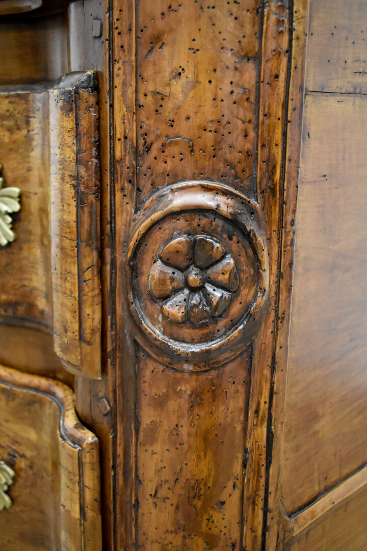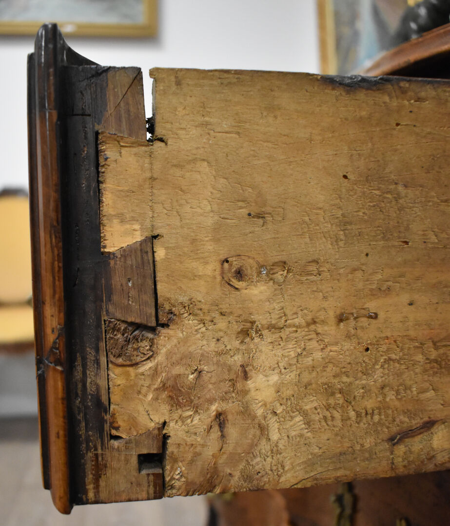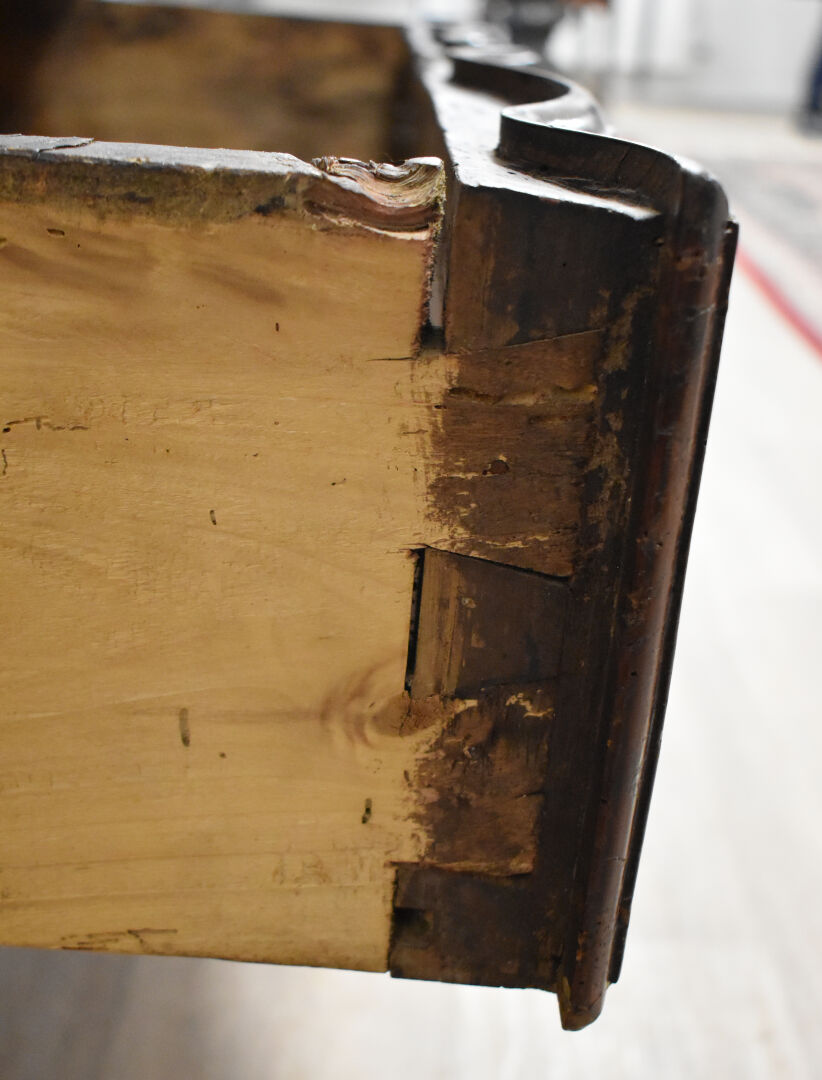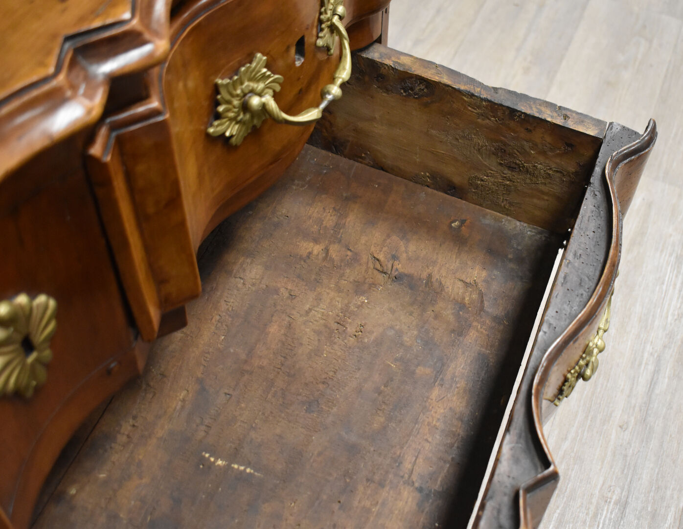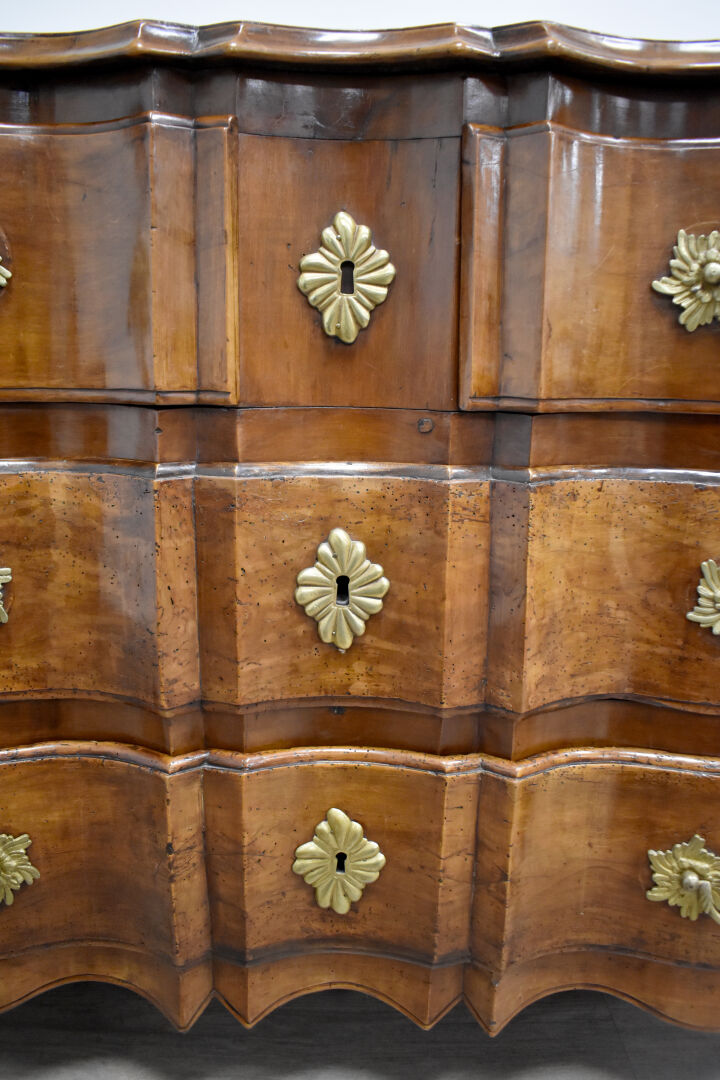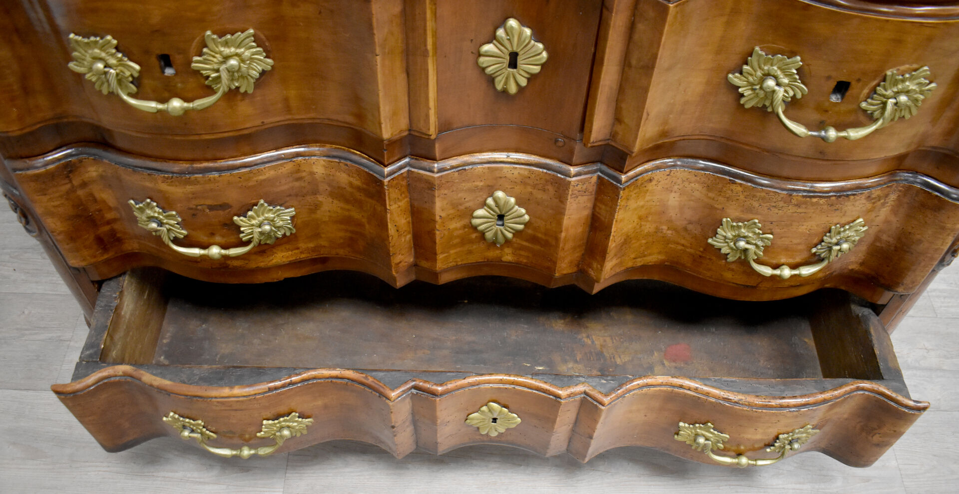 Commode à façade en arbalète en bois fruitier. Elle ouvre à 4 tiroirs sur 3 rangs. Traverses apparentes (usures, restaurations, les côtés et le plateau en partie rapportés). Elle repose sur de petits pieds droits. Ornementation de bronze ciselé anciennement doré telle que poignées de tirage et entrées de serrures (rapportées ?). Le plateau parqueté. Époque régence. Haut. : 86 cm – Larg. : 117 cm – Prof. : 72 cm.