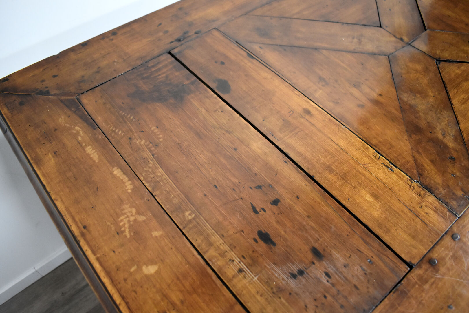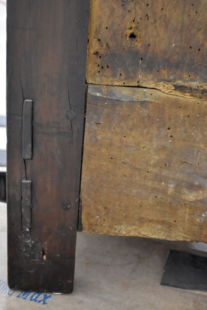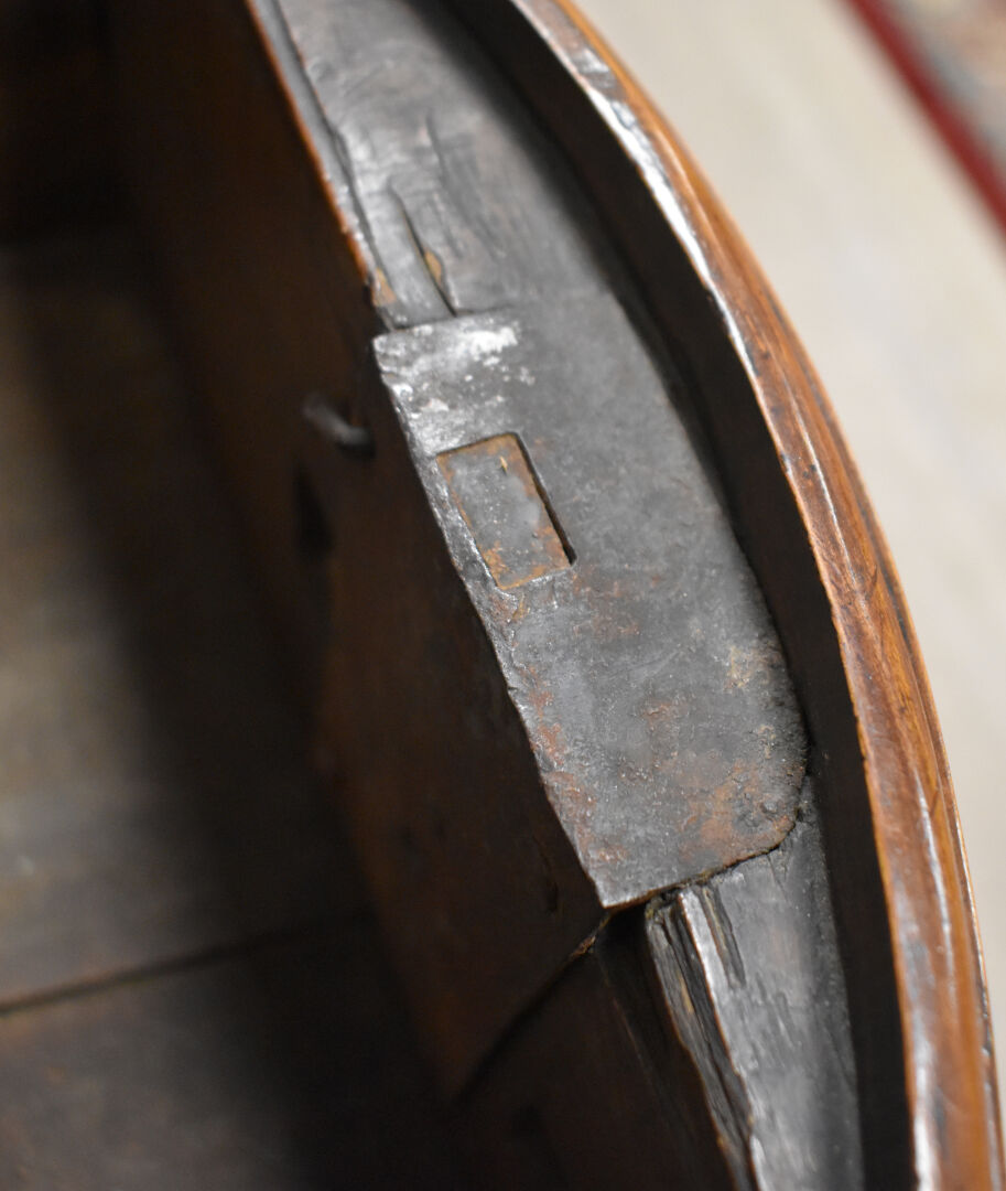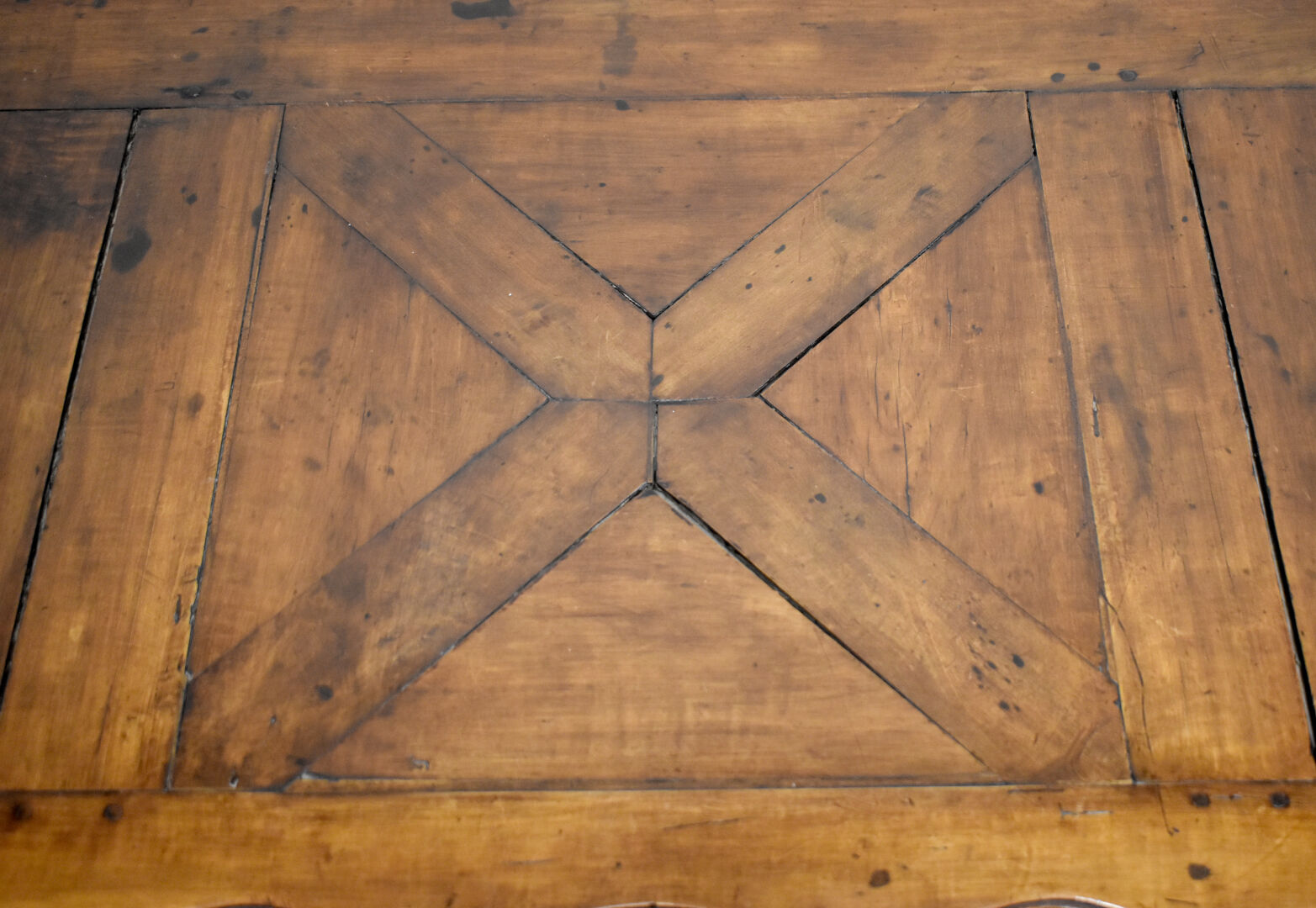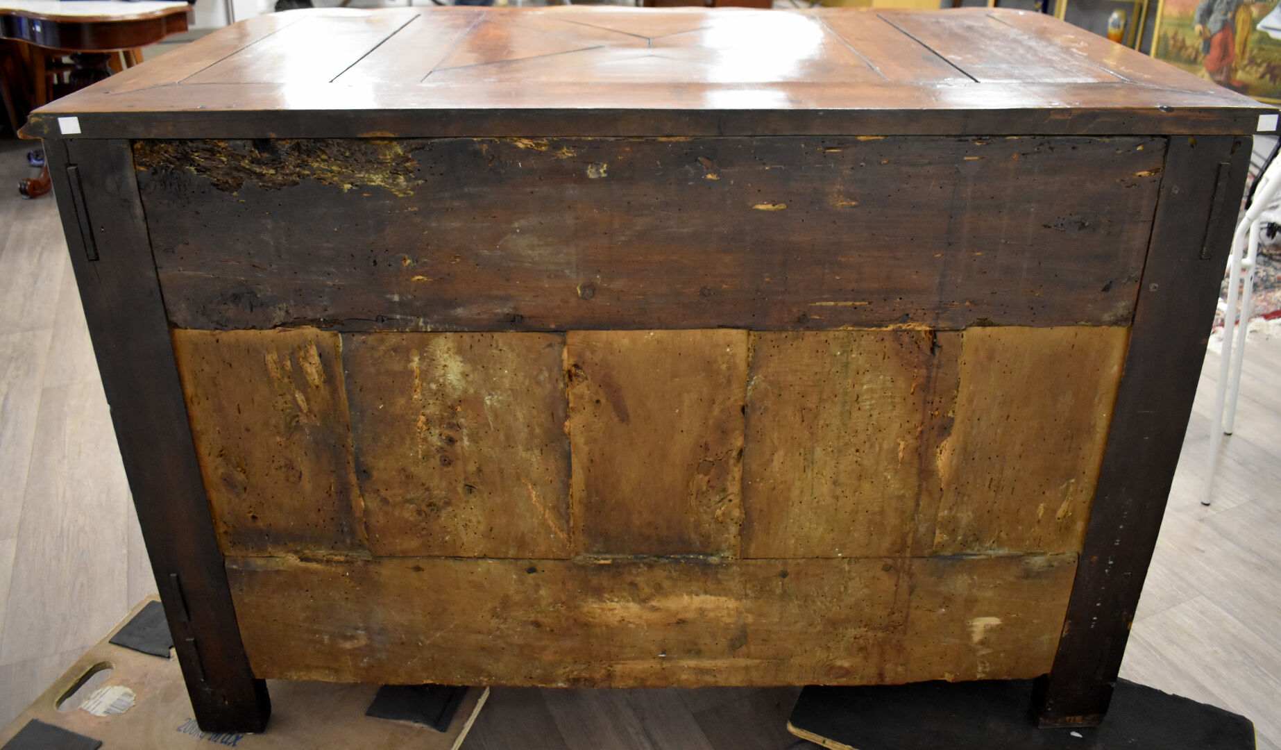 Commode à façade en arbalète en bois fruitier. Elle ouvre à 4 tiroirs sur 3 rangs. Traverses apparentes (usures, restaurations, les côtés et le plateau en partie rapportés). Elle repose sur de petits pieds droits. Ornementation de bronze ciselé anciennement doré telle que poignées de tirage et entrées de serrures (rapportées ?). Le plateau parqueté. Époque régence. Haut. : 86 cm – Larg. : 117 cm – Prof. : 72 cm.