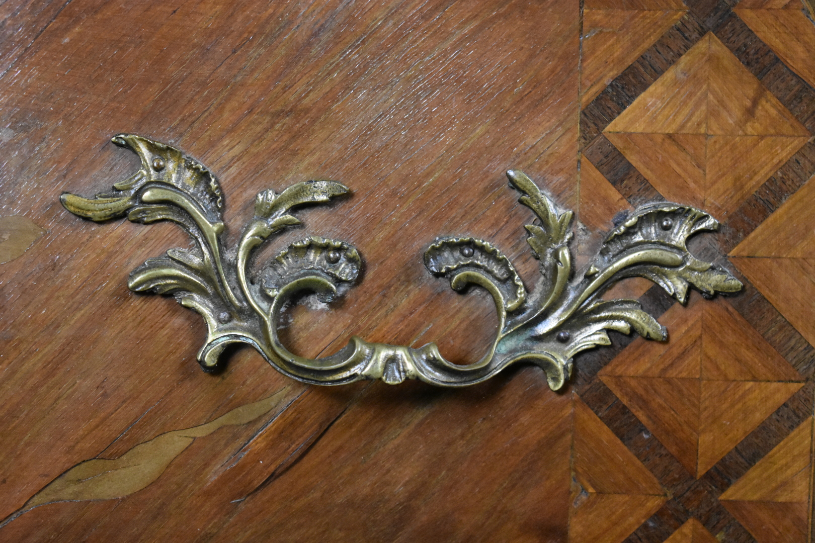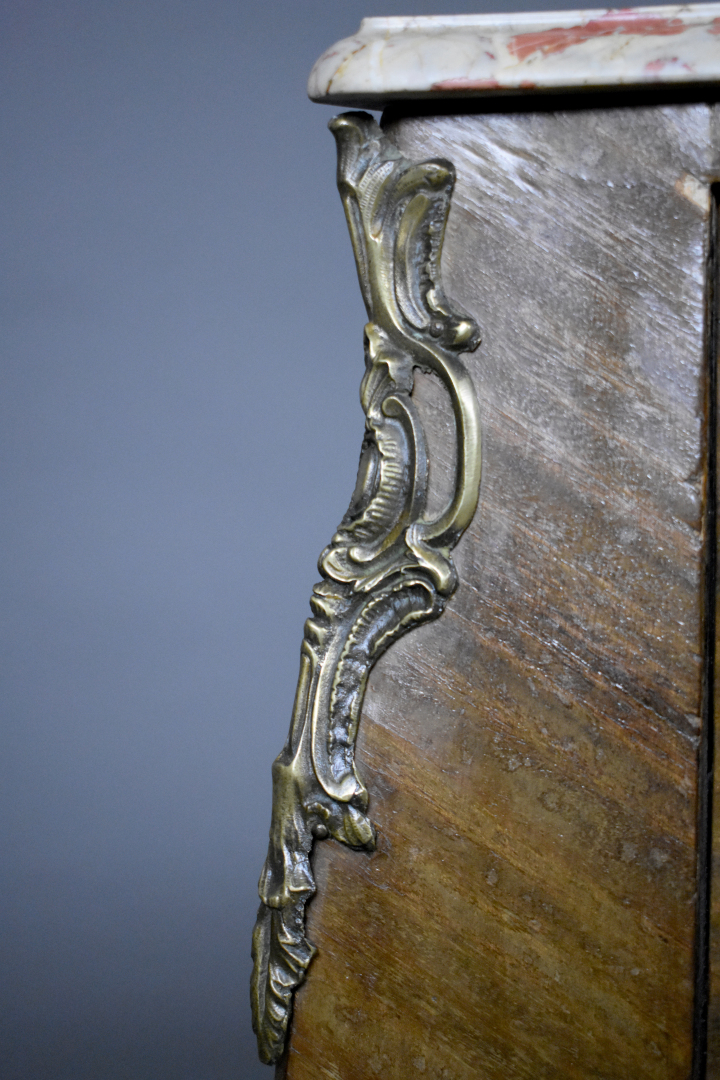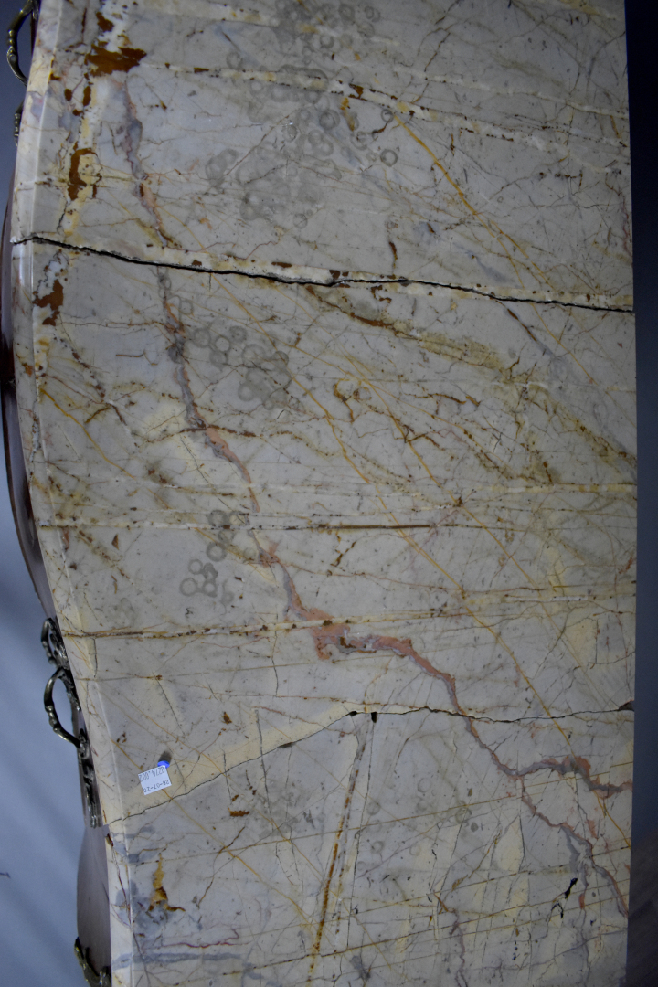 Commode à façade légèrement galbée en placage d’acajou, bois de rose et amarante (éclats, insolée). Elle ouvre à deux tiroirs et repose sur quatre pieds cambrés. Décor marqueté de fleurs. Ornementation de bronze ciselé telle que poignées de tirage et sabots. Plateau de marbre beige veiné rouge (accidenté en 3 parties).