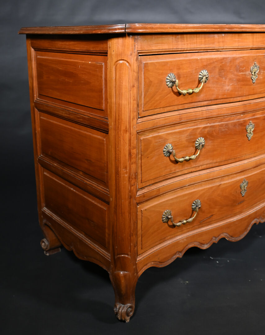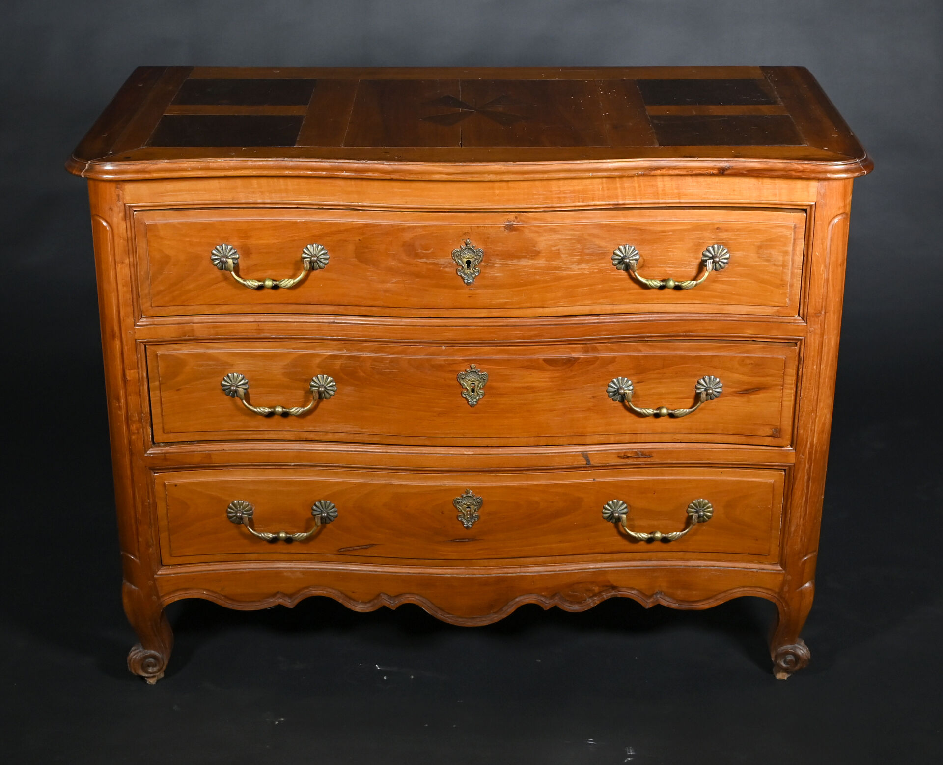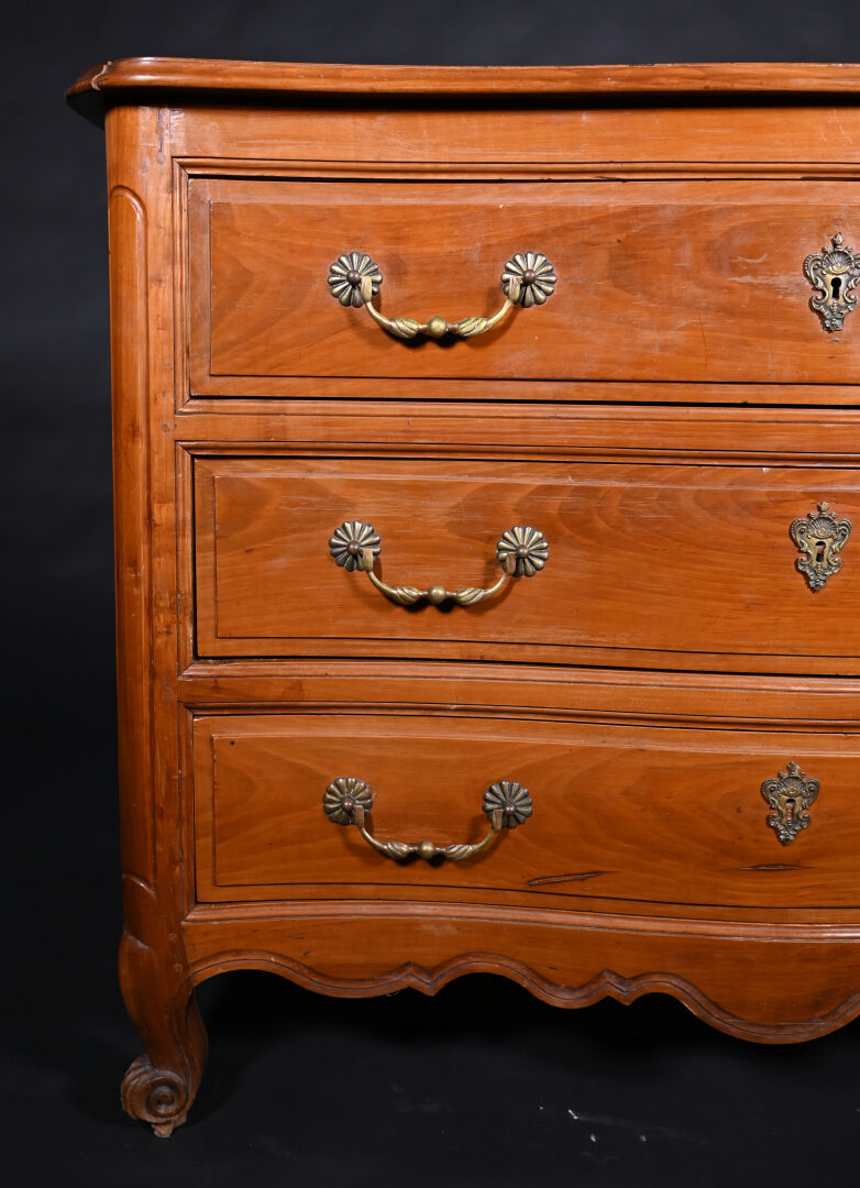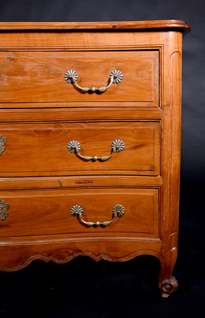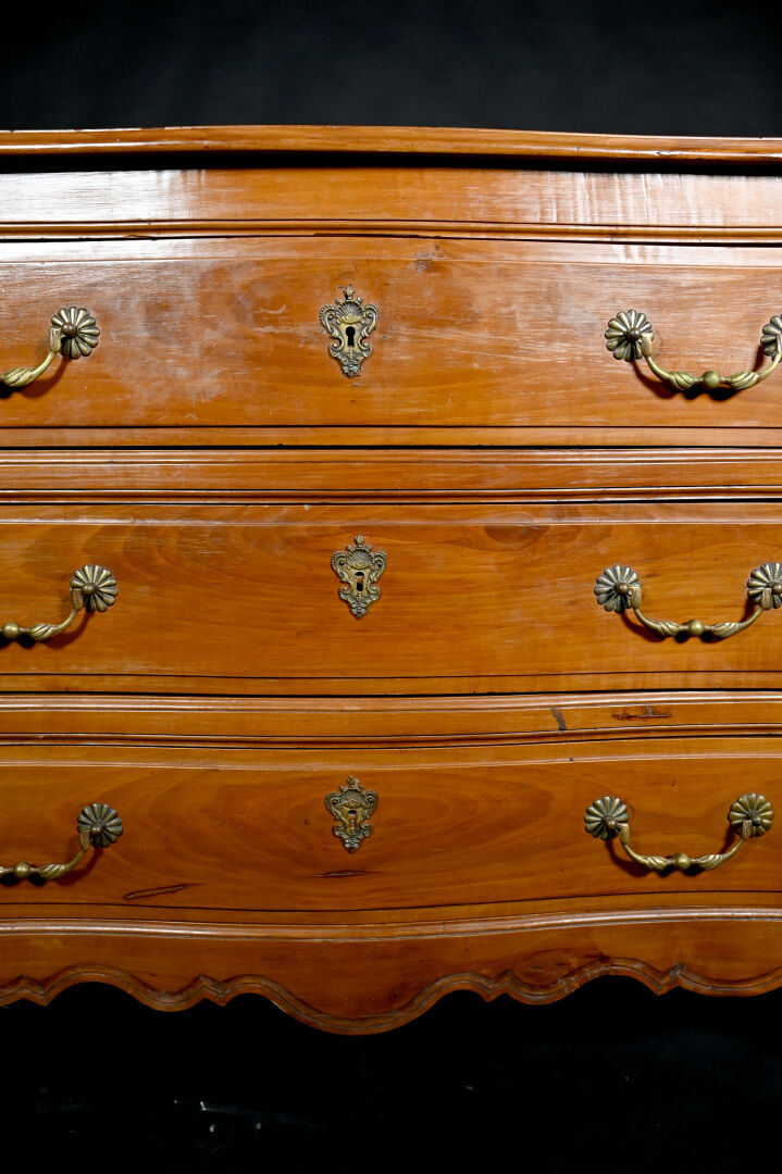 Commode à façade mouvementée en merisier mouluré, ouvrant par trois tiroirs sur trois rangs, montants antérieurs arrondis à pieds cambrés, le plateau marqueté d’une croix de Malte. Mains tombantes et entrées de serrure en bronze doré.