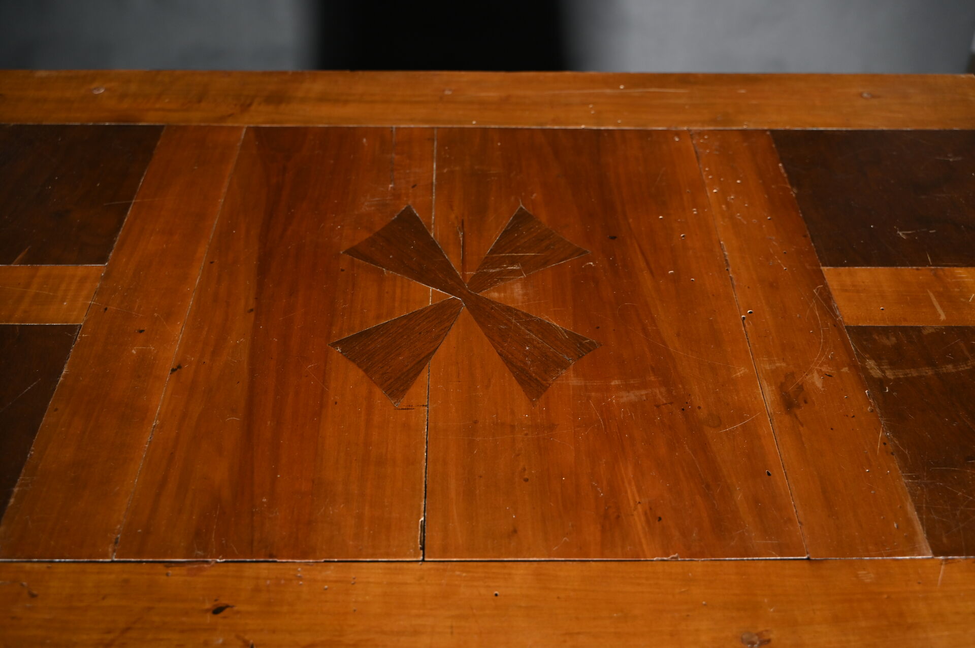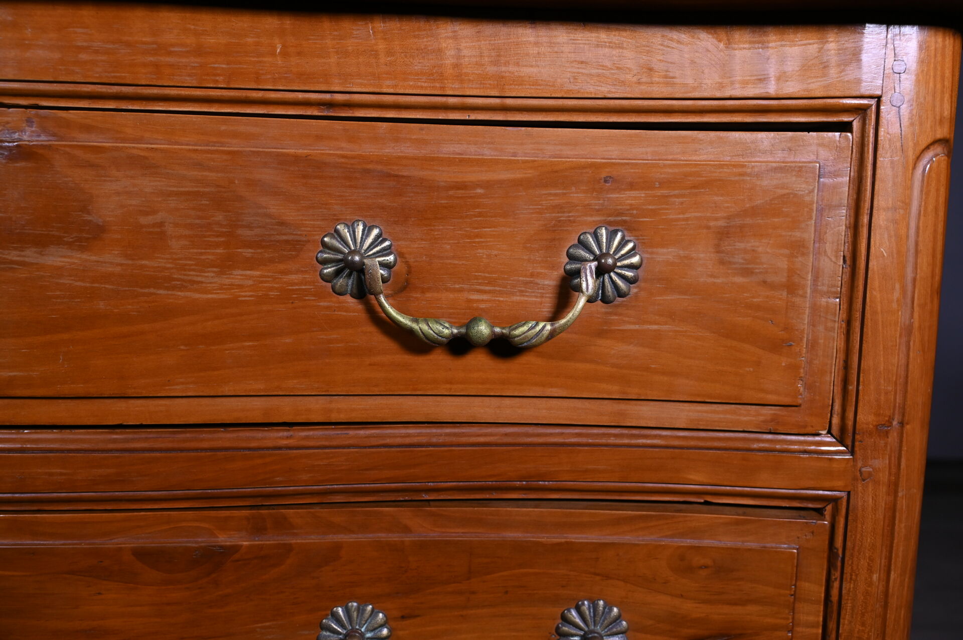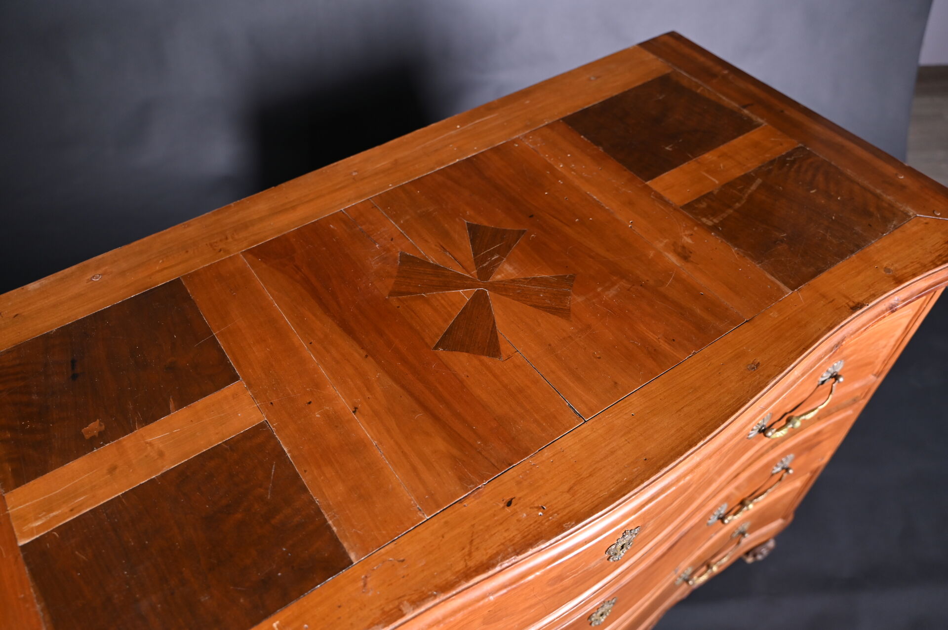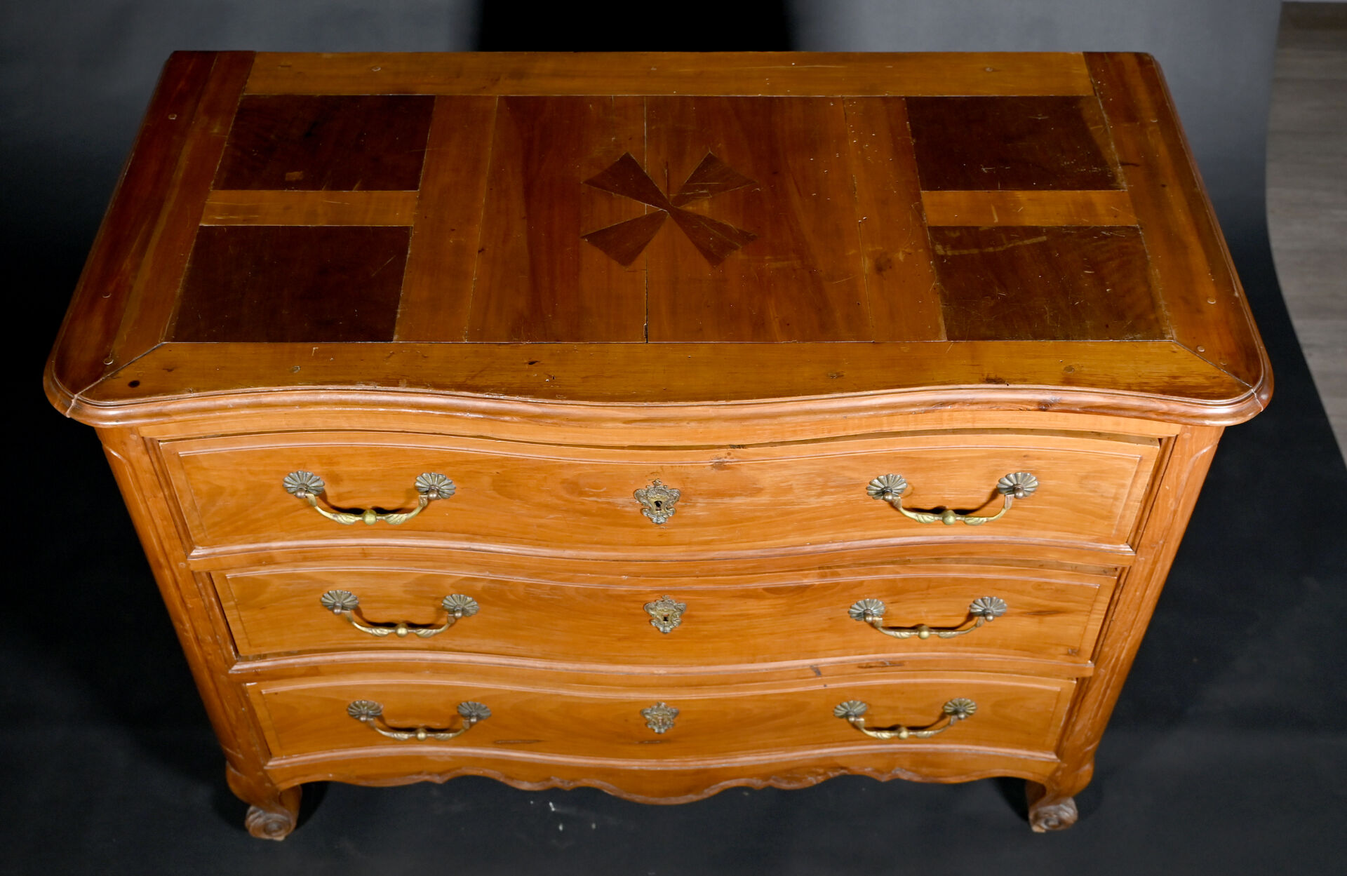 Commode à façade mouvementée en merisier mouluré, ouvrant par trois tiroirs sur trois rangs, montants antérieurs arrondis à pieds cambrés, le plateau marqueté d’une croix de Malte. Mains tombantes et entrées de serrure en bronze doré.