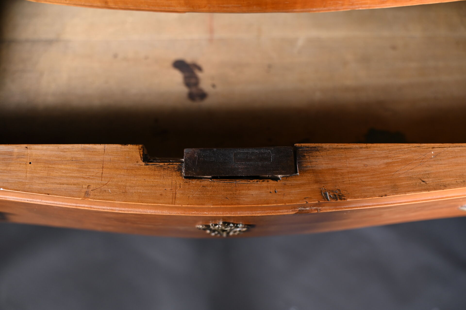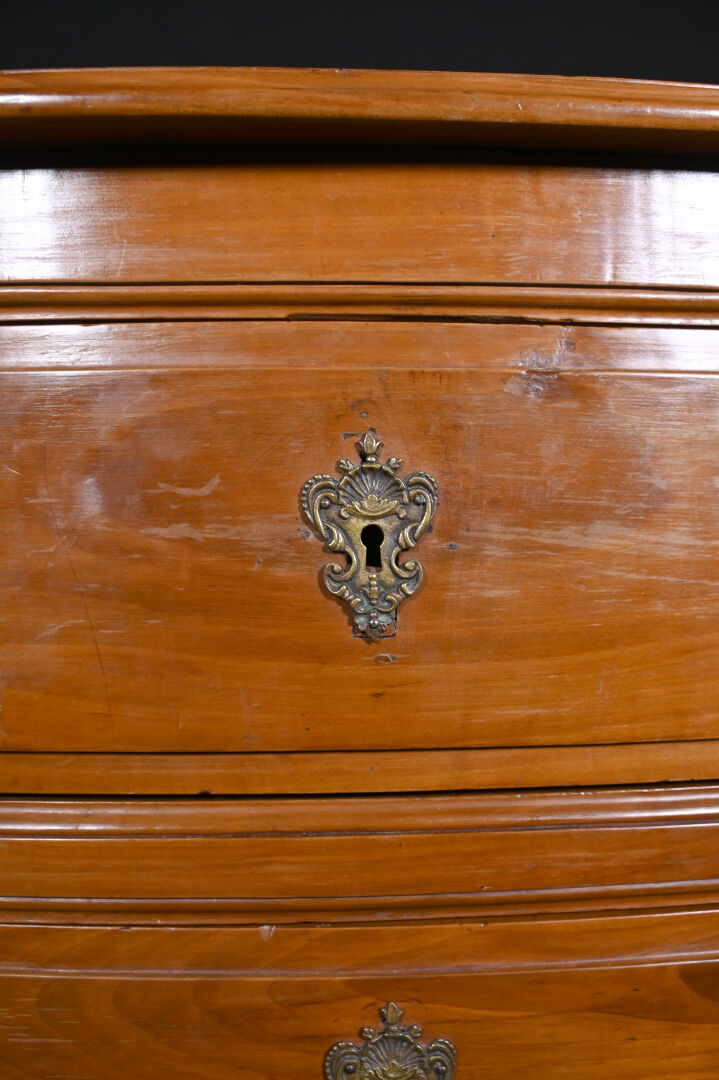 Commode à façade mouvementée en merisier mouluré, ouvrant par trois tiroirs sur trois rangs, montants antérieurs arrondis à pieds cambrés, le plateau marqueté d’une croix de Malte. Mains tombantes et entrées de serrure en bronze doré. Composée d’éléments anciens. 95 x 125 x 62 cm.