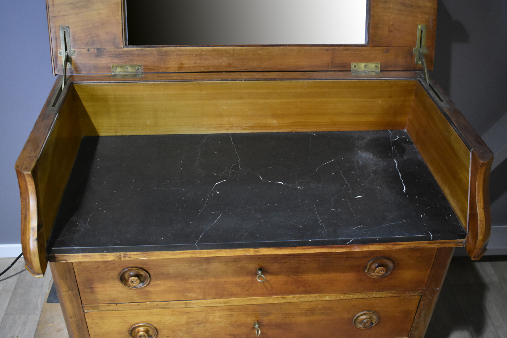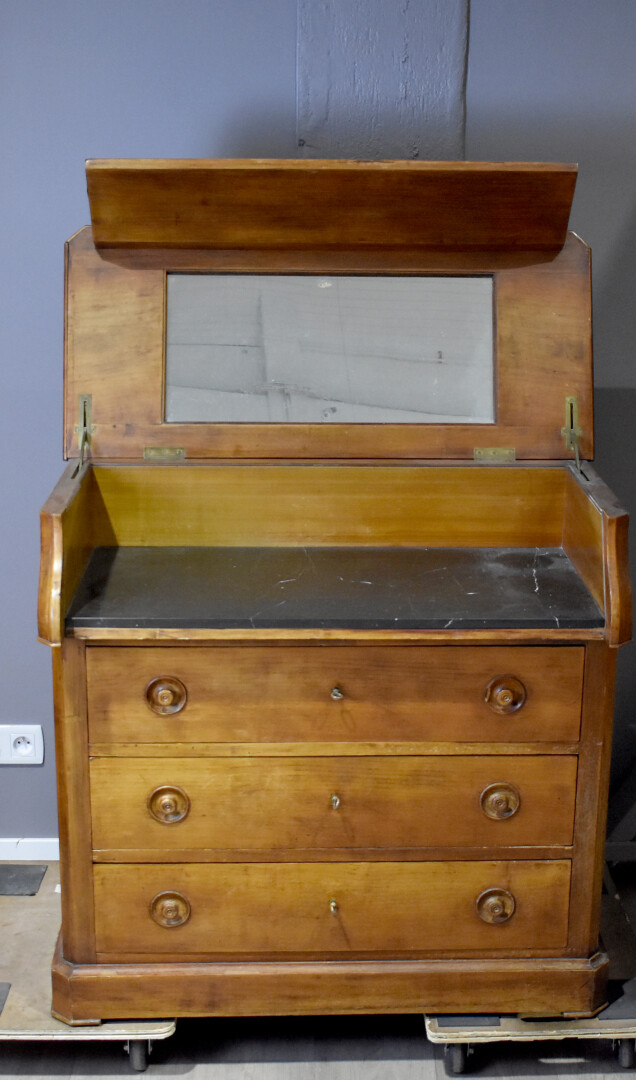 Commode de toilette en bois teinté. La partie haute ouvrant sur une niche à plateau de marbre noir, ceinte d’une glace.Elle ouvre à 3 tiroirs. Début du XXe siècle. Haut. : 88 cm – Larg. : 91 cm – Prof.: 47 cm.