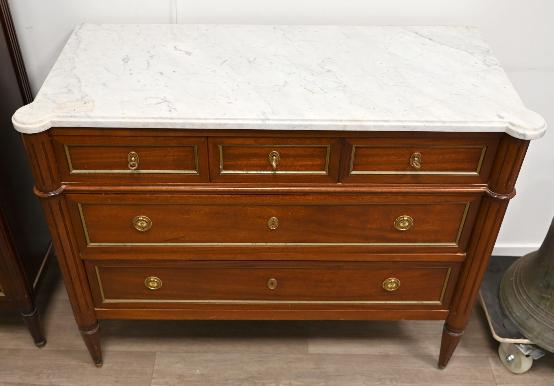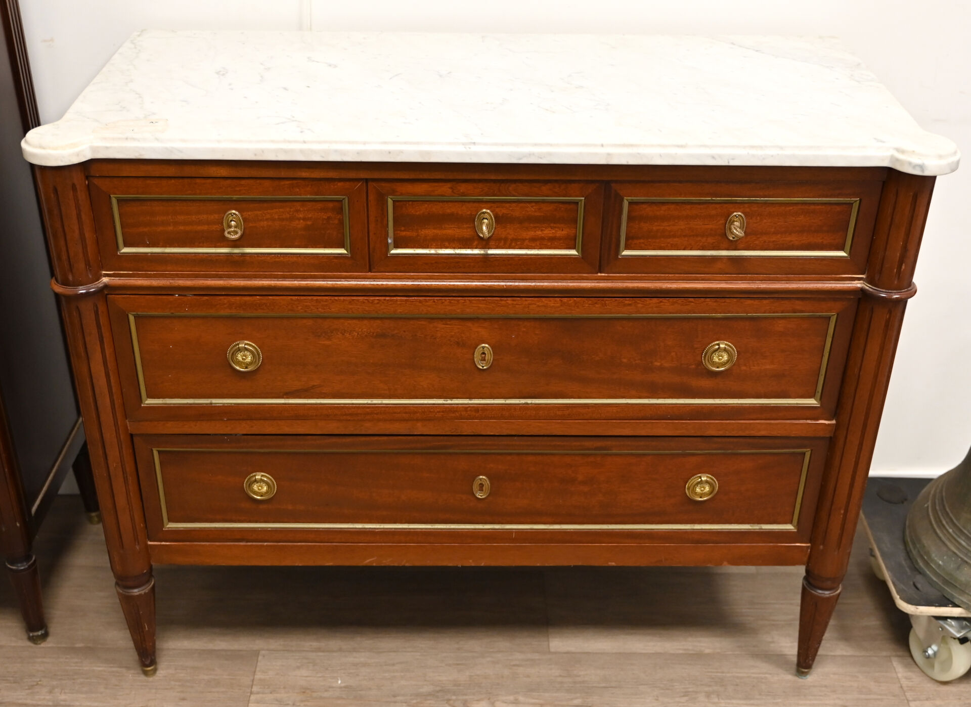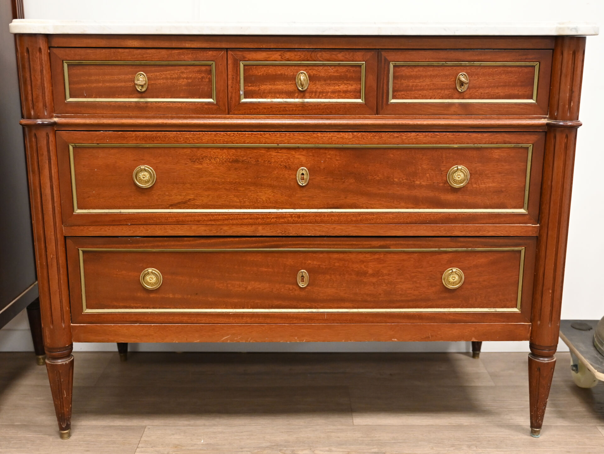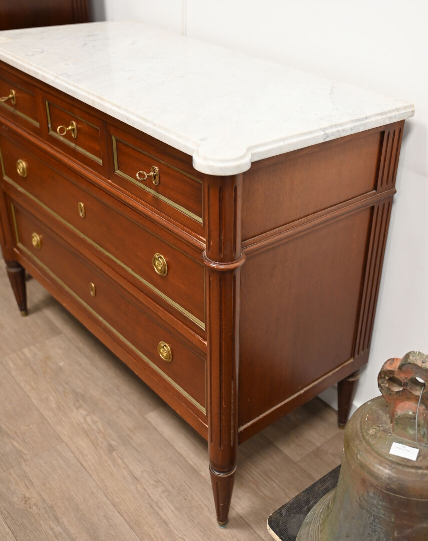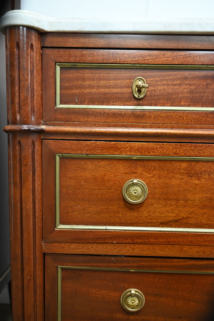 Commode en acajou et bois teinté ouvrant à 5 tiroirs sur 3 rangs, les montants à colonnes cannelées, les pieds fuselés cannelés. PLateau de marbre blanc veiné gris. STyle Louis XVI, XXe siècle. Hau: 86,5 cm – Larg. : 109,5 cm – Prof. : 49,5 cm.