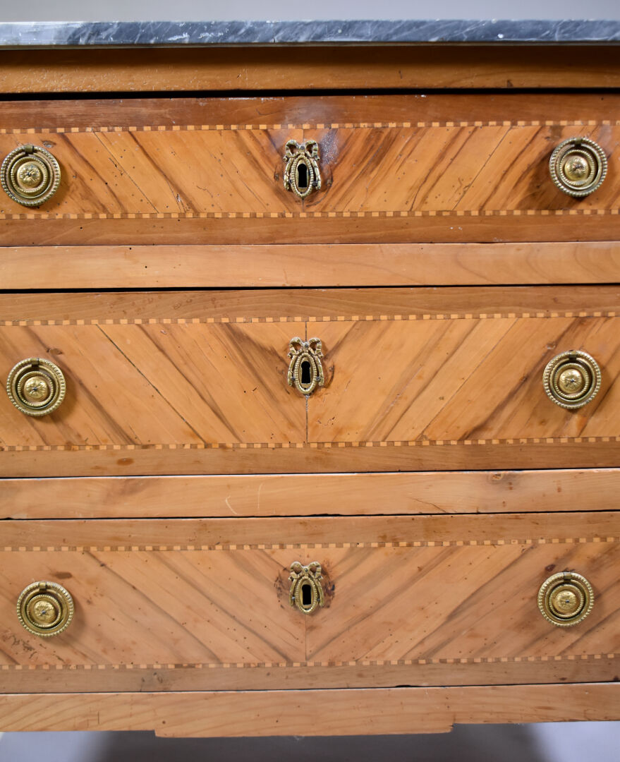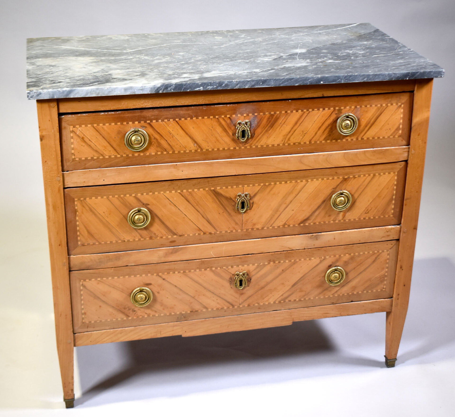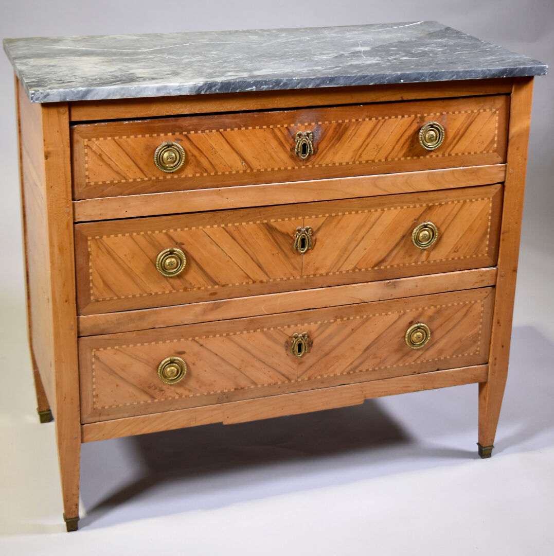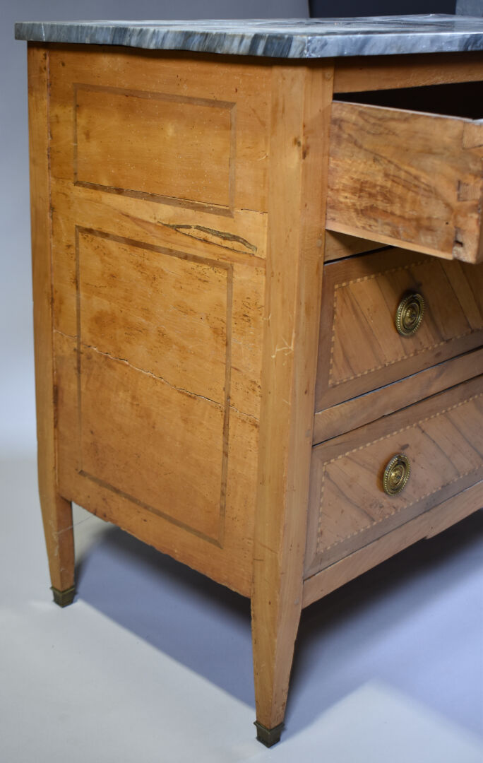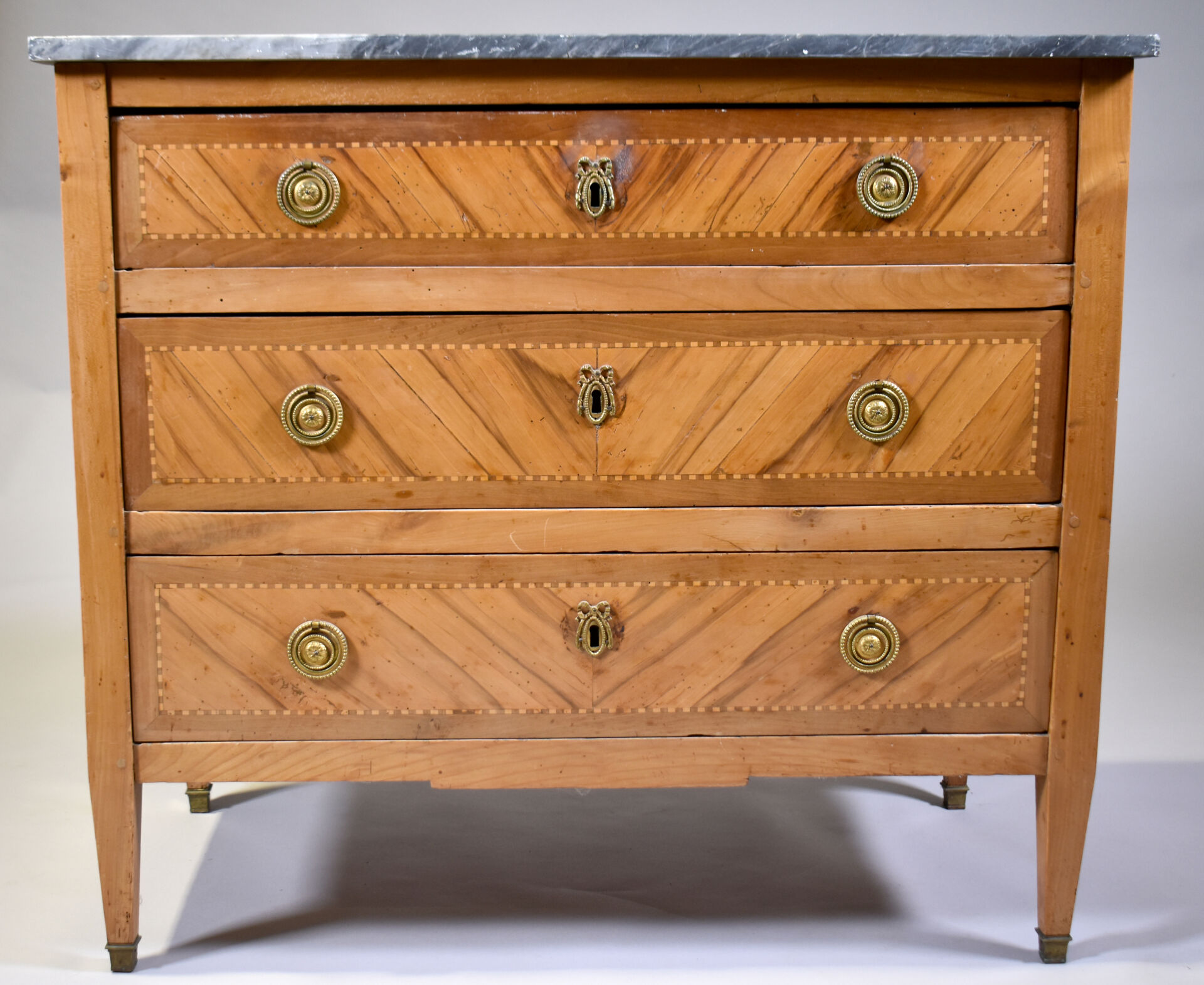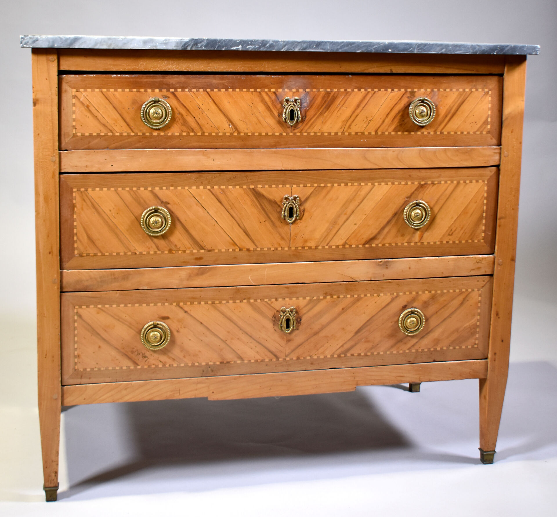 Commode en merisier et bois fruitier ouvrant à 3 tiroirs sur traverse. Pieds gaine terminés par des sabots. Plateau de marbre bleu turquin accidenté. Quelques éléments d’époque Louis XVI/Directoire. Haut. : 84 cm – Larg. : 94 cm – Prof. : 47,5 cm.