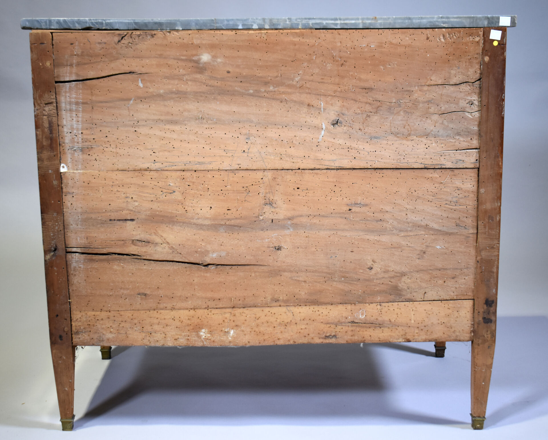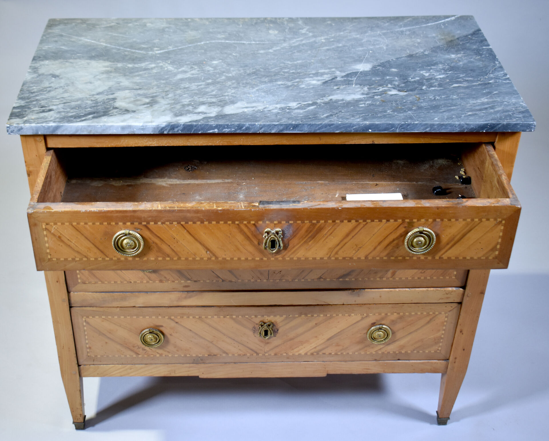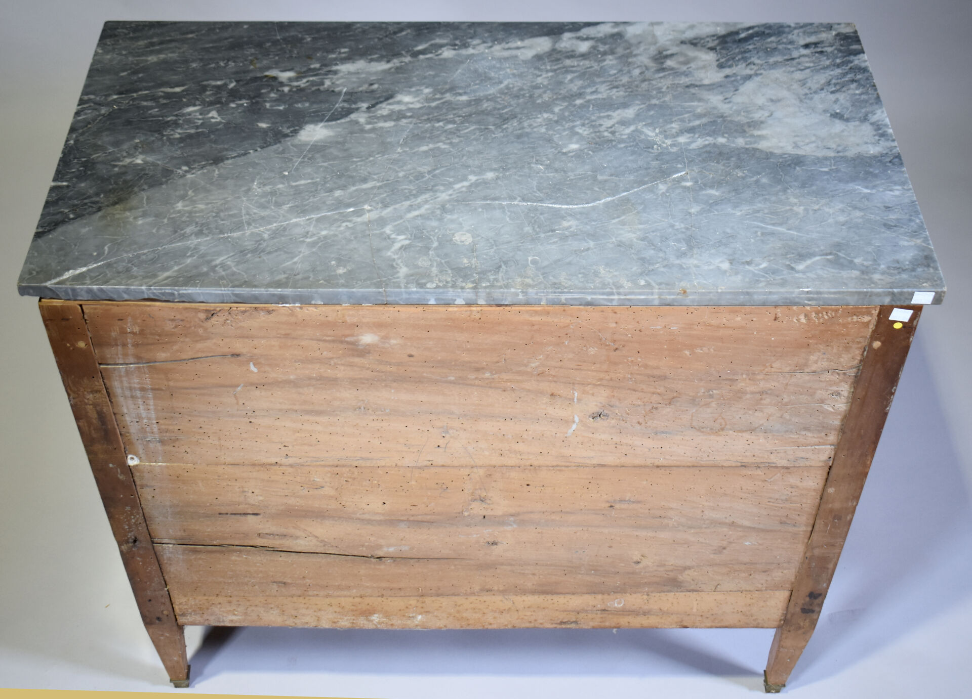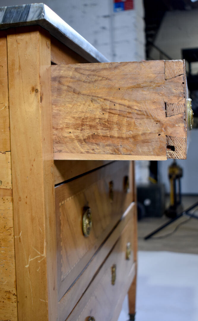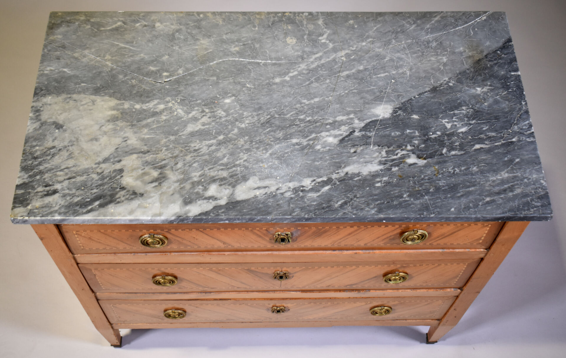 Commode en merisier et bois fruitier ouvrant à 3 tiroirs sur traverse. Pieds gaine terminés par des sabots. Plateau de marbre bleu turquin accidenté. Quelques éléments d’époque Louis XVI/Directoire. Haut. : 84 cm – Larg. : 94 cm – Prof. : 47,5 cm.