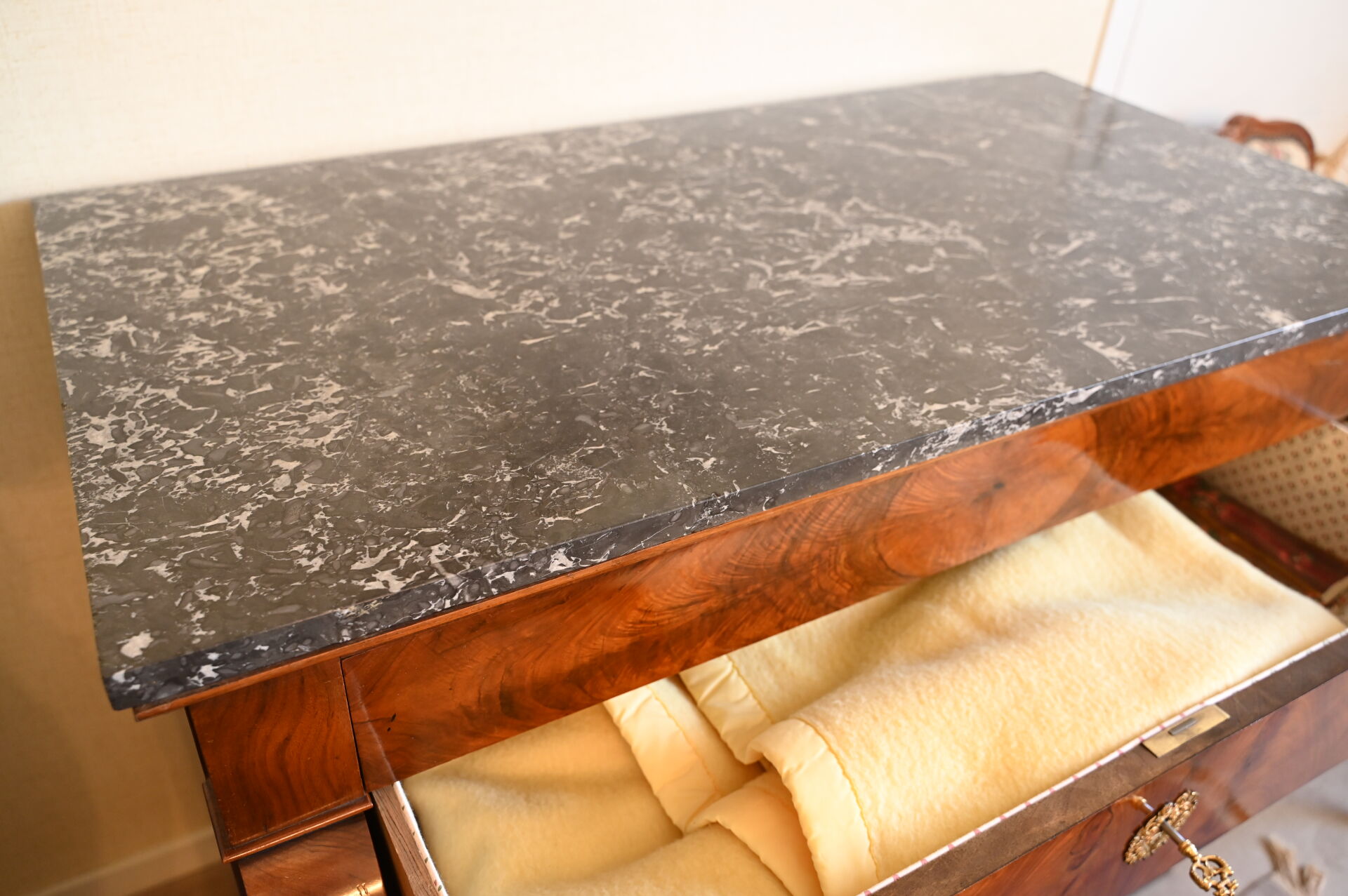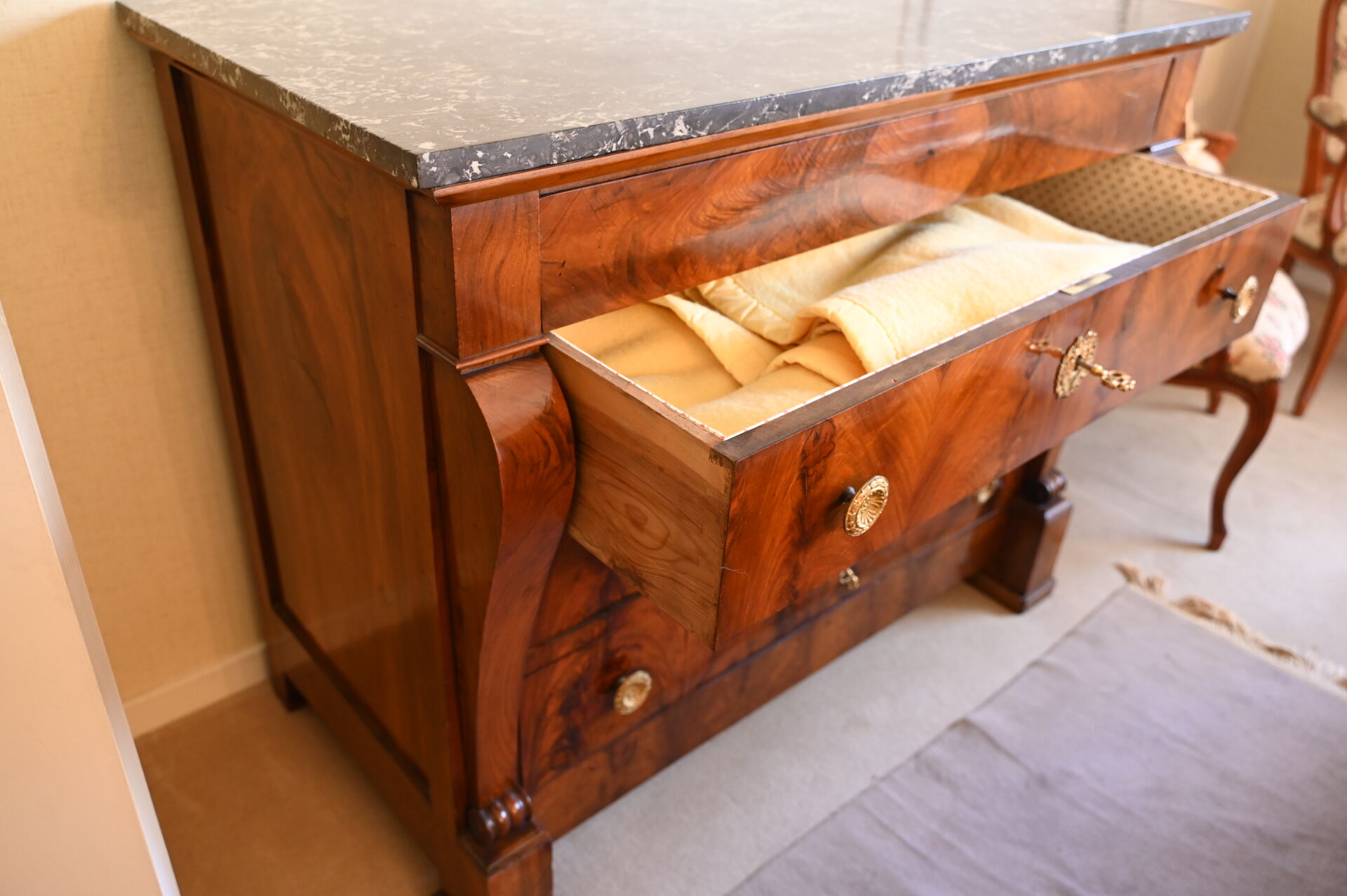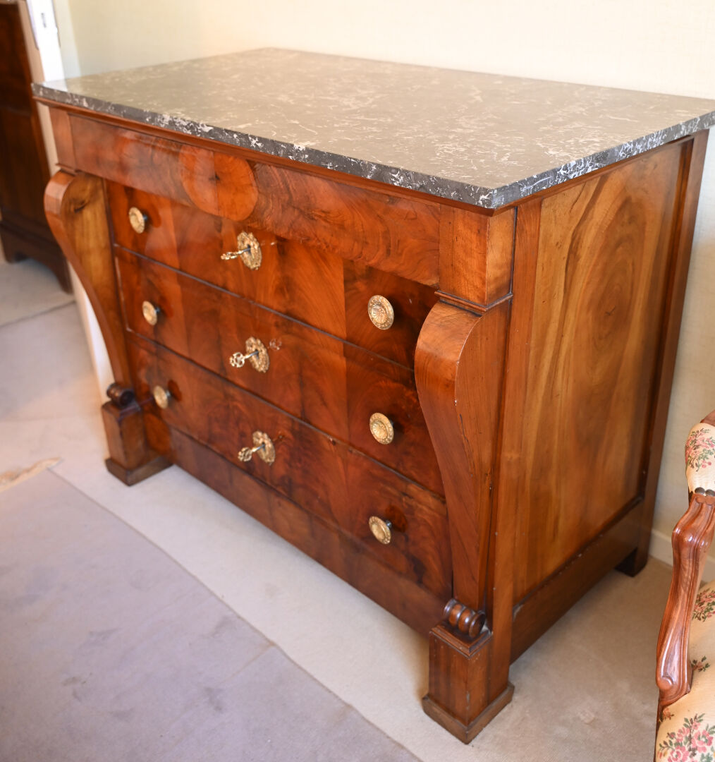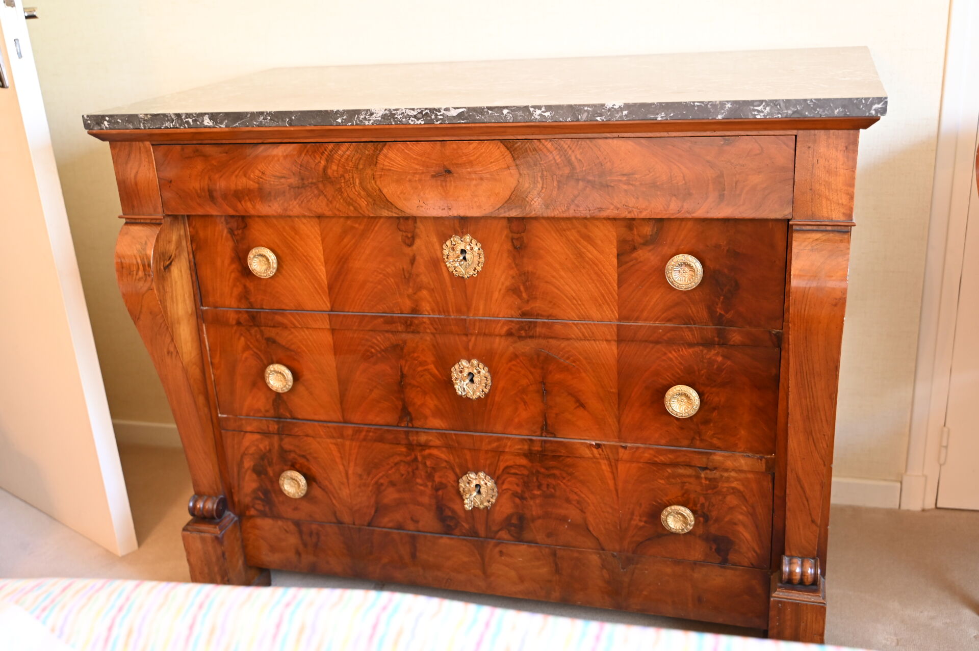 Commode en noyer et placage de noyer. Milieu du XIXe siècle. Usures d’usage. Haut. : 92 cm – Larg. : 114 cm – Prof. : 61 cm.