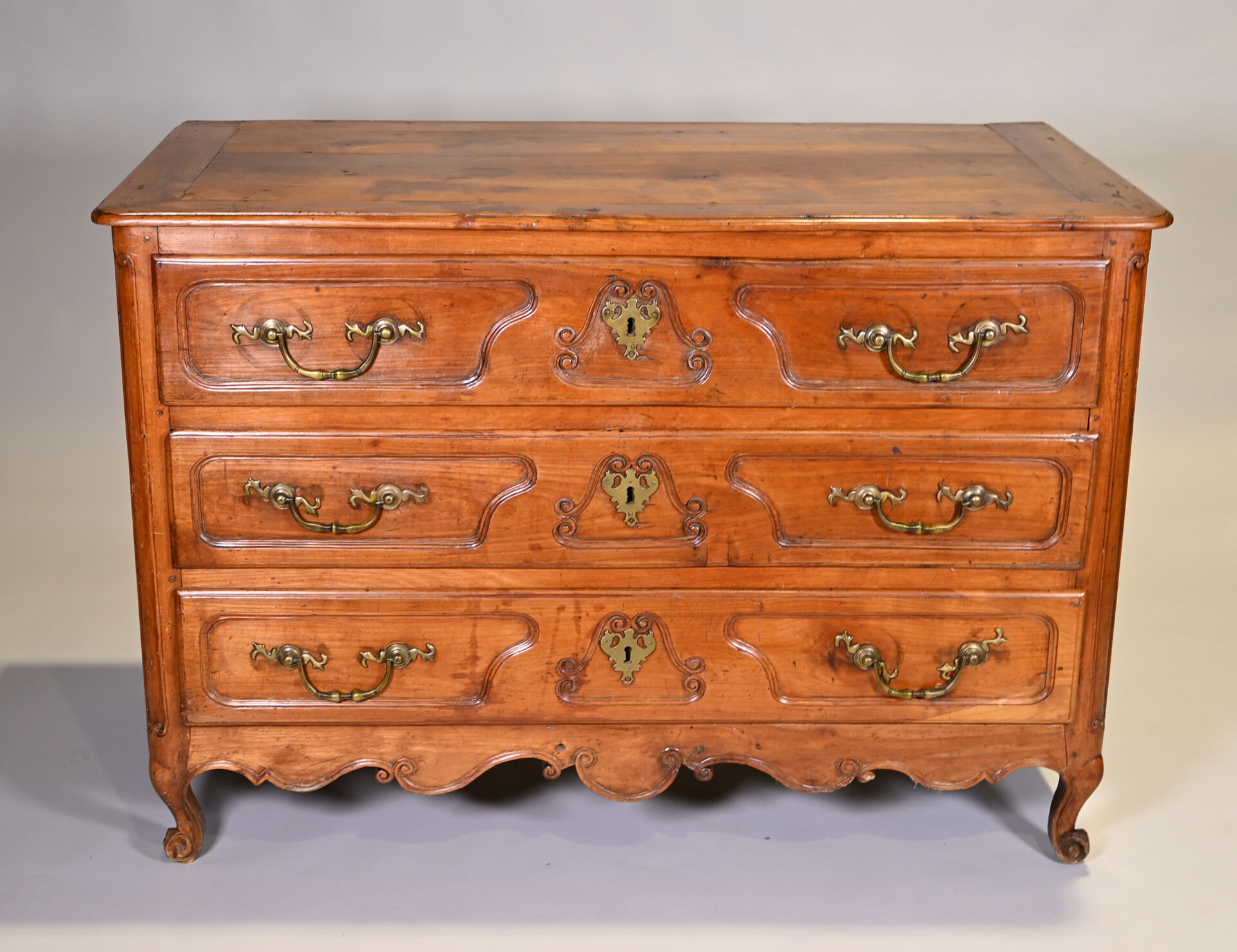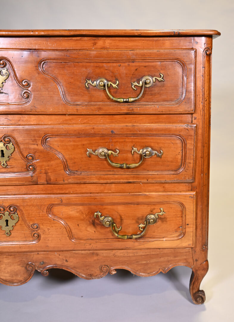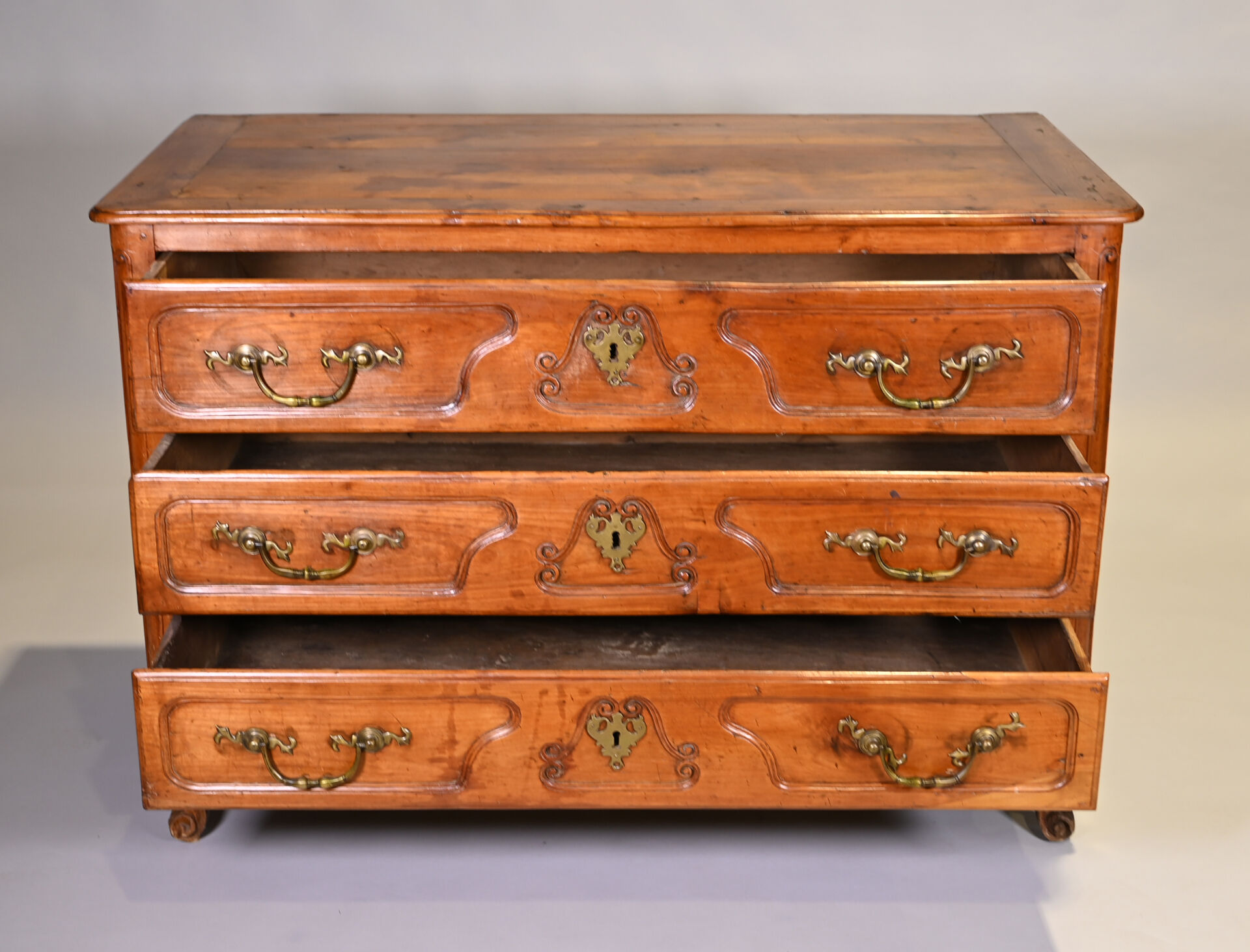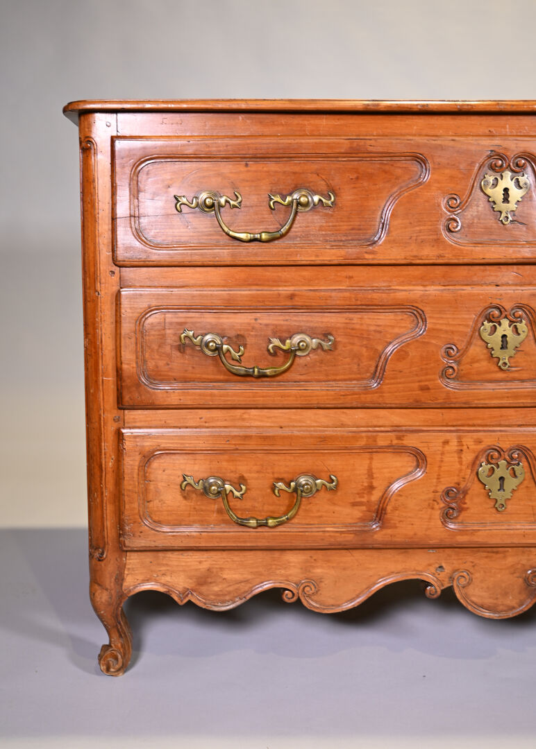 Commode en noyer mouluré ouvrant par trois tiroirs sur trois rangs, montants antérieurs arrondis reposant sur des pieds cambrés. Mains tombantes et entrées de serrure en laiton. Époque Louis XV. Accidents, fentes et restaurations. 88 x 128 x 66 cm.