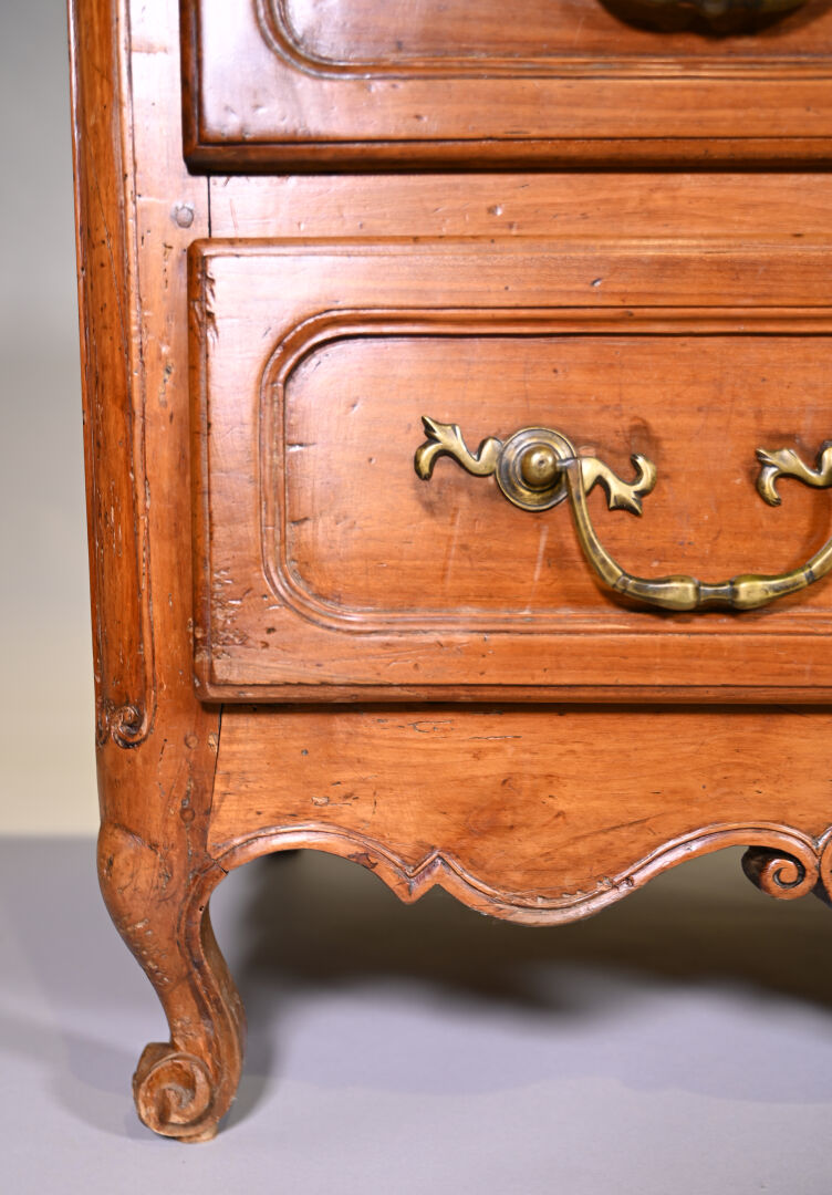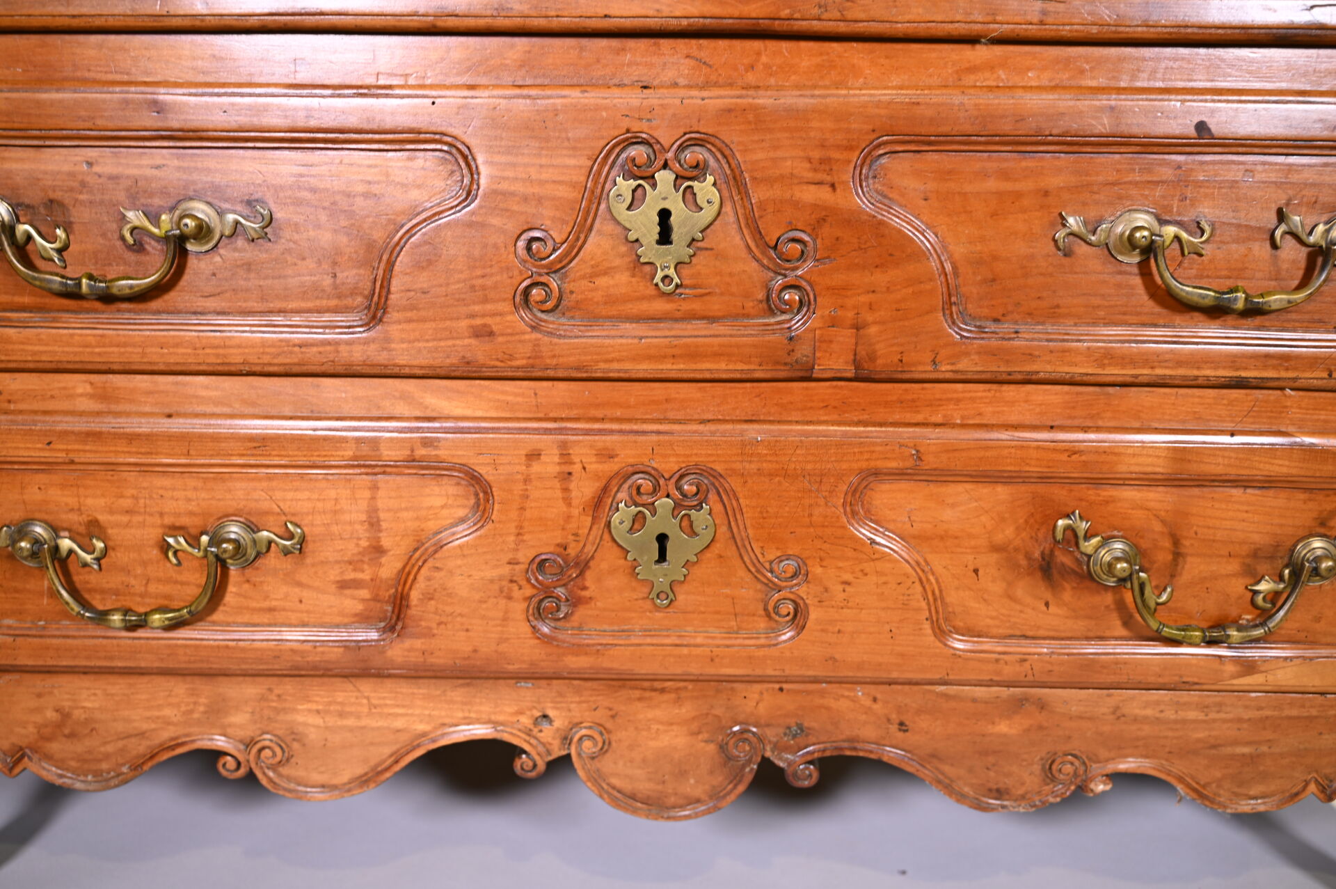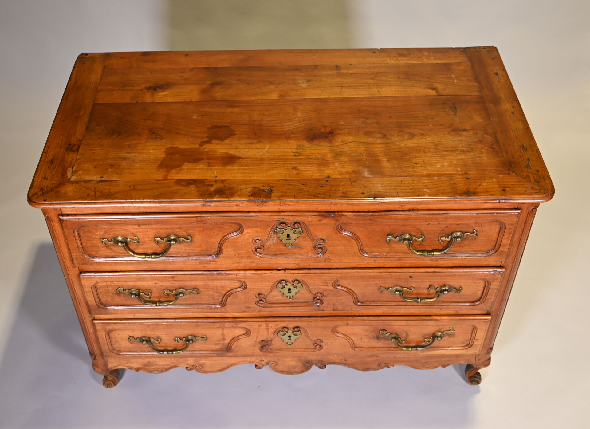 Commode en noyer mouluré ouvrant par trois tiroirs sur trois rangs, montants antérieurs arrondis reposant sur des pieds cambrés. Mains tombantes et entrées de serrure en laiton. Époque Louis XV. Accidents, fentes et restaurations. 88 x 128 x 66 cm.