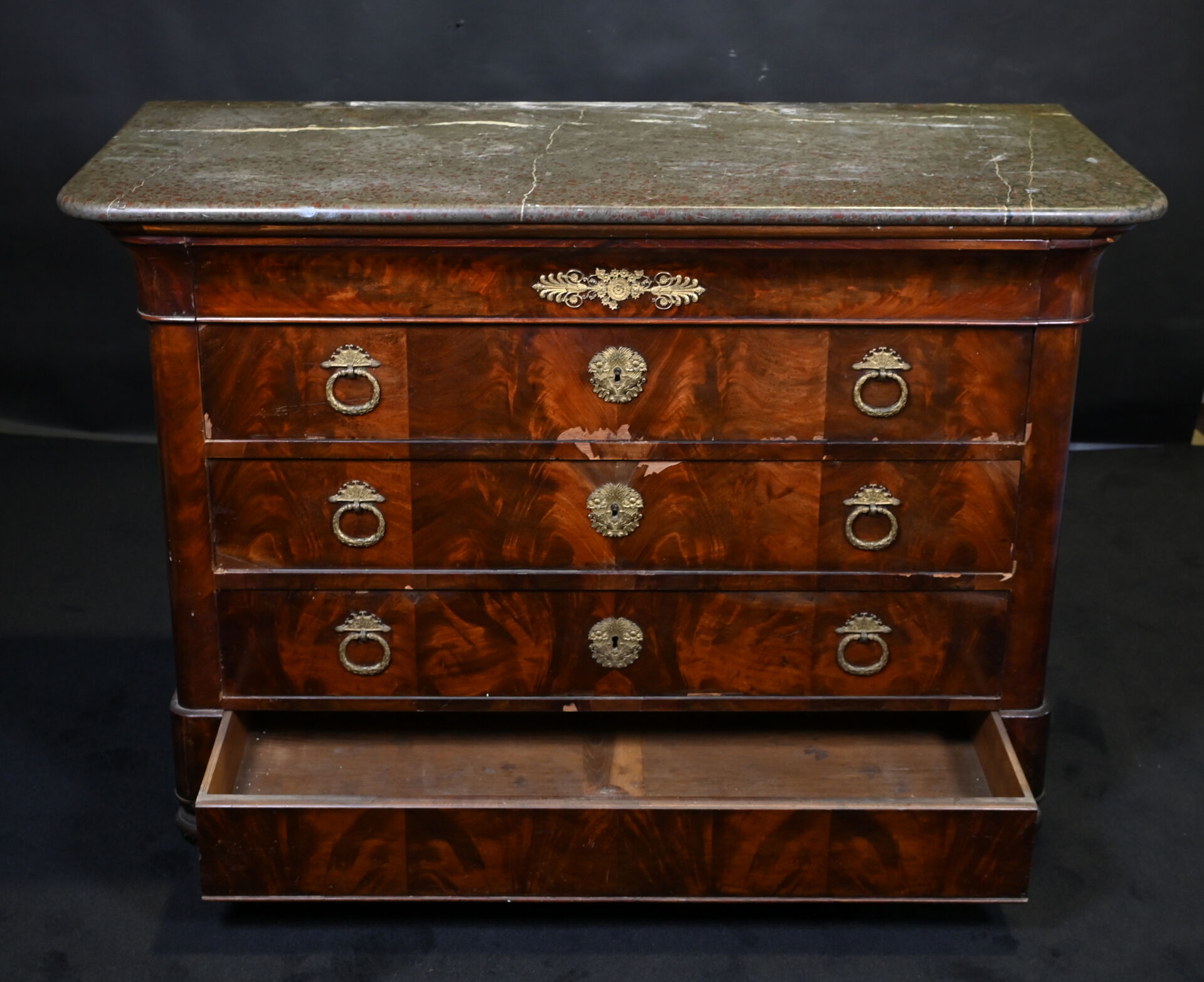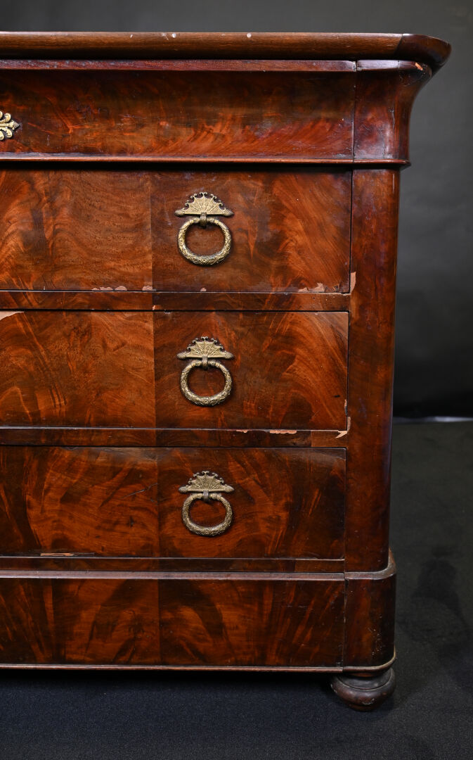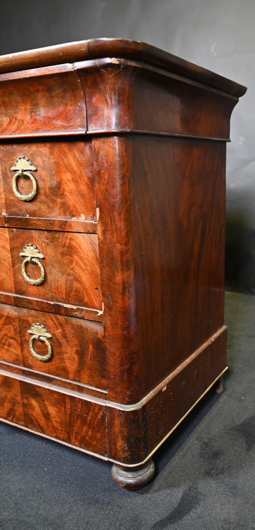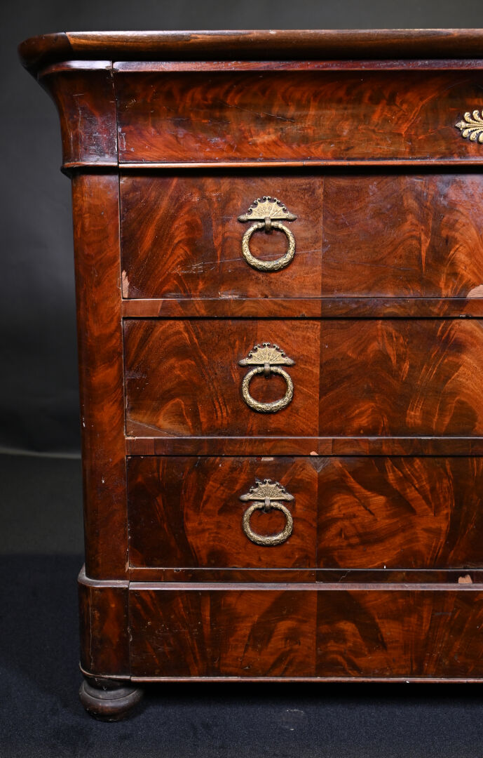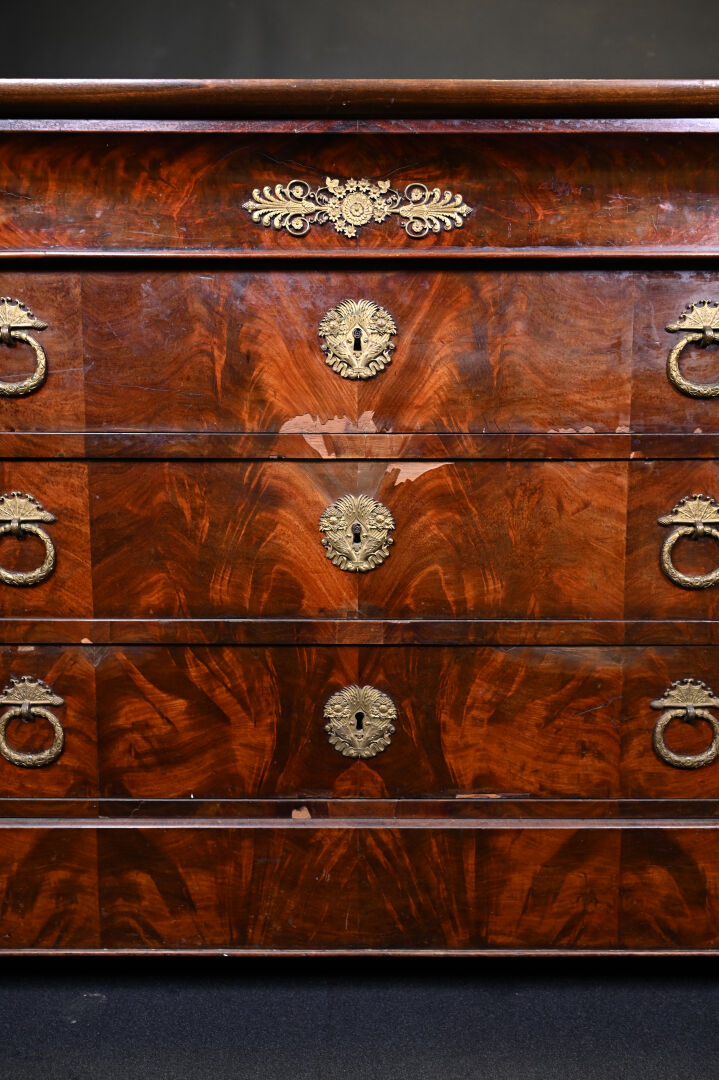 Commode en placage d’acajou ouvrant 3 tiroirs (éclats et manques). Plateau de marbre gris. Epoque milieu du XIXe siècle. Haut. : 94 cm – Larg. : 130 cm – Prof. : 57 cm.