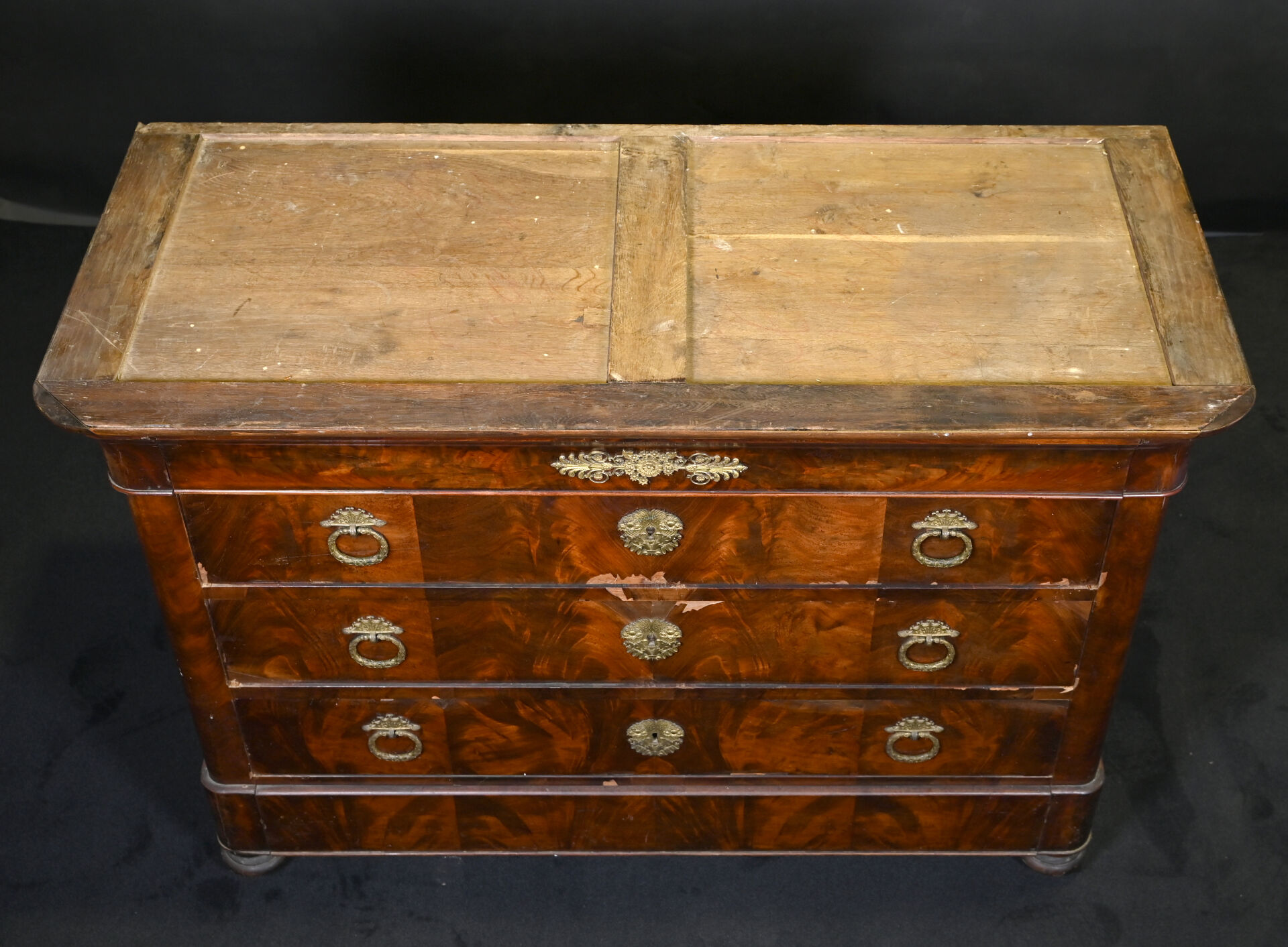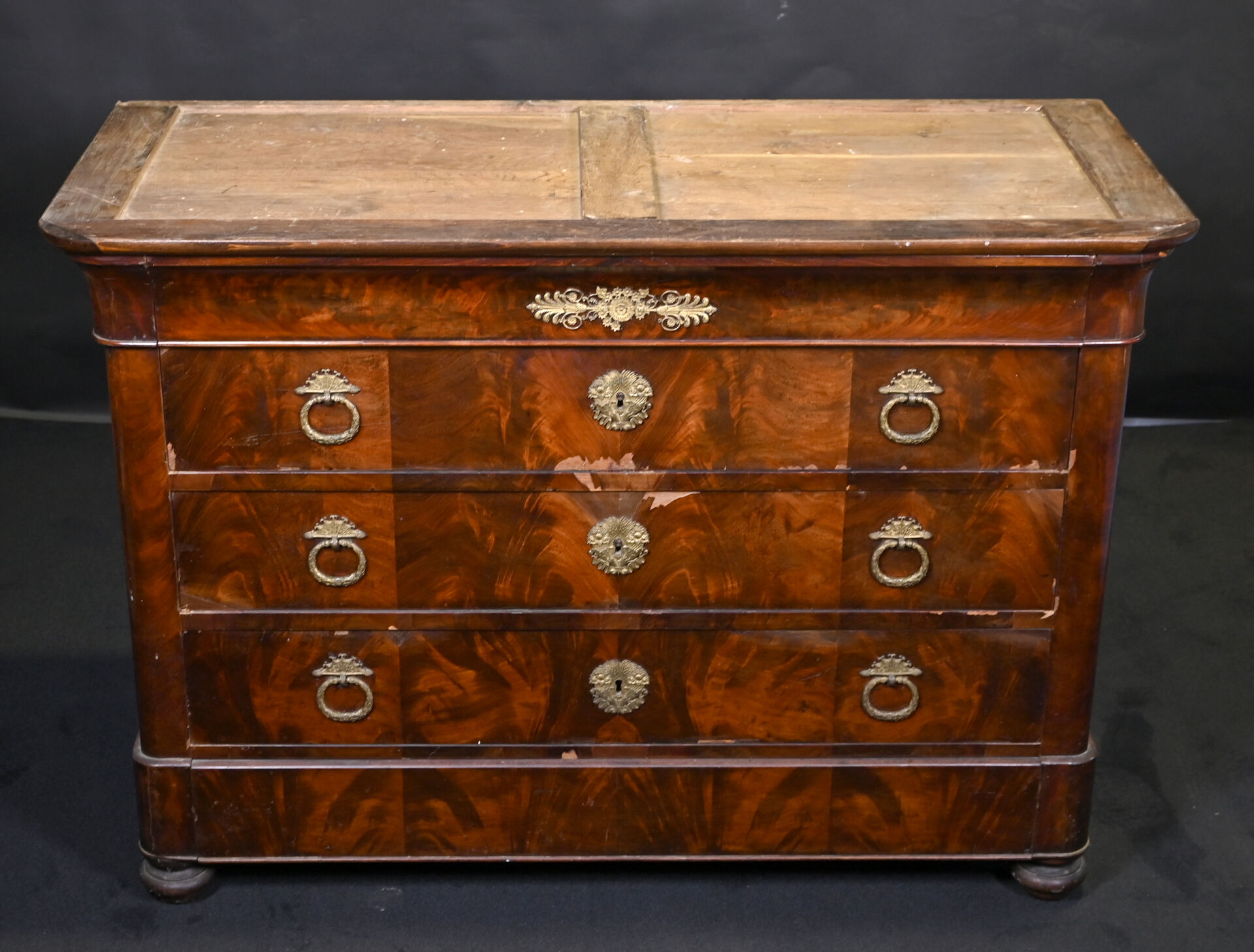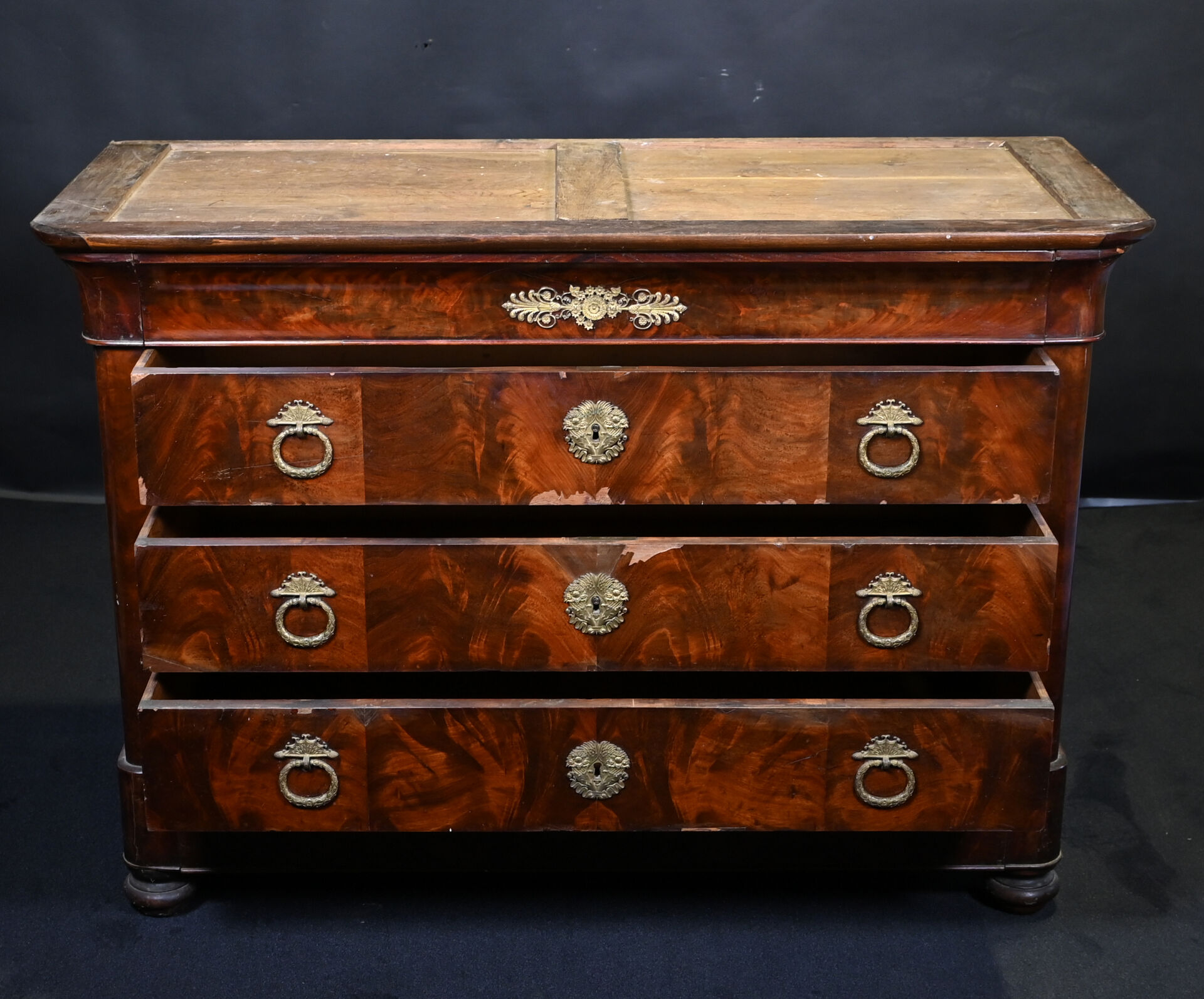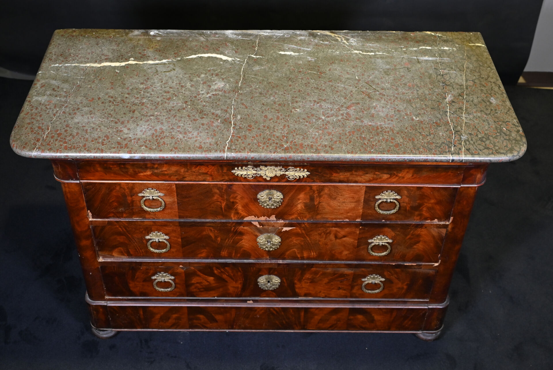 Commode en placage d’acajou ouvrant 3 tiroirs (éclats et manques). Plateau de marbre gris. Epoque milieu du XIXe siècle. Haut. : 94 cm – Larg. : 130 cm – Prof. : 57 cm.