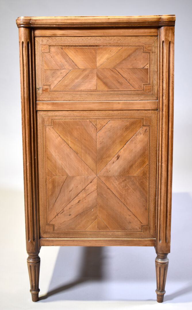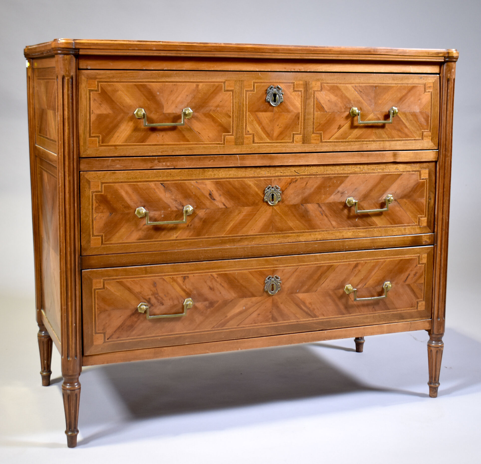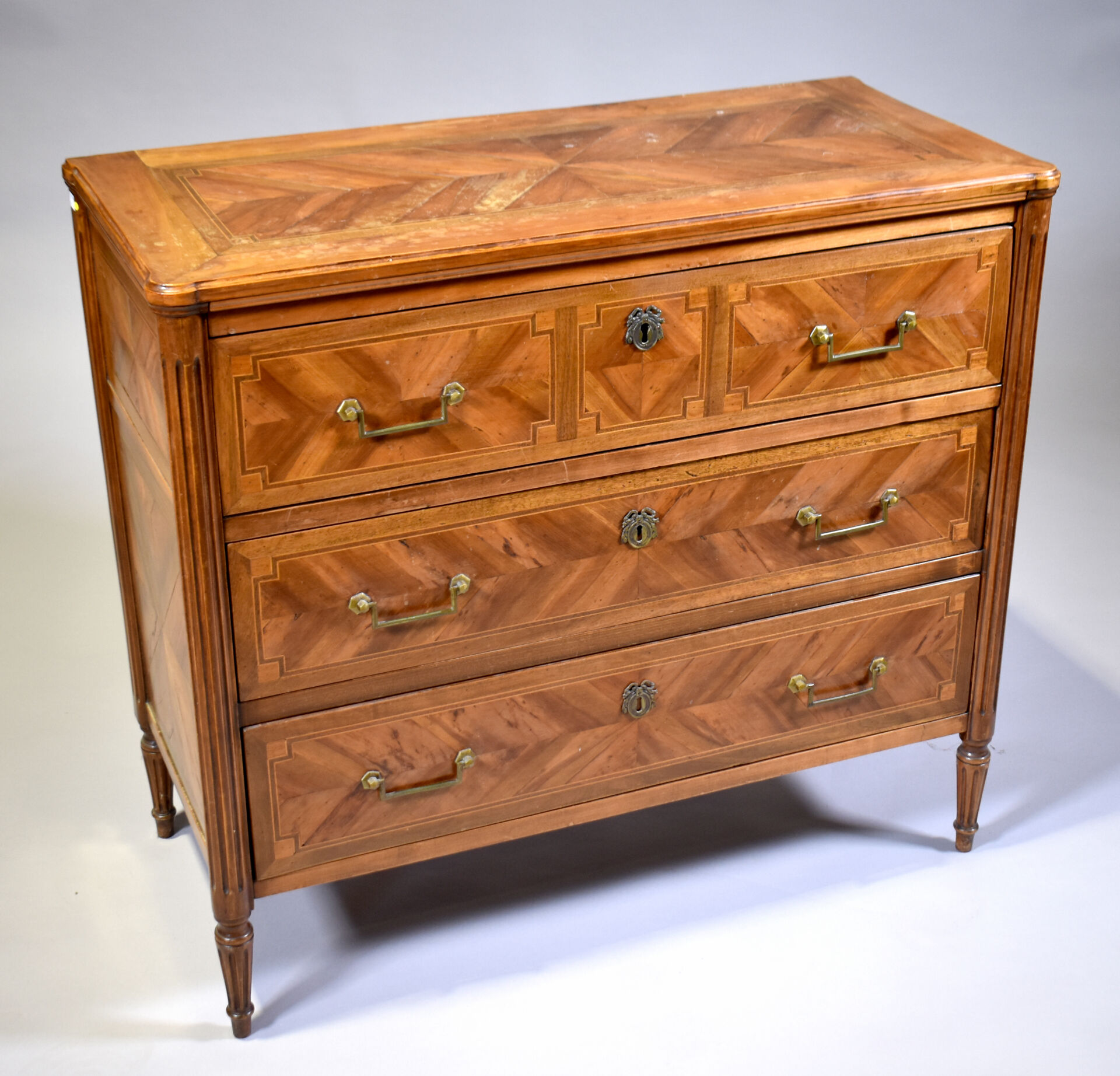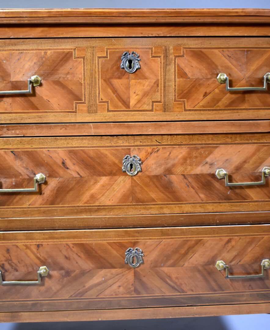 Commode en placage de merisier, noyer sur un bâti en chêne, ouvrant à 3 tiroirs sur traverse, les montants cannelés, les pieds fuselés cannelés (mouillures sur le plateau). Style Louis XVI. Haut. : 85,5 cm – Larg. : 95 cm – Prof. : 44 cm.