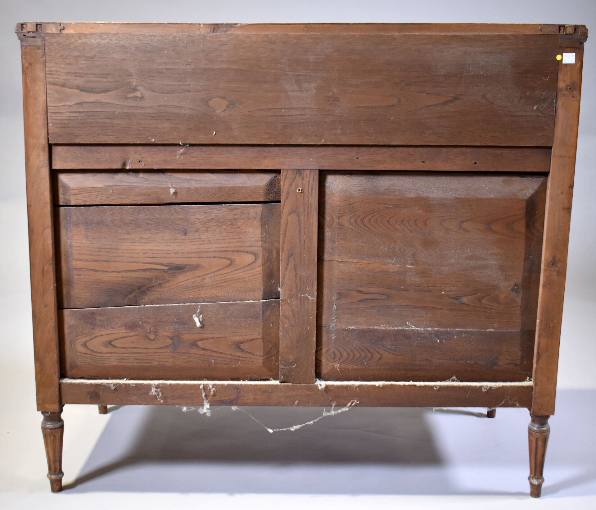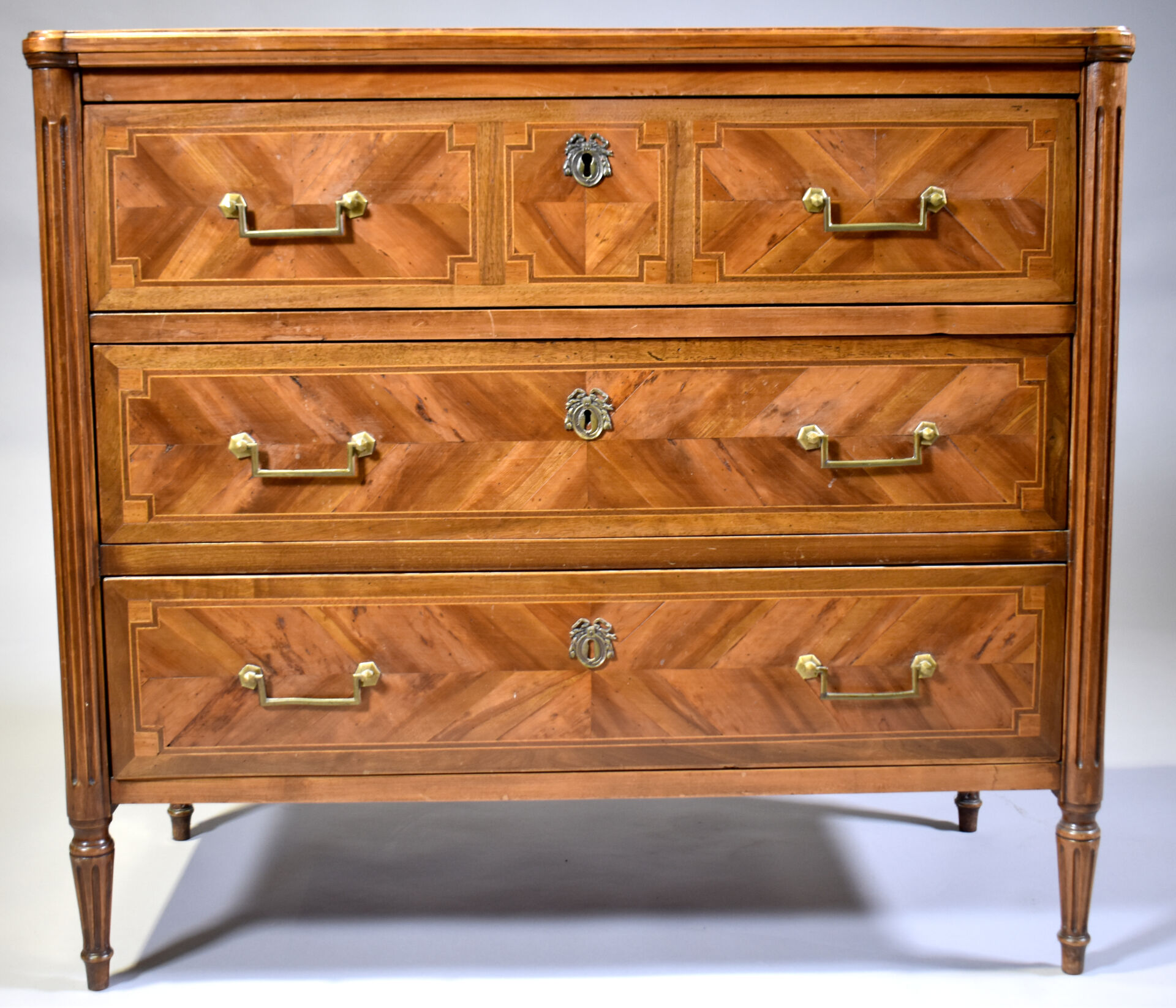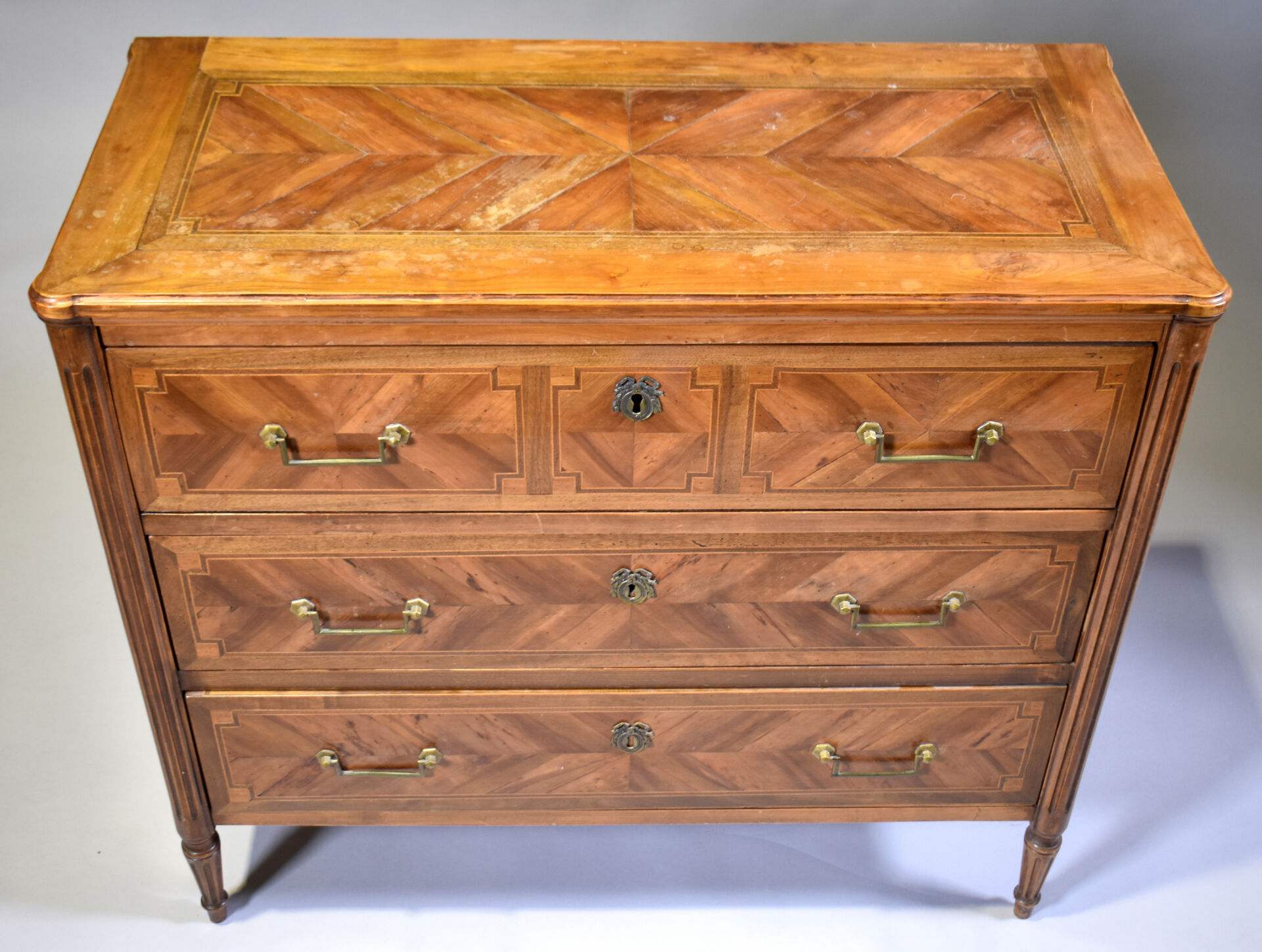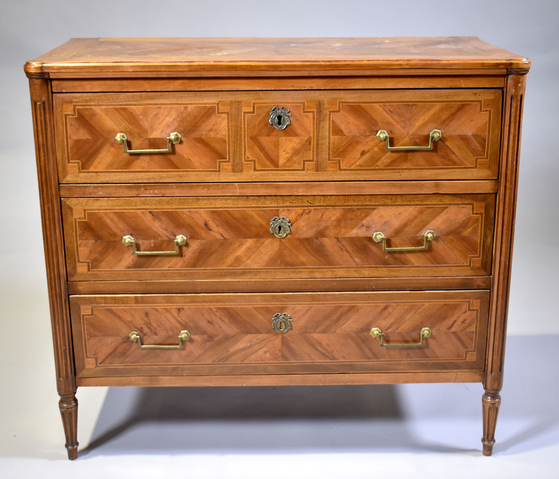 Commode en placage de merisier, noyer sur un bâti en chêne, ouvrant à 3 tiroirs sur traverse, les montants cannelés, les pieds fuselés cannelés (mouillures sur le plateau). Style Louis XVI. Haut. : 85,5 cm – Larg. : 95 cm – Prof. : 44 cm.