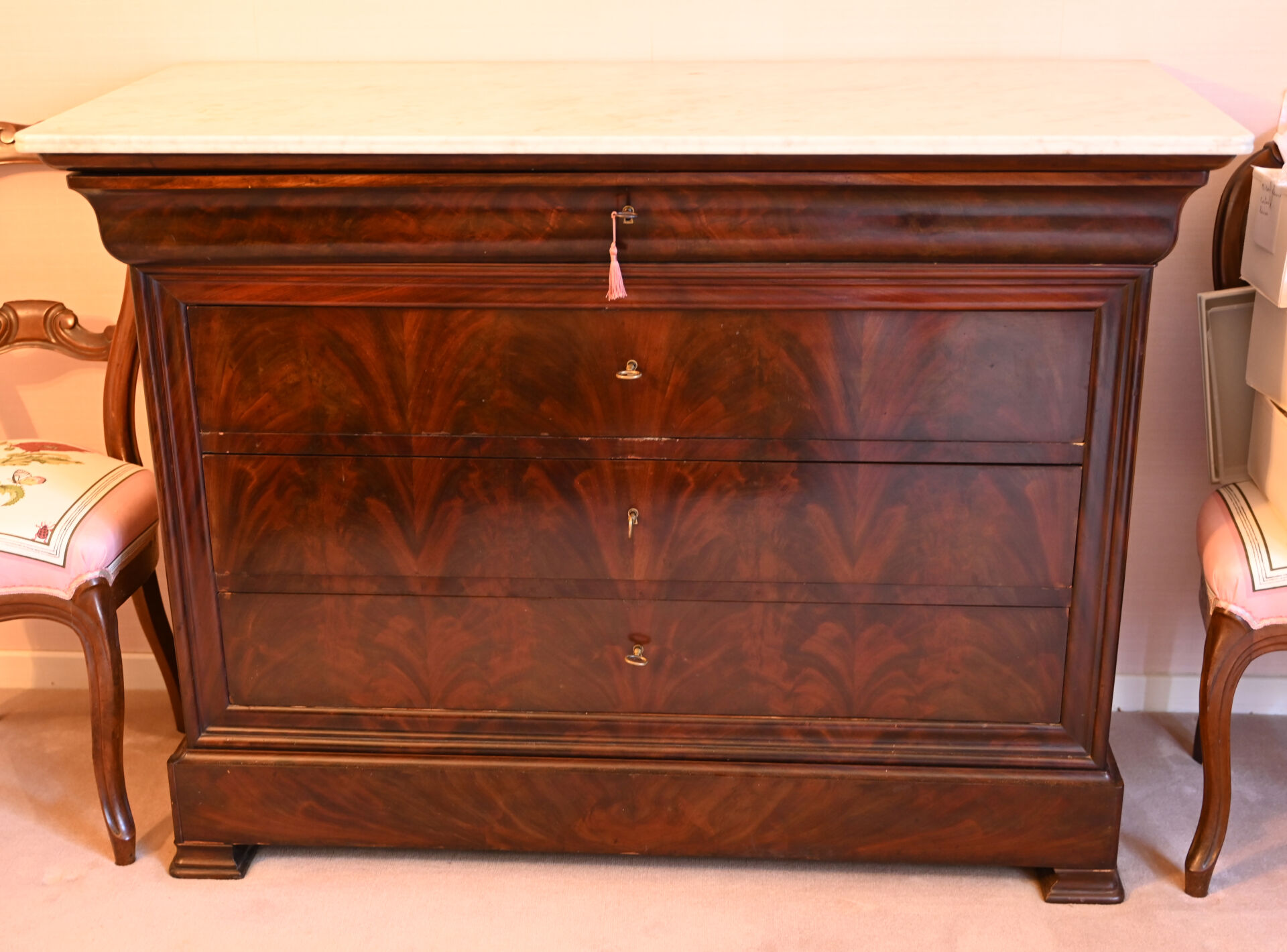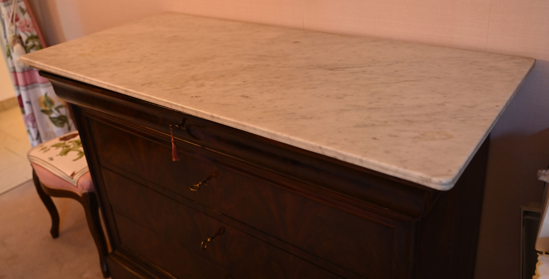 Commode. Plateau de marbre blanc. XIXe siècle. Usures d’usage. Haut. : 94,5 cm – Larg. : 130 cm – Prof. : 58 cm.