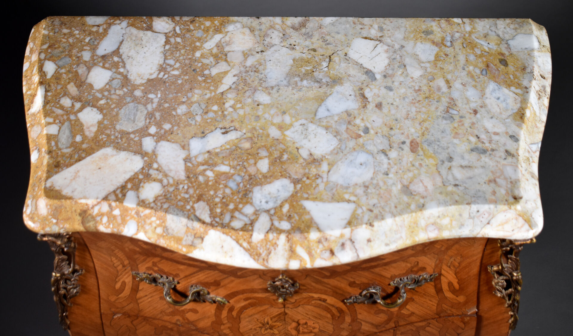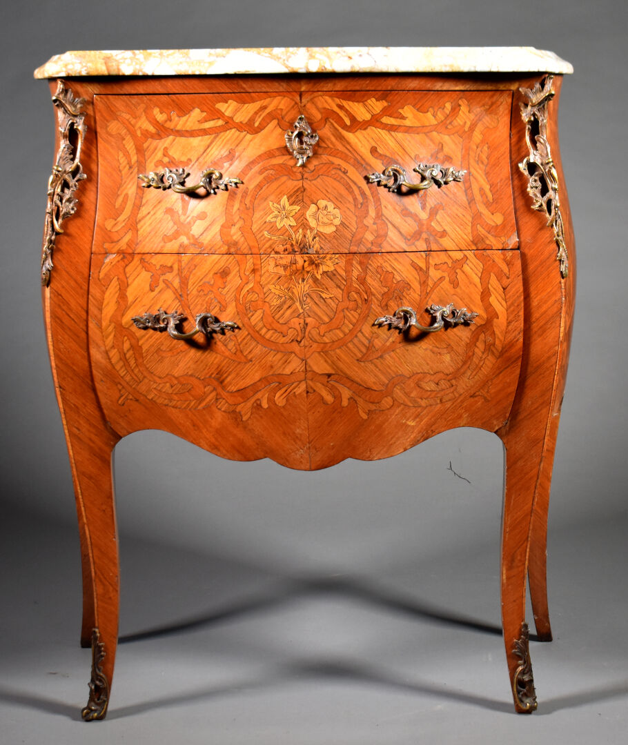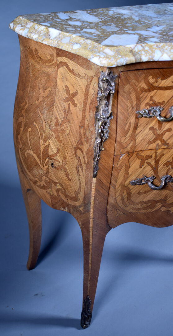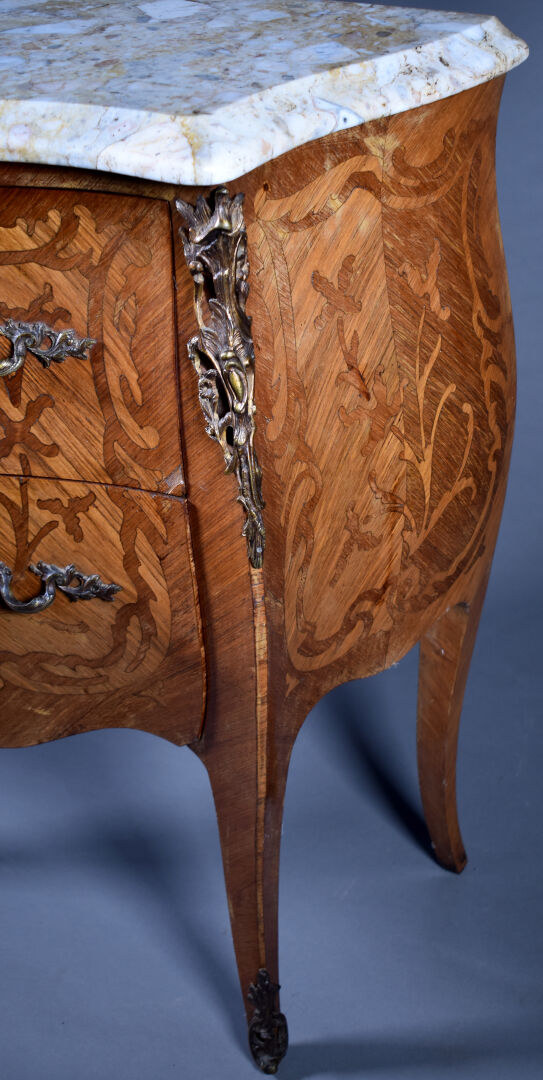 Commode tombeau en placage de bois de rose. Elle ouvre à deux tiroirs et repose sur quatre pieds cambrés. Plateau de marbre brèche beige. Ornementation de laiton doré tels que poignées de tirage et sabots. Style Louis XV, XXe siècle. Haut. : 81 cm – Larg. : 71 cm – Prof. : 37,5 cm.