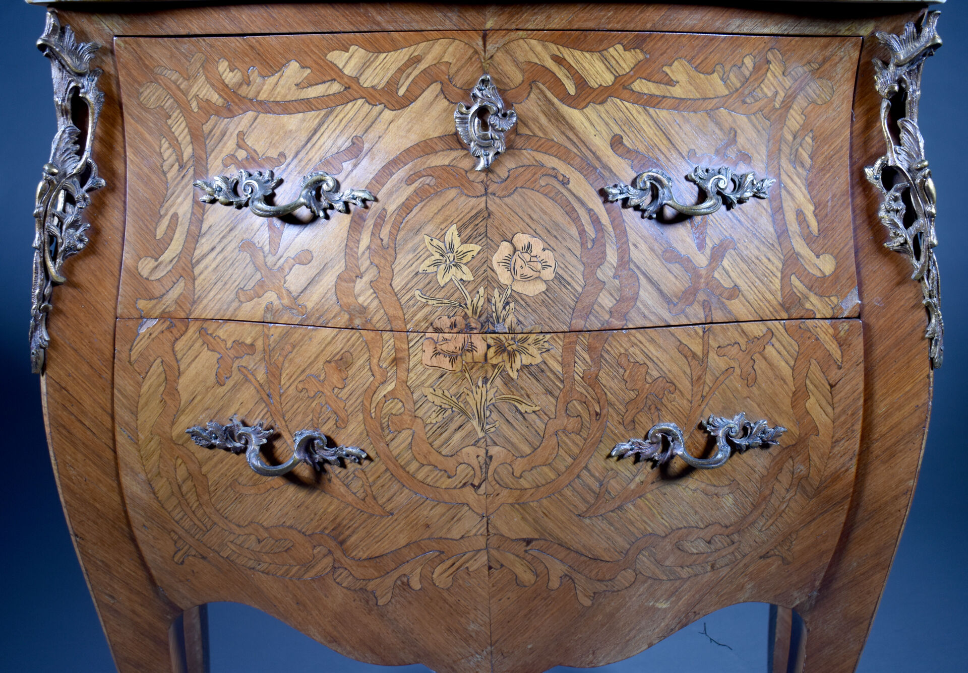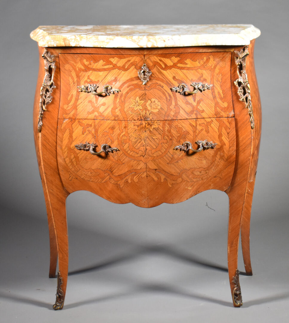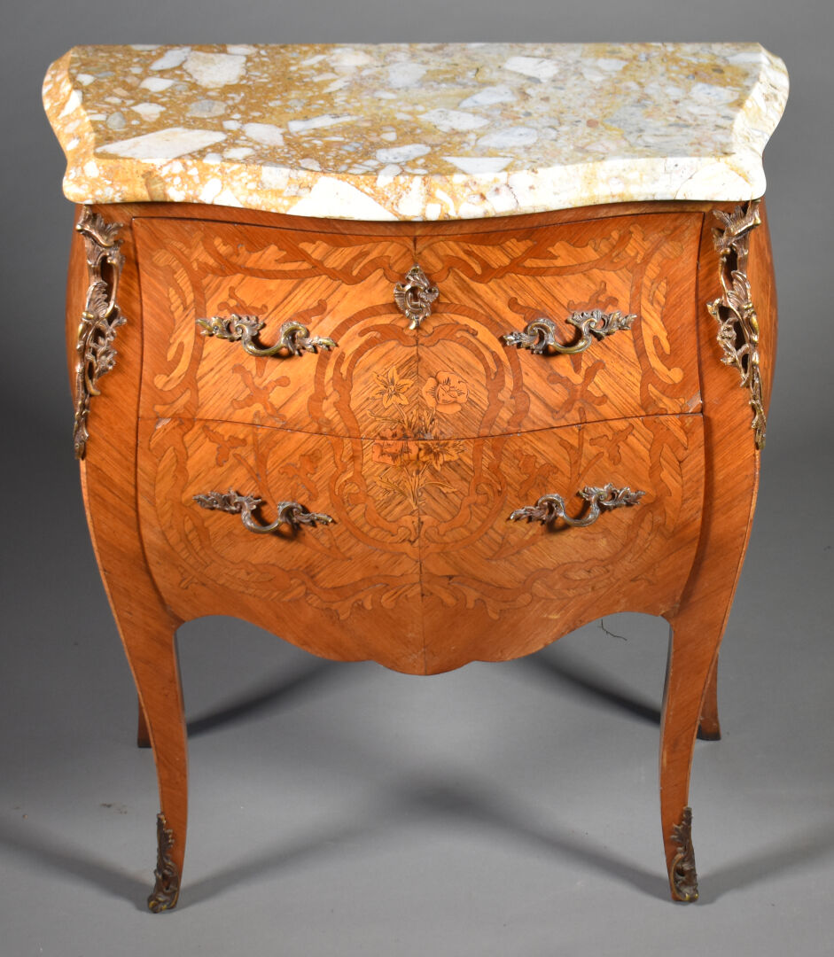 Commode tombeau en placage de bois de rose. Elle ouvre à deux tiroirs et repose sur quatre pieds cambrés. Plateau de marbre brèche beige. Ornementation de laiton doré tels que poignées de tirage et sabots. Style Louis XV, XXe siècle. Haut. : 81 cm – Larg. : 71 cm – Prof. : 37,5 cm.