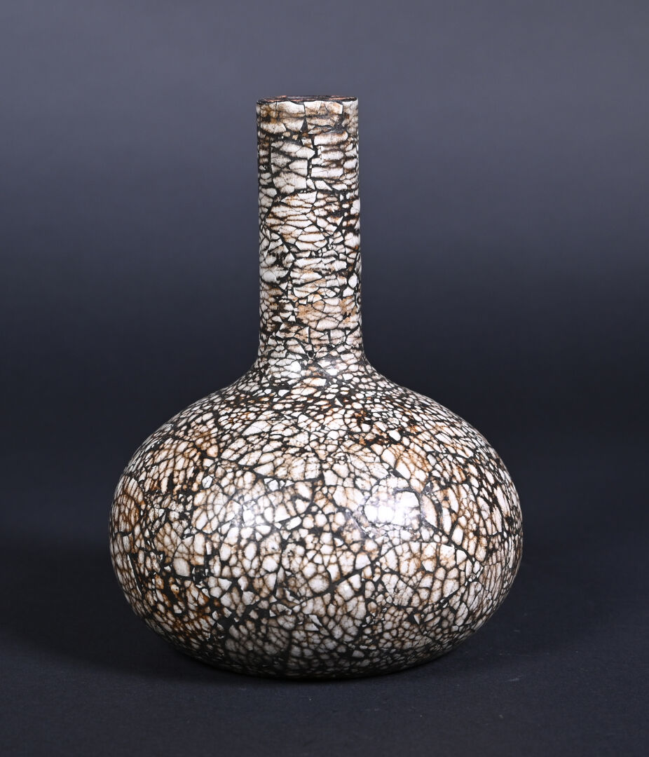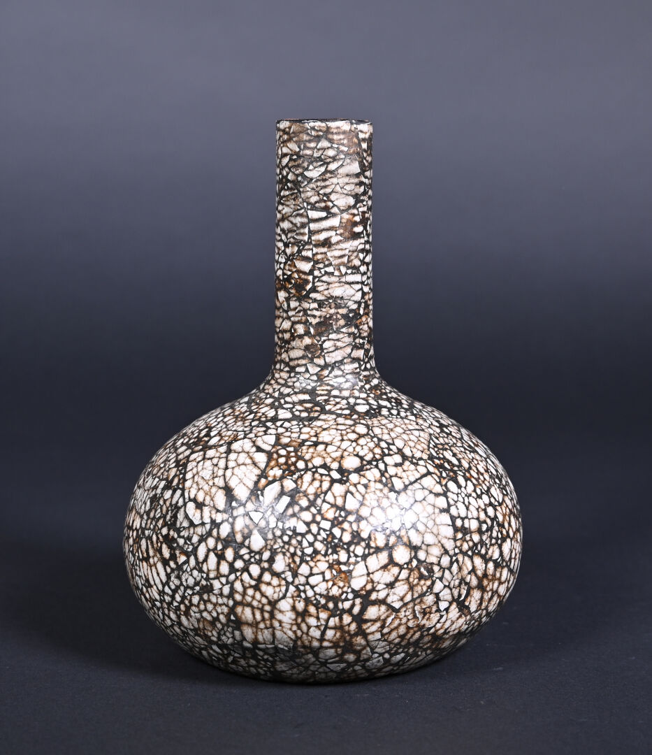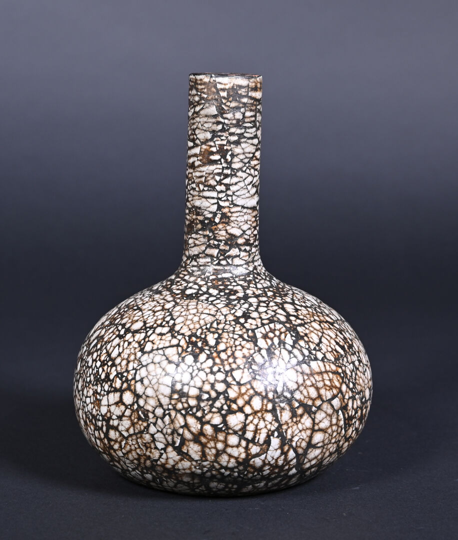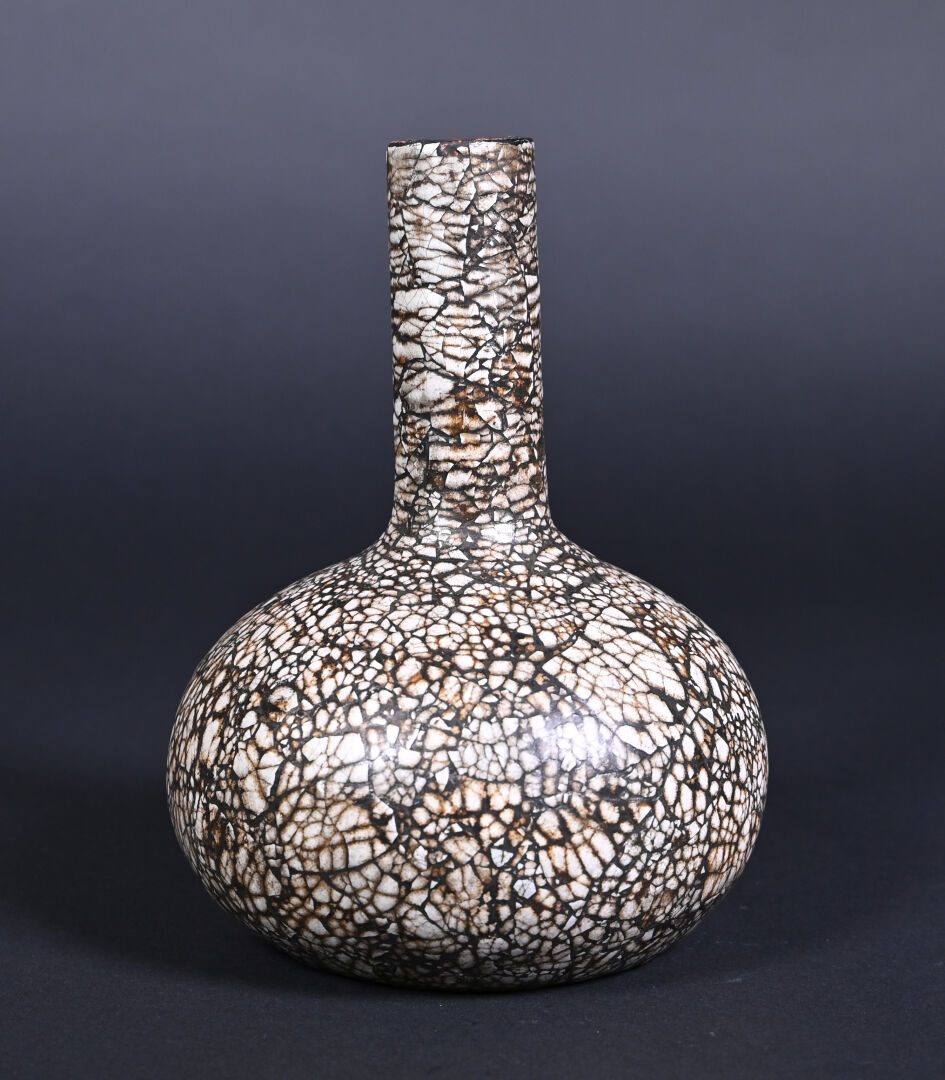 COMPAGNIE DES ARTS FRANCAIS – SUE & MARE et Jacques ADNET. Vase bouteille en céramique émaillée brun à décor coquille d’oeuf. Marqué au dessous. Haut. : 24 cm.
