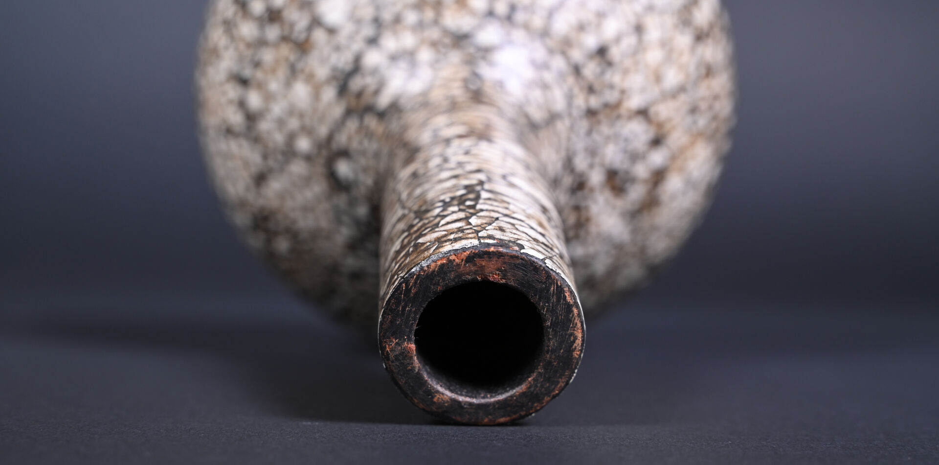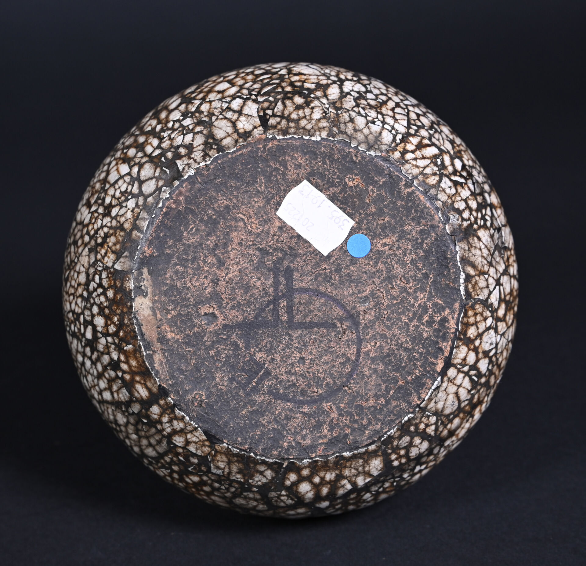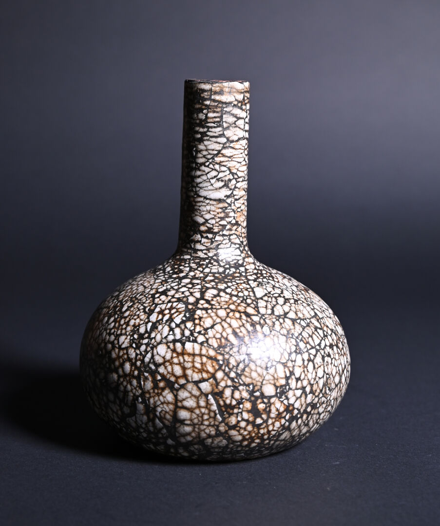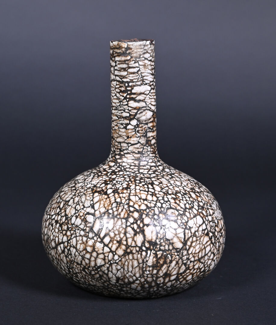 COMPAGNIE DES ARTS FRANCAIS – SUE & MARE et Jacques ADNET. Vase bouteille en céramique émaillée brun à décor coquille d’oeuf. Marqué au dessous. Haut. : 24 cm.