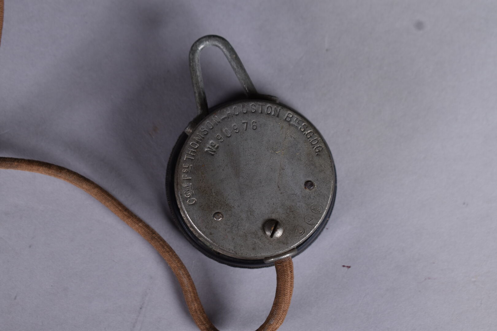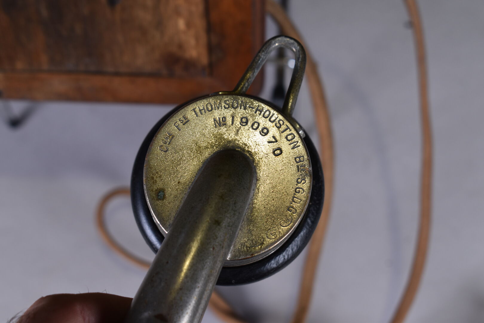 COMPAGNIE FRANCAISE THOMSON-HOUSTON – UNIS France – Téléphone mural à caisse en bois. Combiné marqué. Haut. : 27 cm.