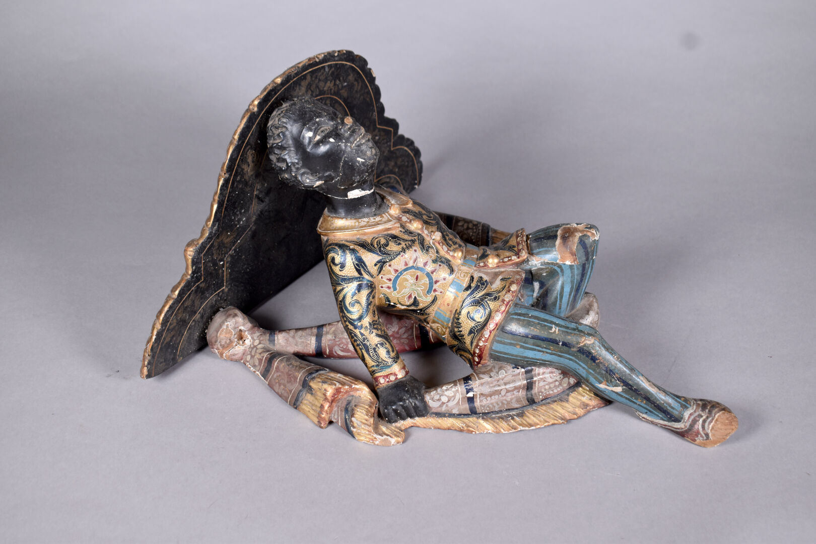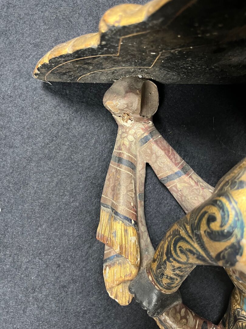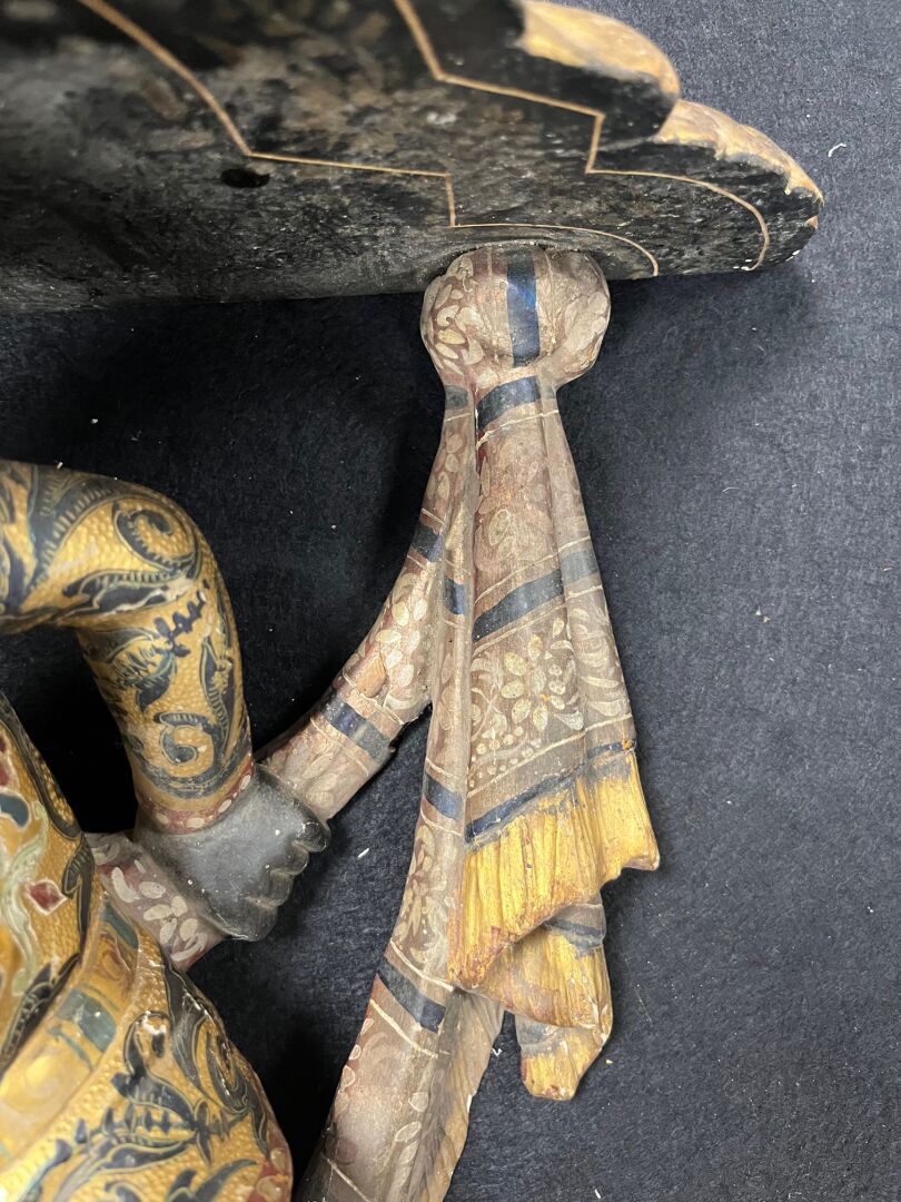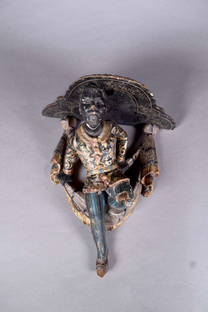 Console d’applique en bois sculpté stuqué en polychromie et dorure à décor d’un nubien et drapé. (Éclats, accidents et restaurations). Probablement Venise, XIXème siècle.