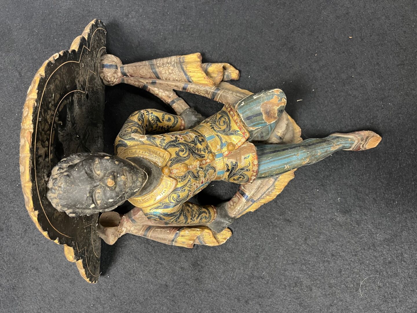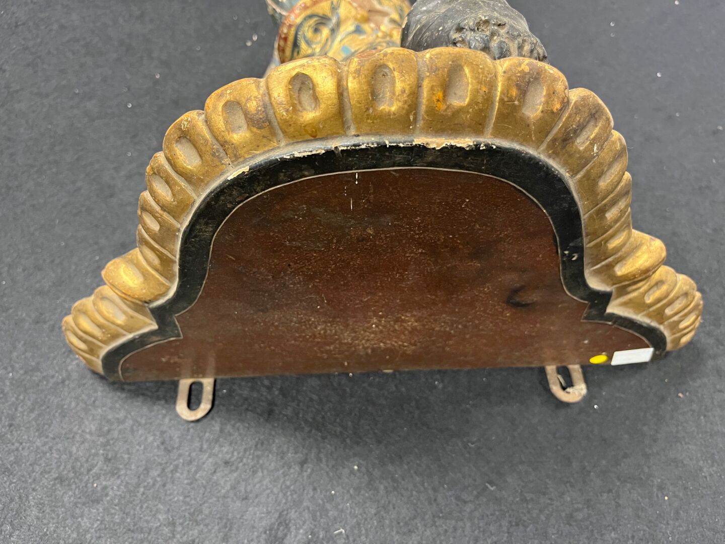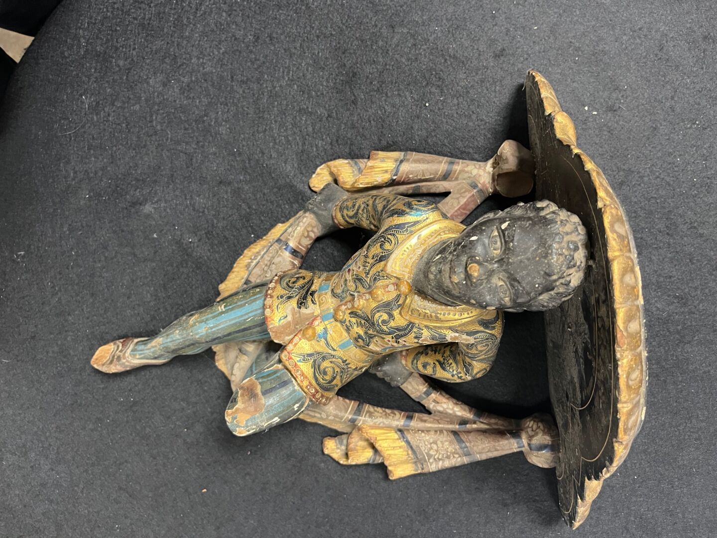 Console d’applique en bois sculpté stuqué en polychromie et dorure à décor d’un nubien et drapé. (Éclats, accidents et restaurations). Probablement Venise, XIXème siècle.