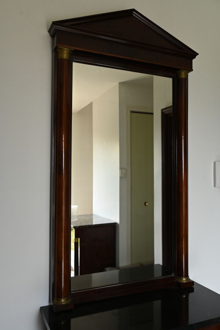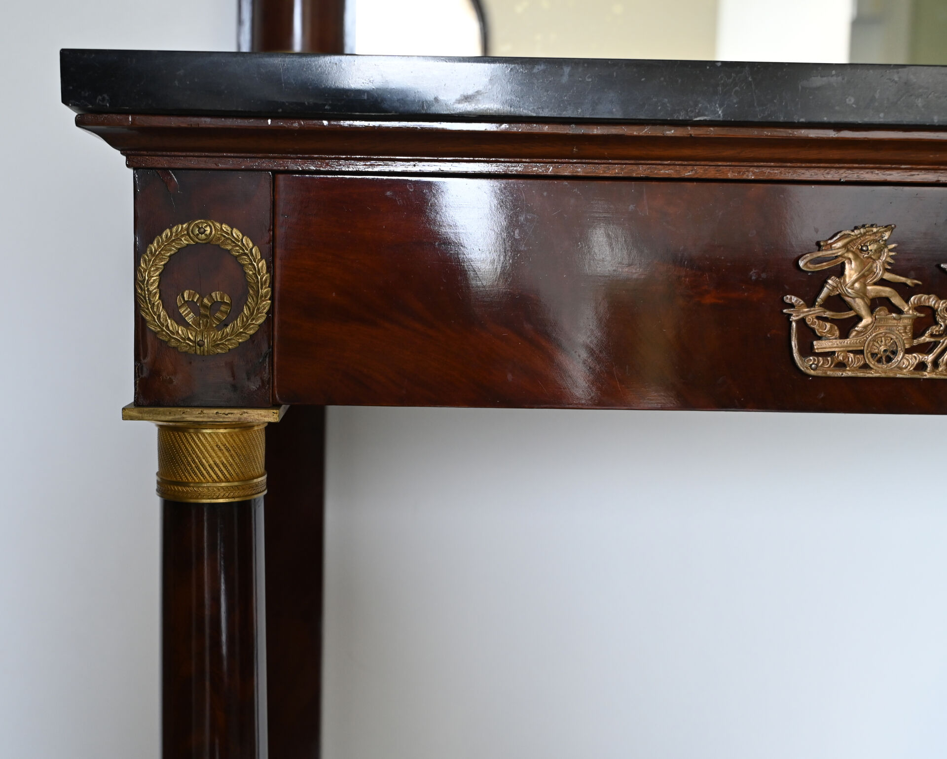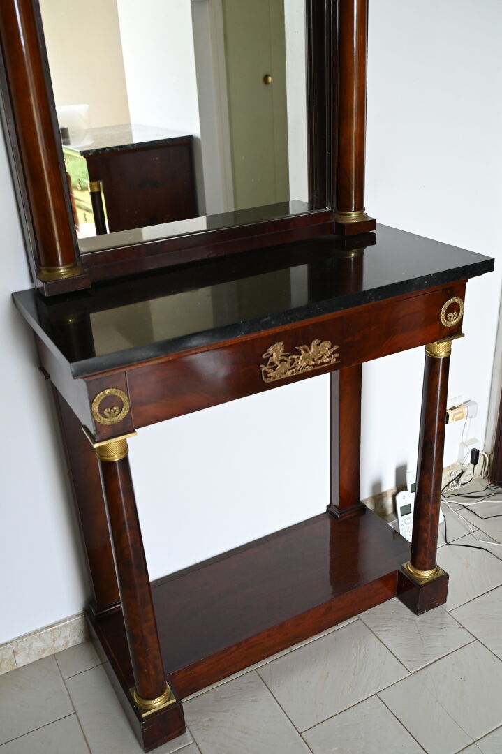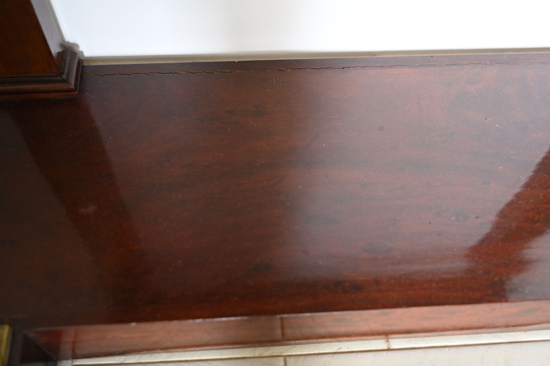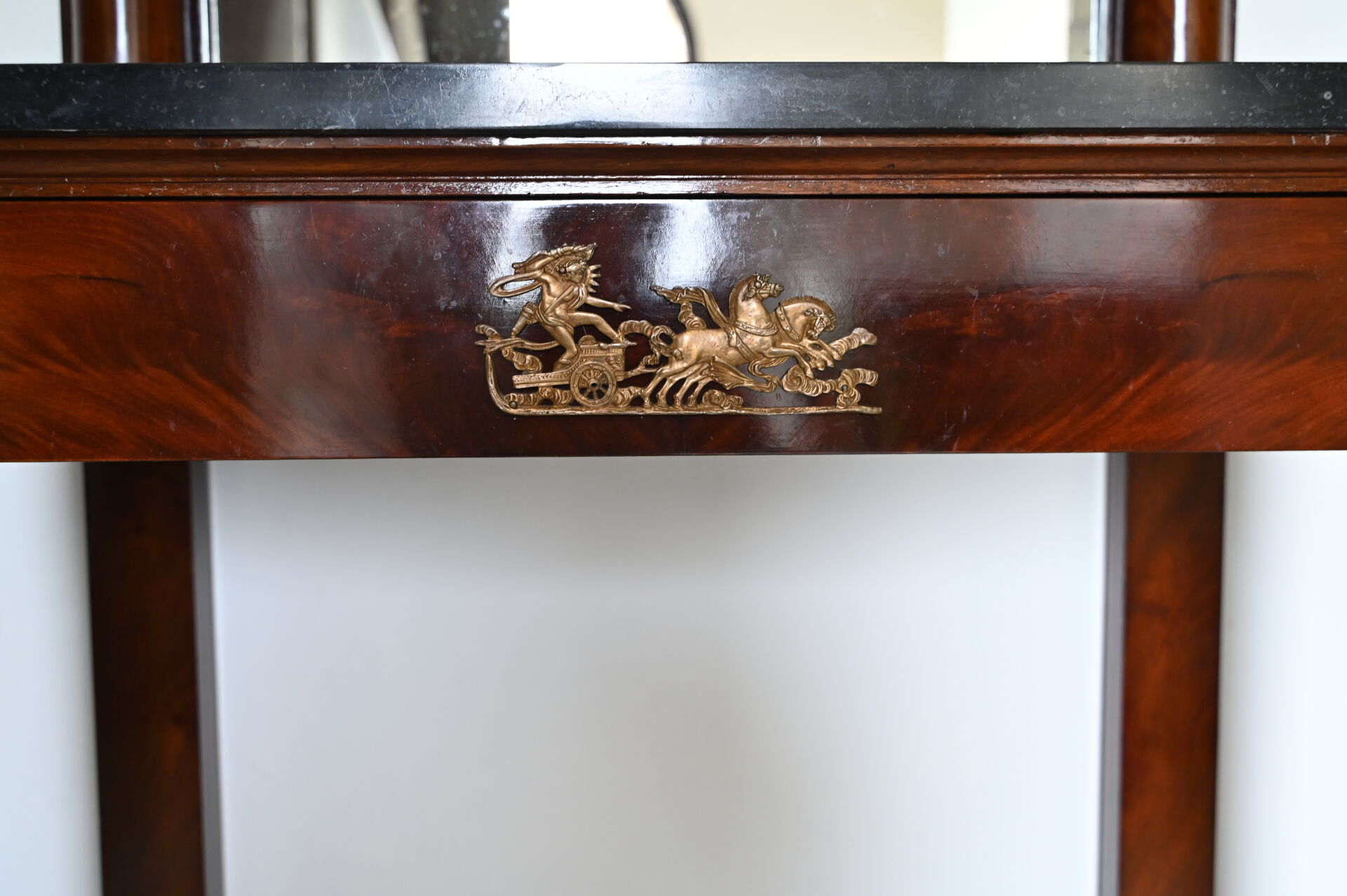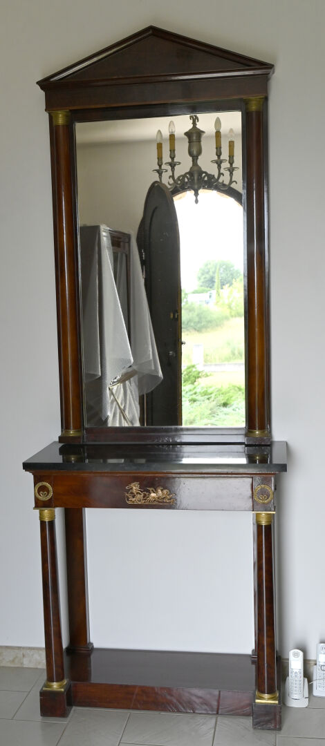 Console en acajou et placage d’acajou. Elle ouvre à un tiroir en ceinture, et repose sur quatre pieds colonnes. Style Empire. Usures d’usage. Haut. : 234 cm – Larg. : 86 cm – Prof. : 40 cm.