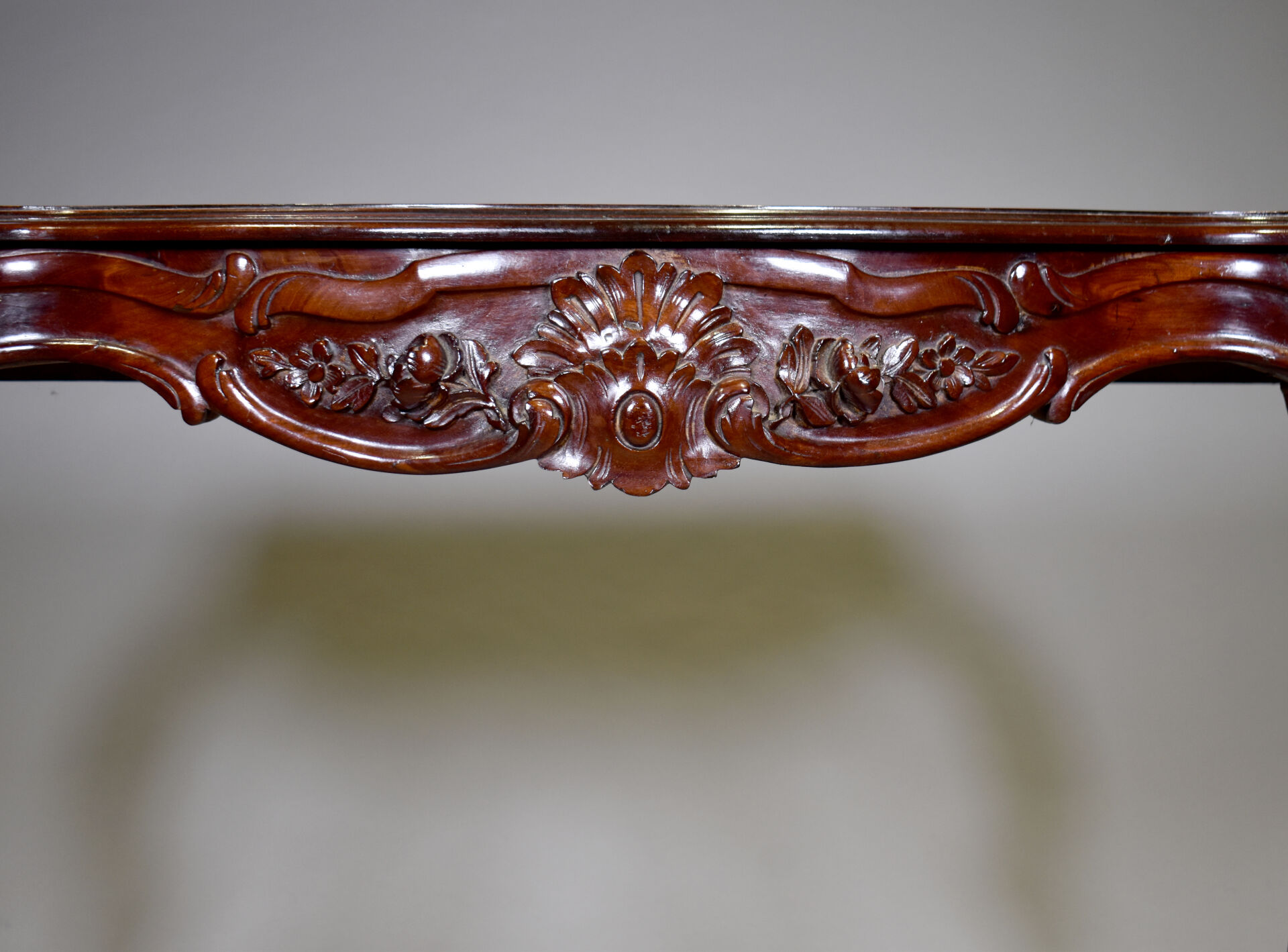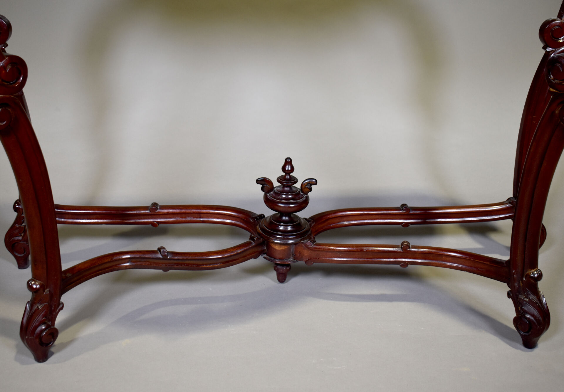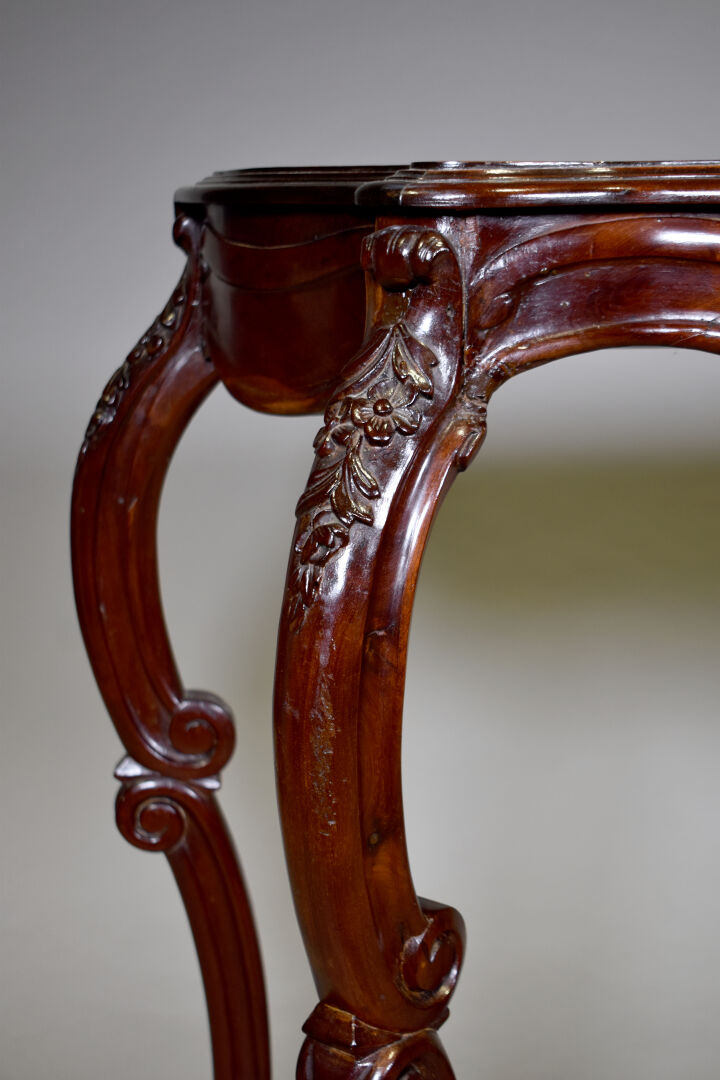 Console en acajou et placage d’acajou, reposant sur quatre pieds cambrés en console réunis par une entretoise en X surmontée d’une cassolette (restaurations). La ceinture sculptée de palmette. Epoque Napoléon III. Haut. : 91 cm – Larg. : 128 cm – Prof. : 43,5 cm.
