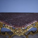 Console en bois sculpté doré à décor de fleurs et acanthes, piètement à enroulements (manques et restaurations). Plateau de marbre rouge. Style Louis XV, XIXe siècle. Haut. : 90 cm – Larg. : 120 cm – Prof. : 48 cm.