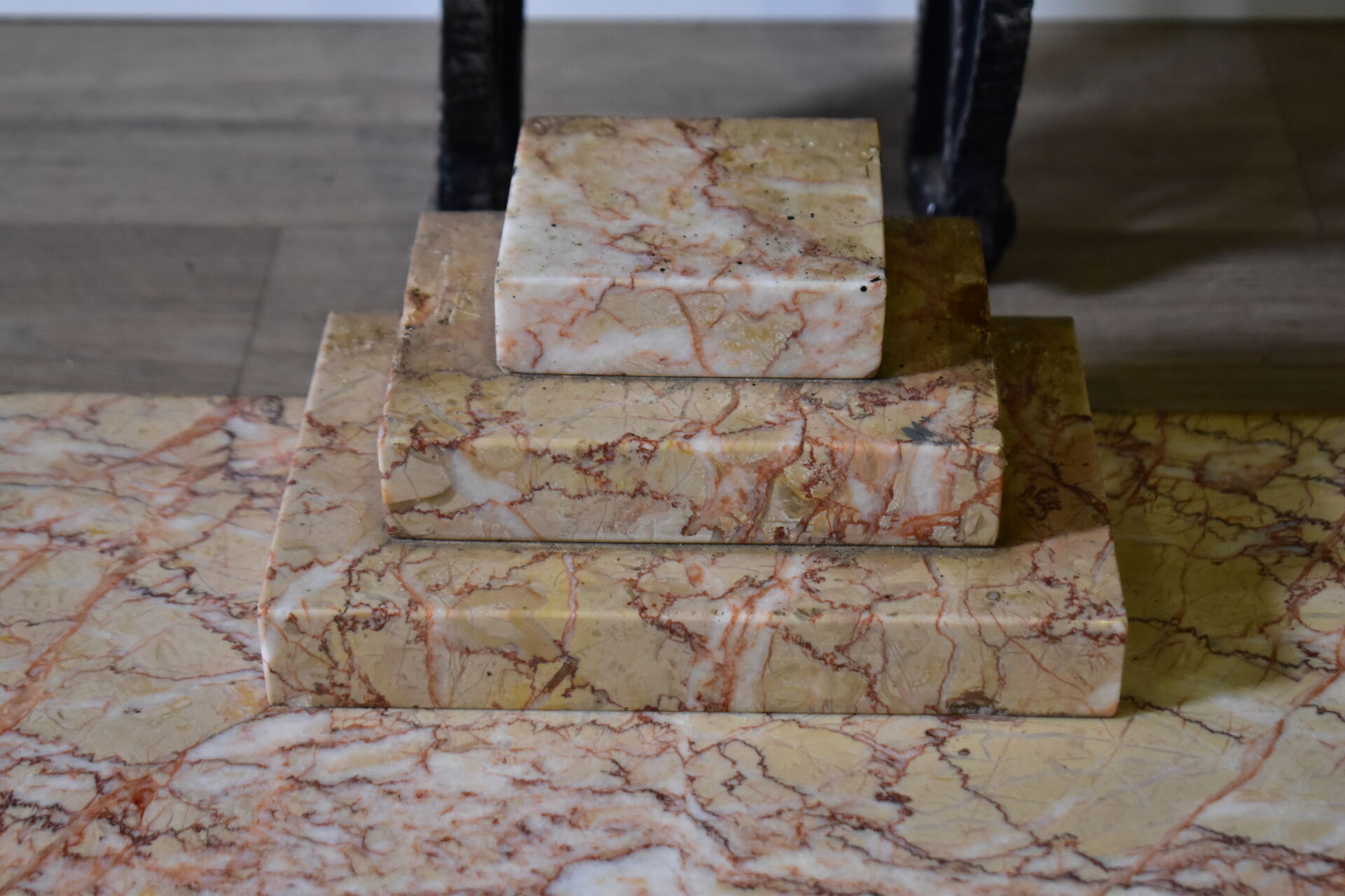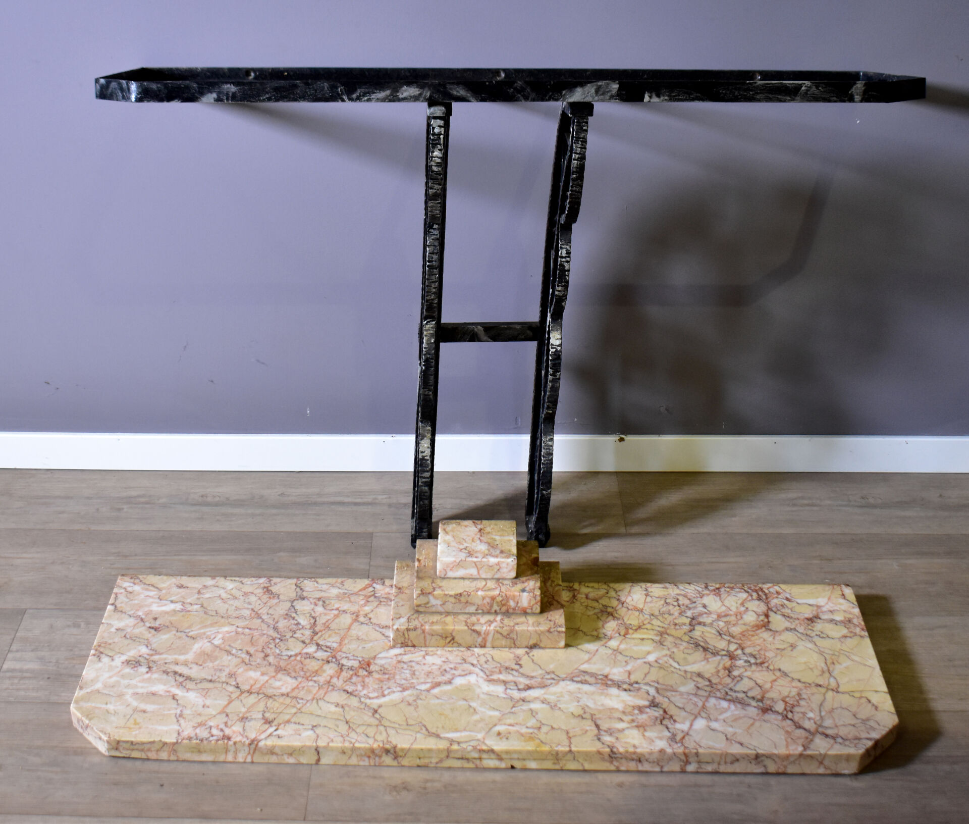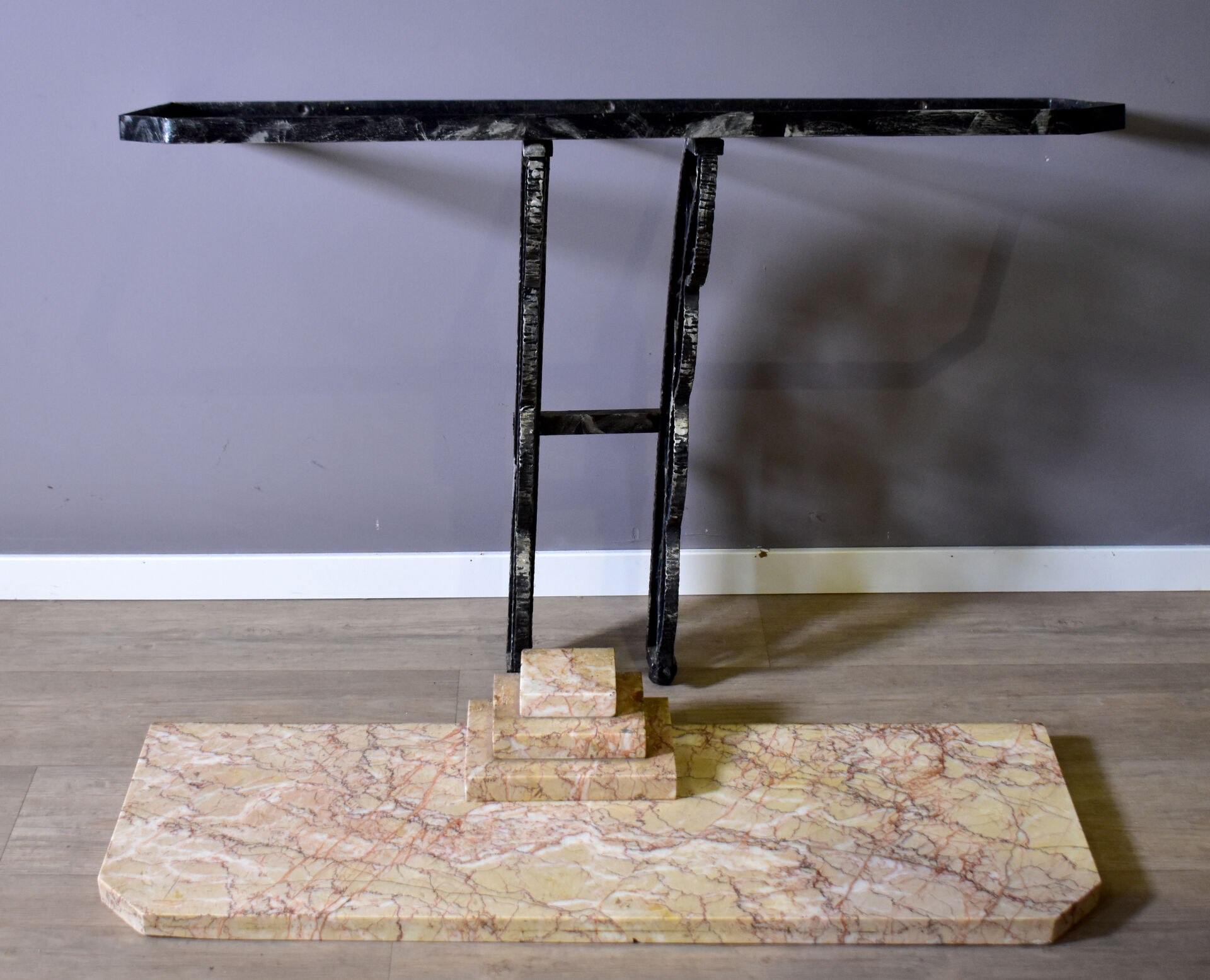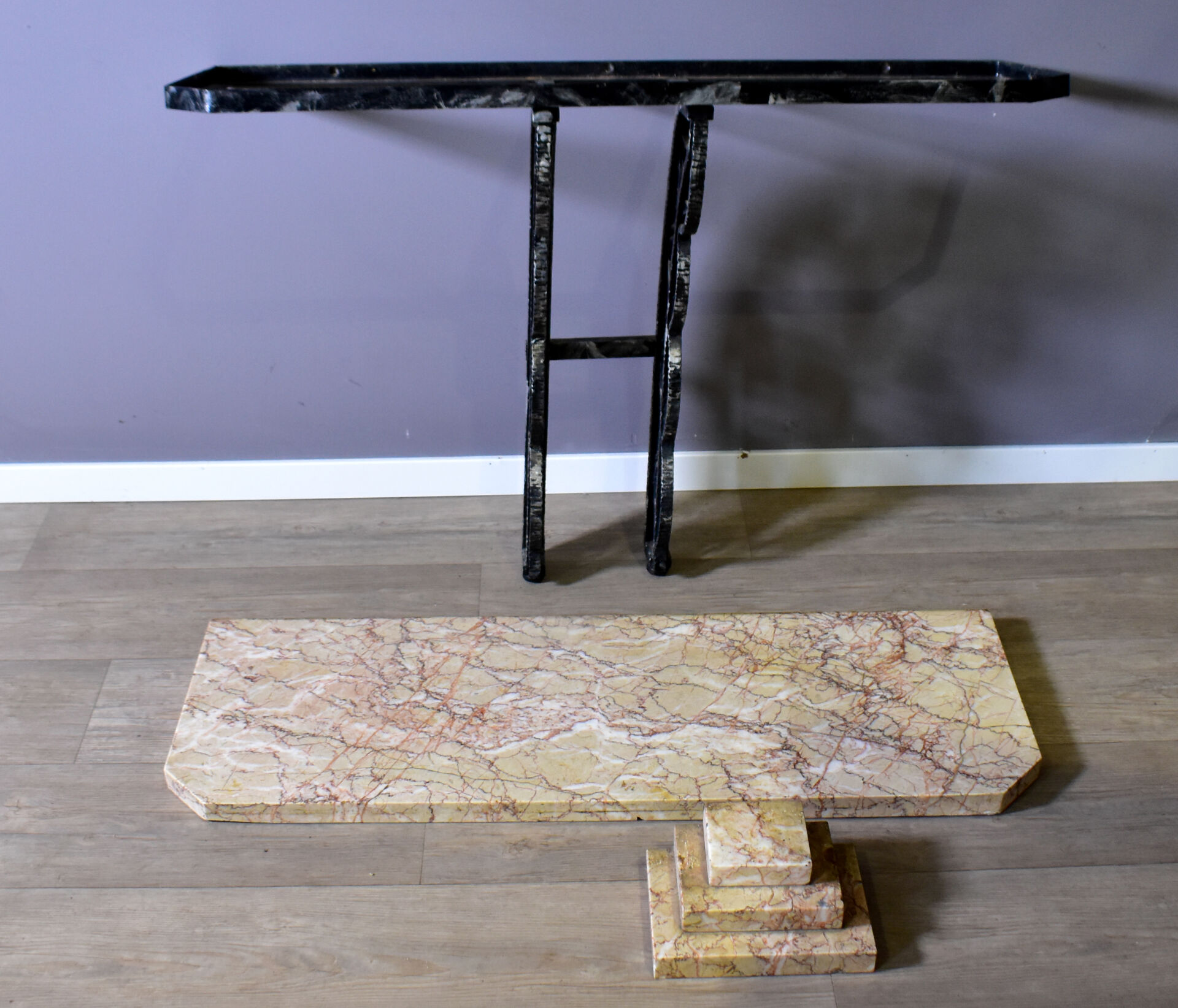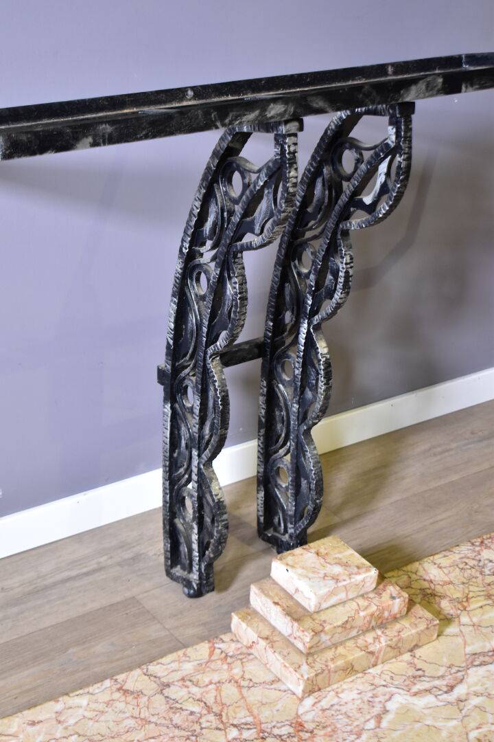 Console en fer forgé re-patiné noir à plateau de marbre jaune veiné rose, la base en gradin. Epoque Art Déco. Haut. : 76 cm – Larg. : 101 cm – Prof. : 35 cm.