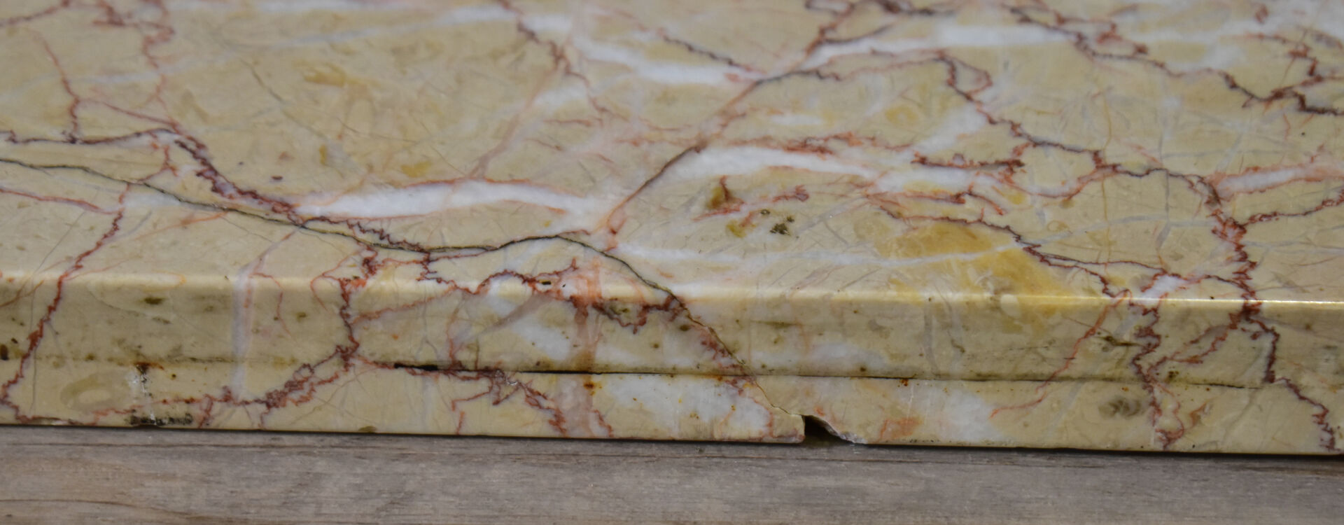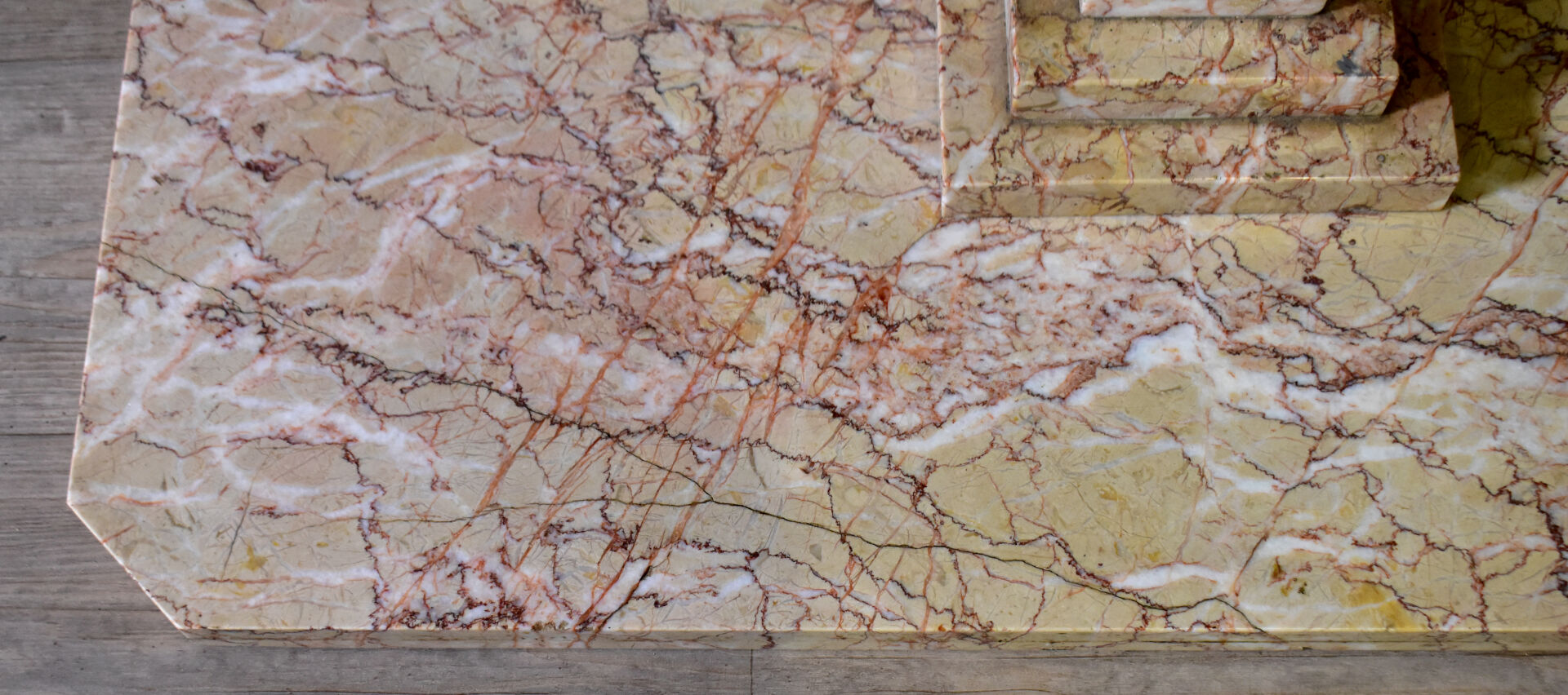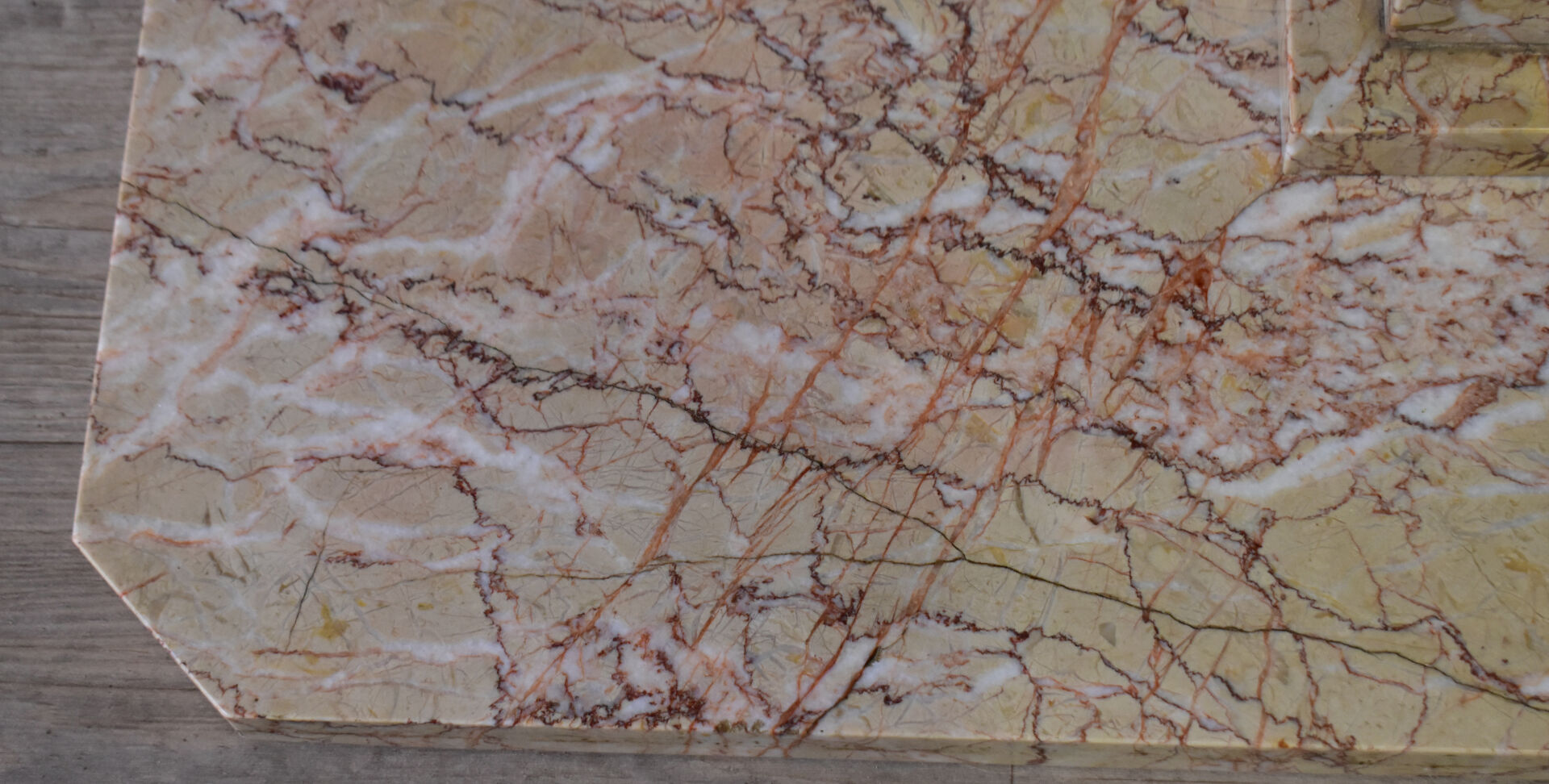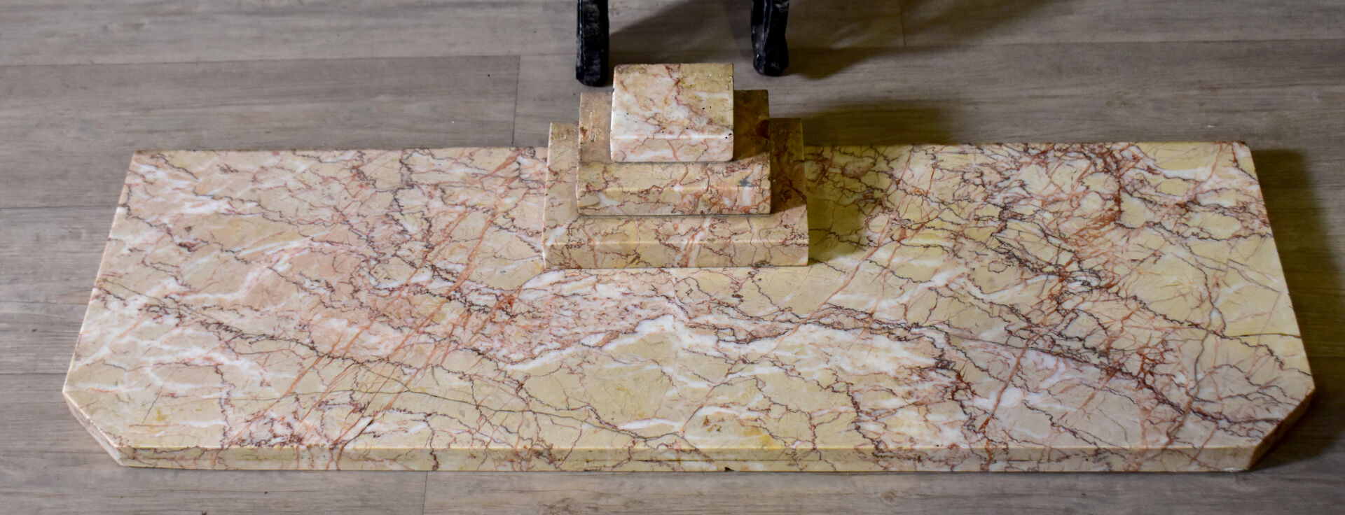 Console en fer forgé re-patiné noir à plateau de marbre jaune veiné rose, la base en gradin. Epoque Art Déco. Haut. : 76 cm – Larg. : 101 cm – Prof. : 35 cm.