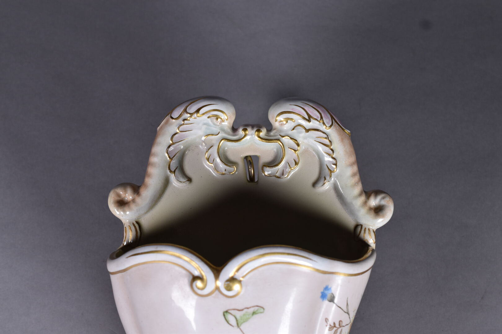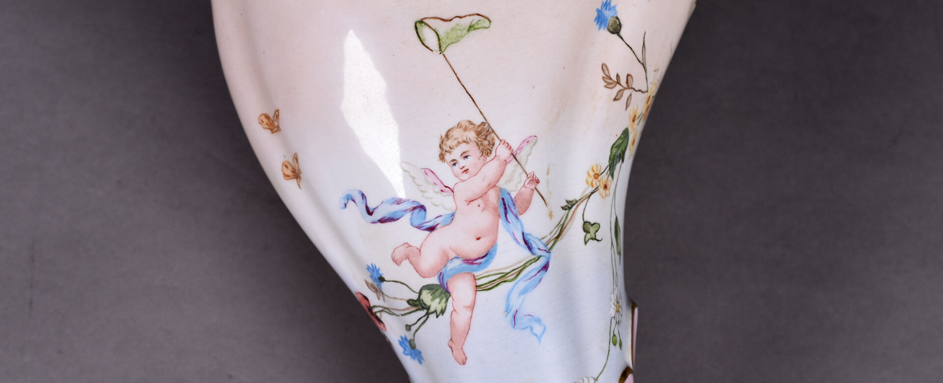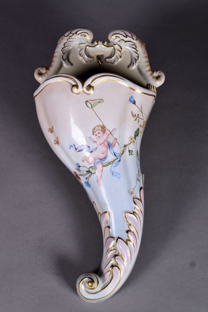 Cornet en céramique à décor émaillé en polychromie d’un angelot chassant des papillons (quelques usures). XXe siècle. Haut. : 39 cm.