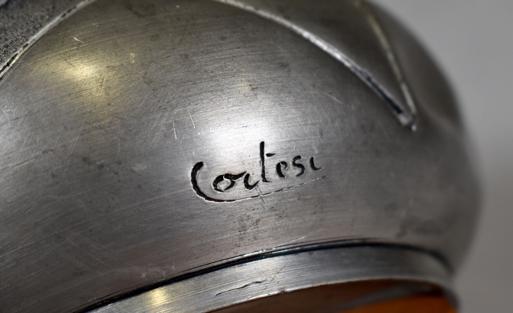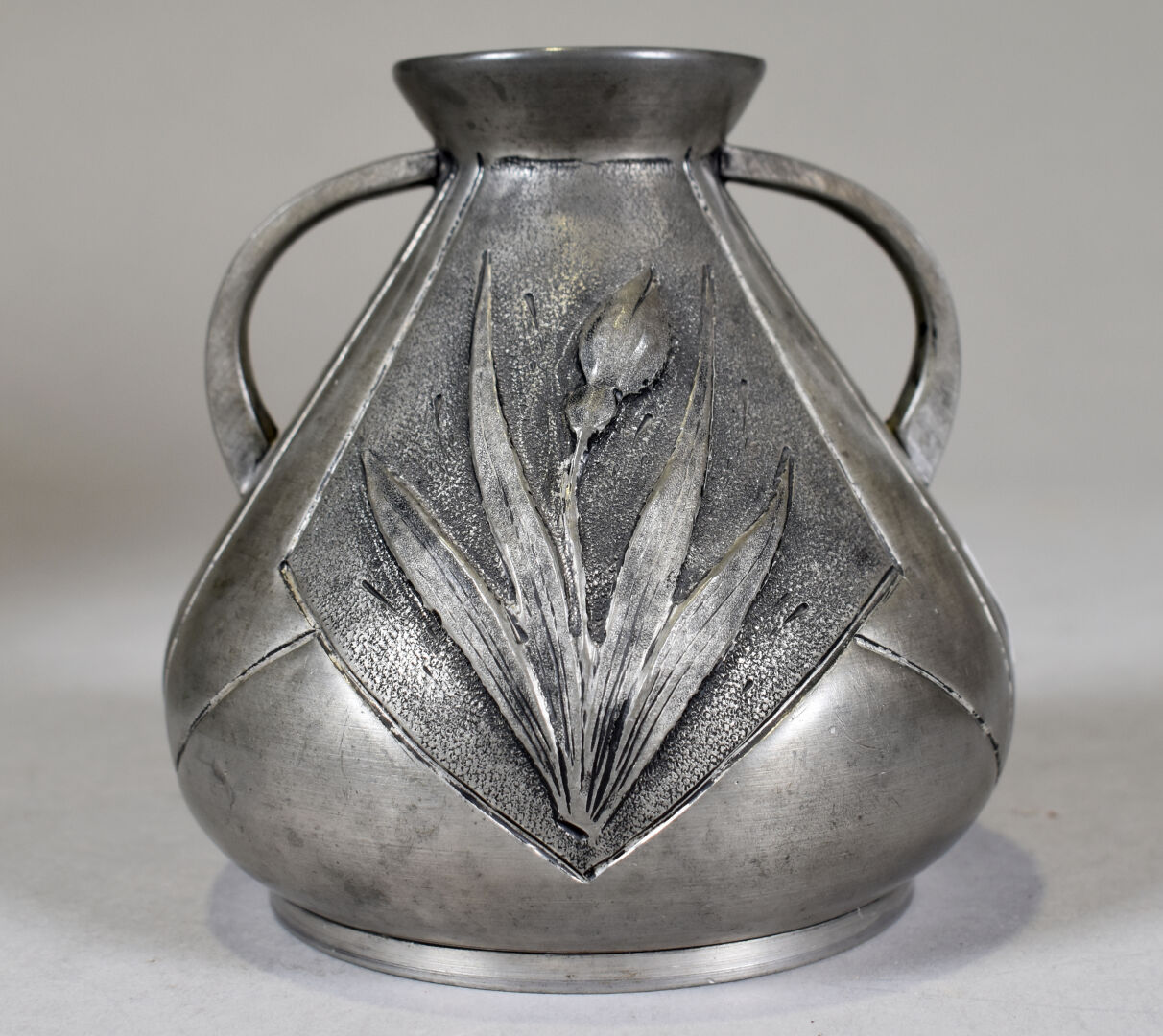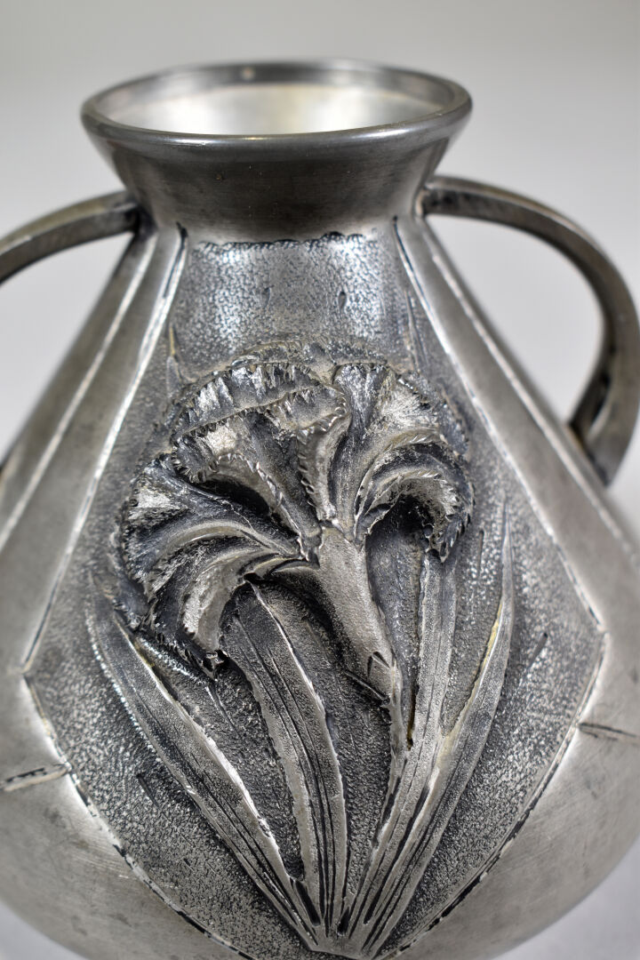 CORTESI. Petit vase en étain à deux anses et décor de fleurs (un enfoncement). Signé sur la panse. Haut. : 10,5 cm.