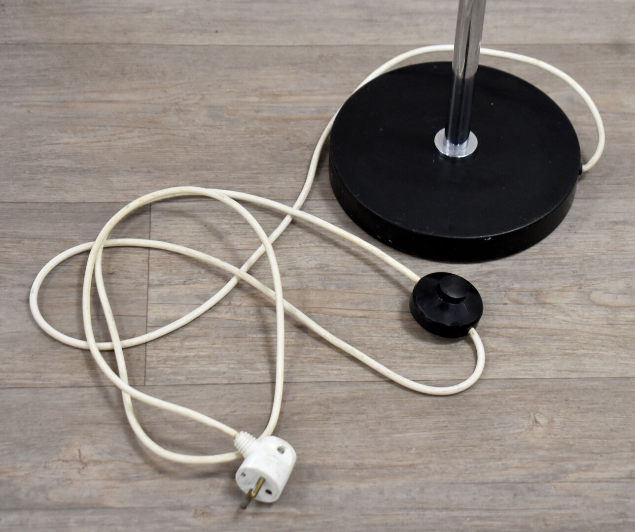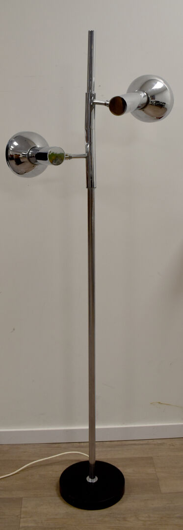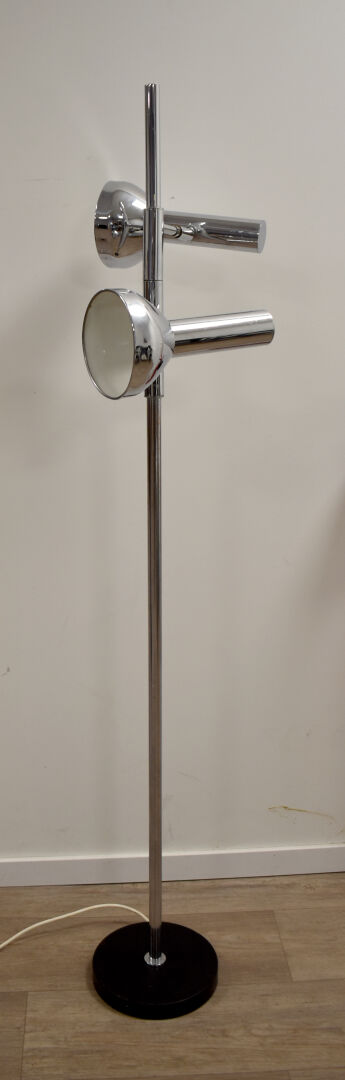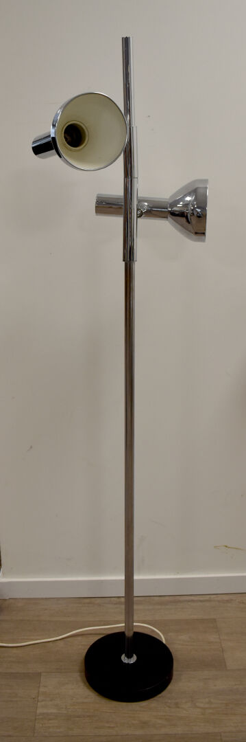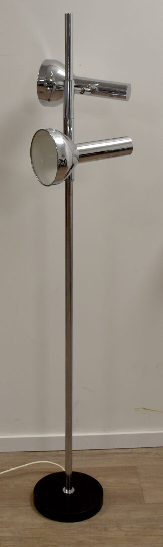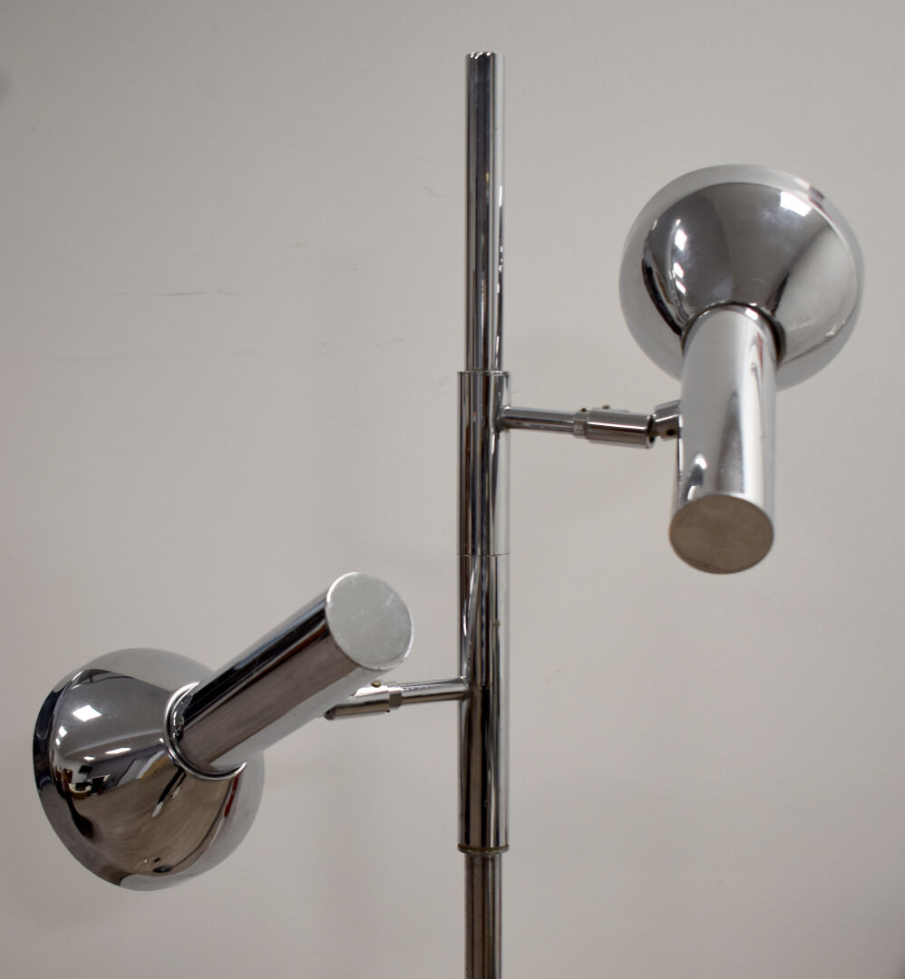 COSACK BROTHERS. Lampadaire en métal chromé à deux bras de lumière pivotant autour du fût. Travail des années 1970. Haut. : 147 cm.