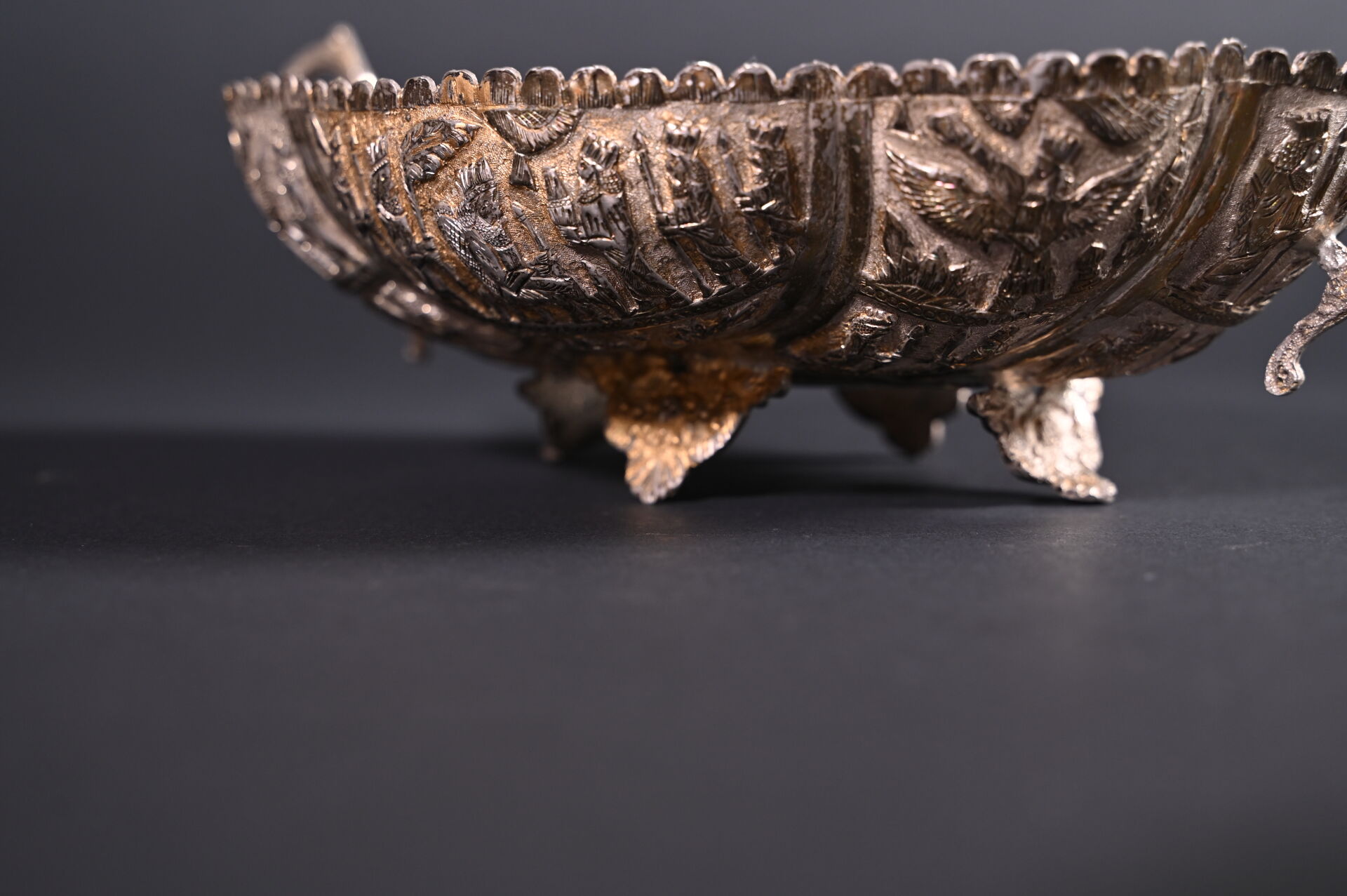 Coupe à anses polylobée en argent 800/1000e travaillé au repoussé de scènes mythologiques. Travail étranger. Haut. : 9,5 cm – Larg. : 35,5 cm – Prof. : 21,5 cm. Poids. : 762 g.