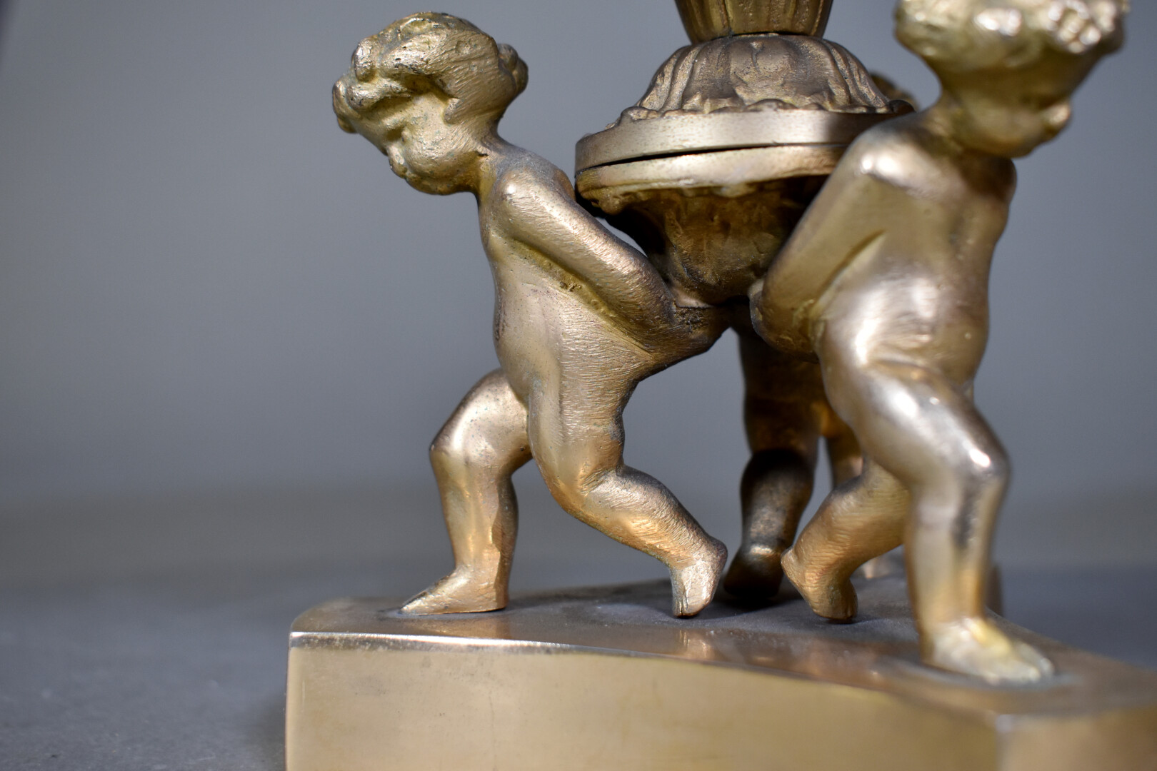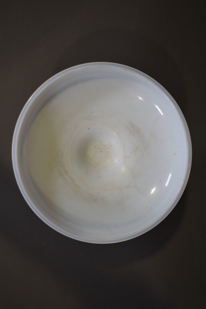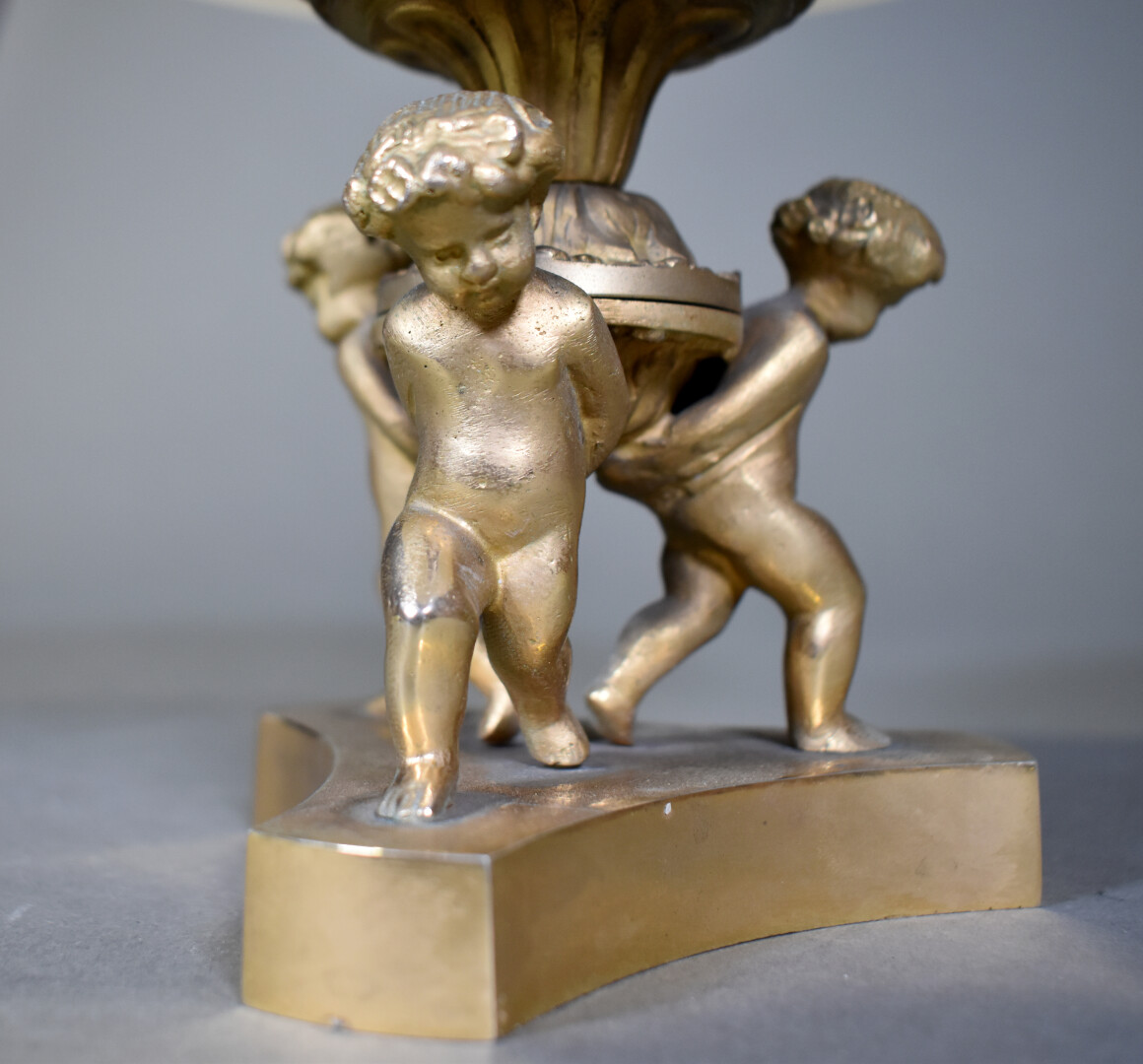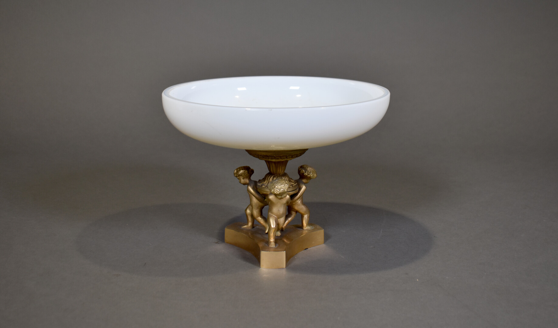 Coupe en opaline, le piètement en bronze doré figurant 3 putti. Fin du XIXe ou début du XXe siècle. Haut. : 18,5 cm – Diam. : 25 cm.
