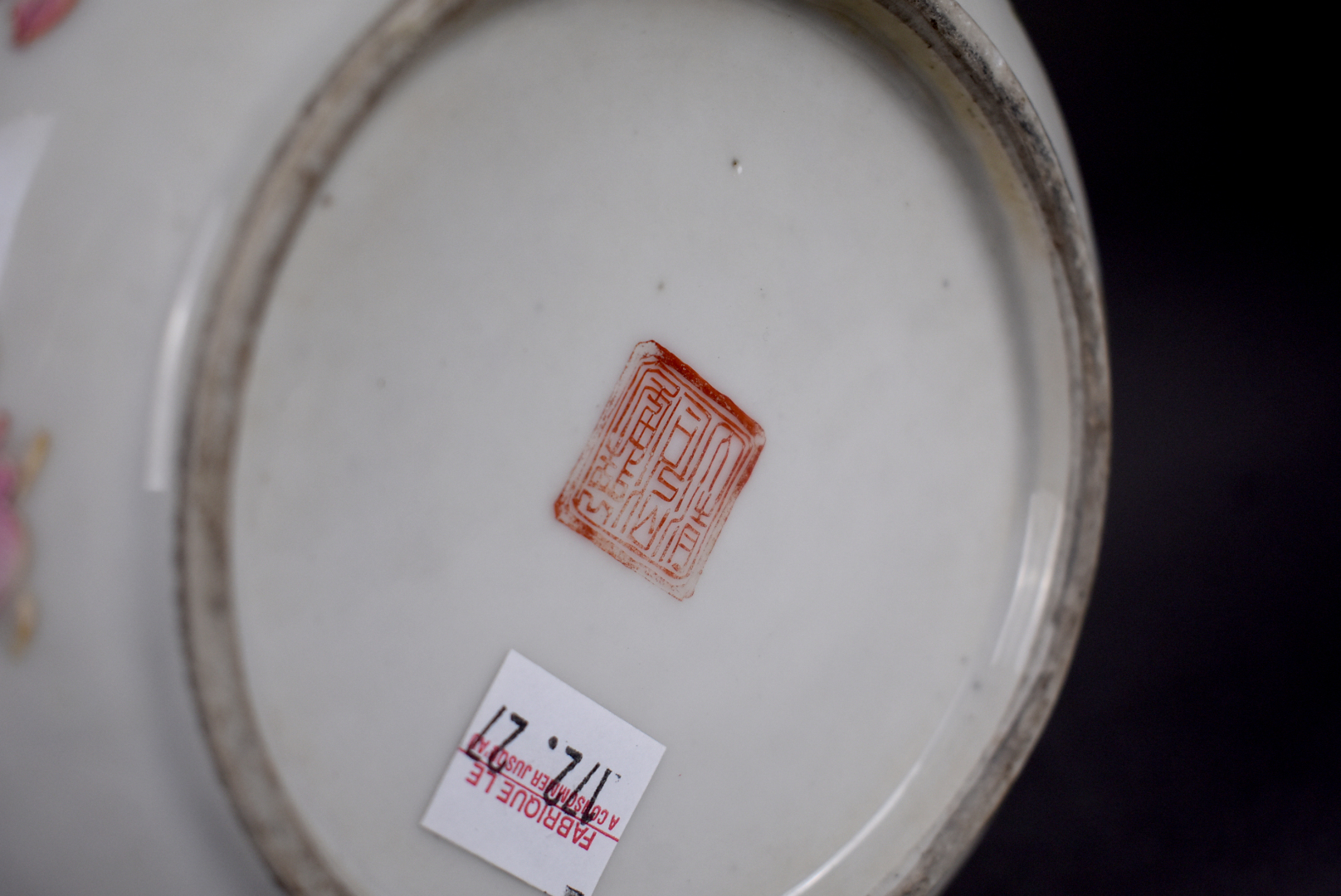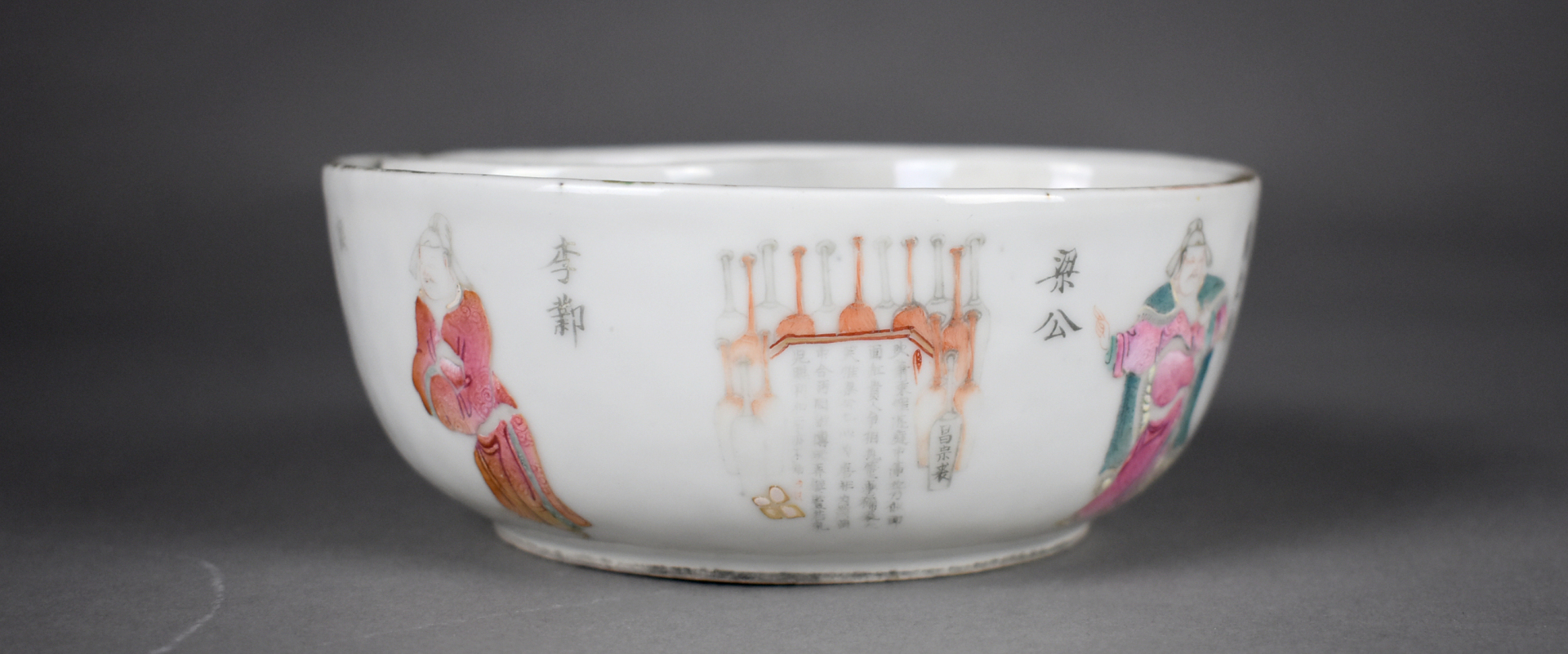 Coupe en porcelaine et émaux de la famille rose reprenant la forme du Taiji (Yin Yang) à décor représentant entre autre Li Bai le poête ivre adossé à une jarre d’alcool. Marque et époque Tongzhe 2e moitié du 19e siècle. Diam. :