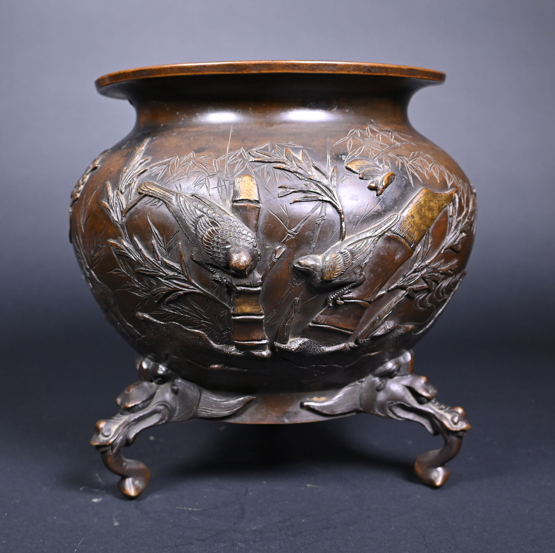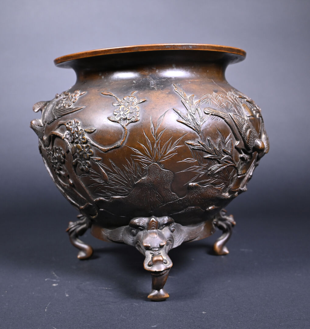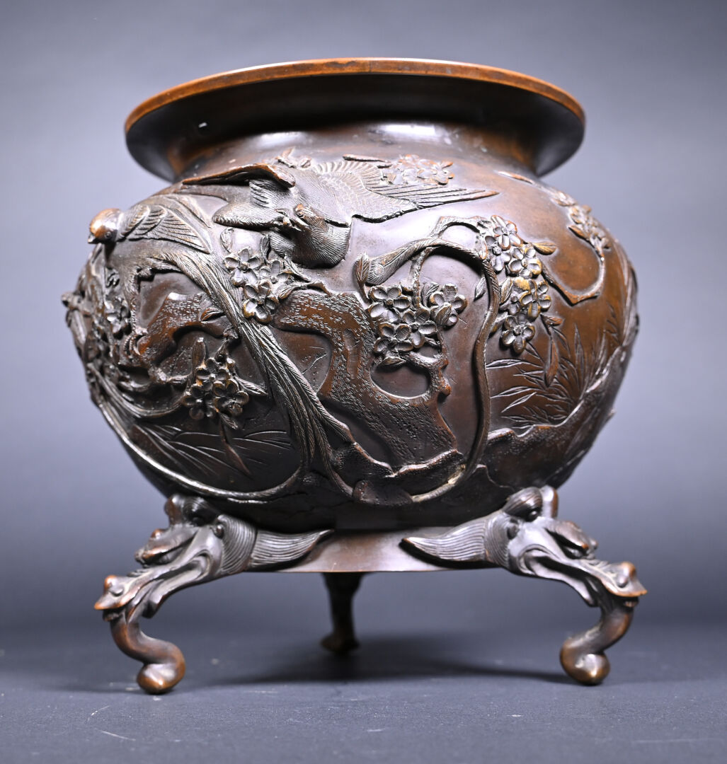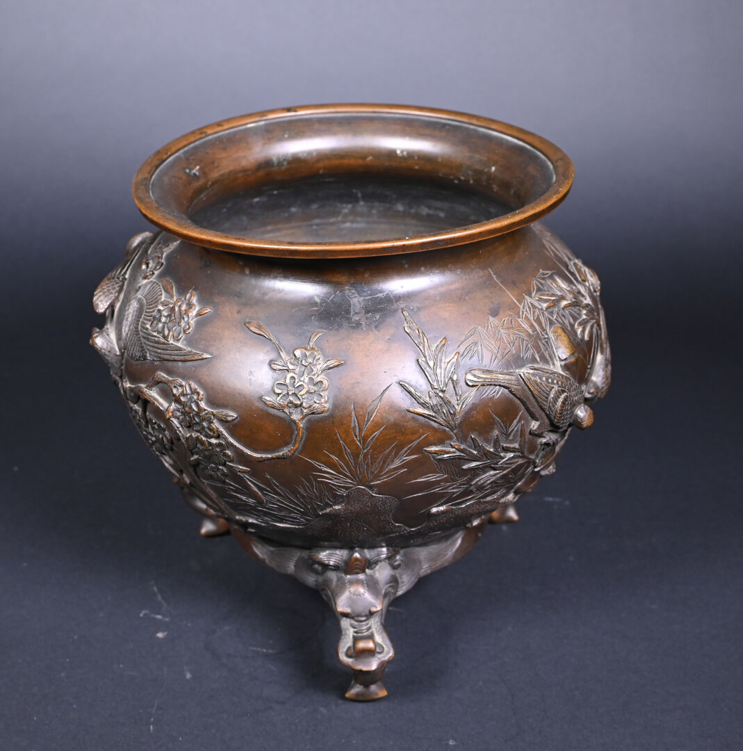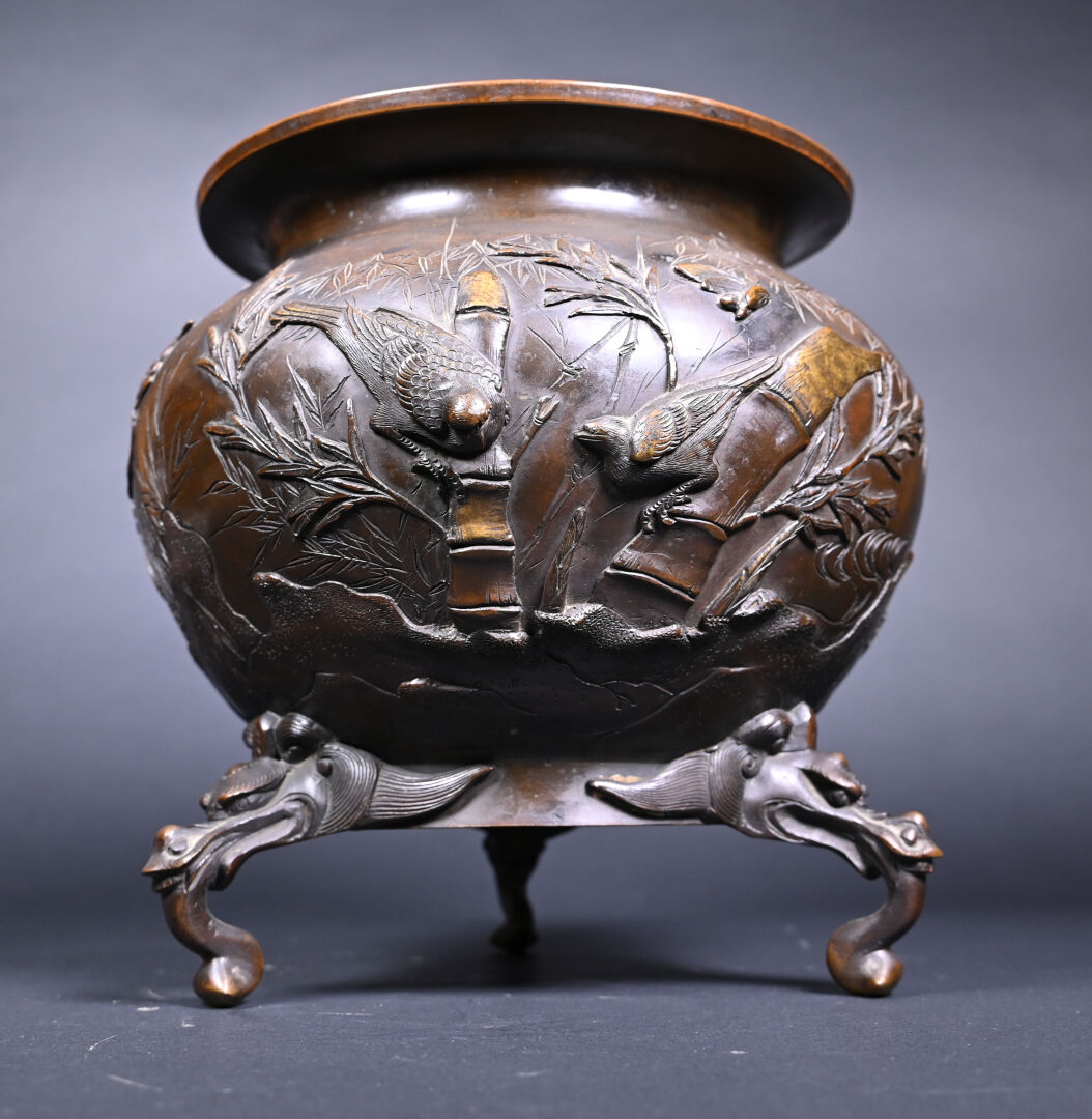 Coupe ou brûle-parfum tripode en bronze patiné brun à décor en relief d’oiseaux branchés, bambous, les pieds à têtes de dragons (un trou sur le col). Japon, époque Meiji. Haut. : 27 cm.