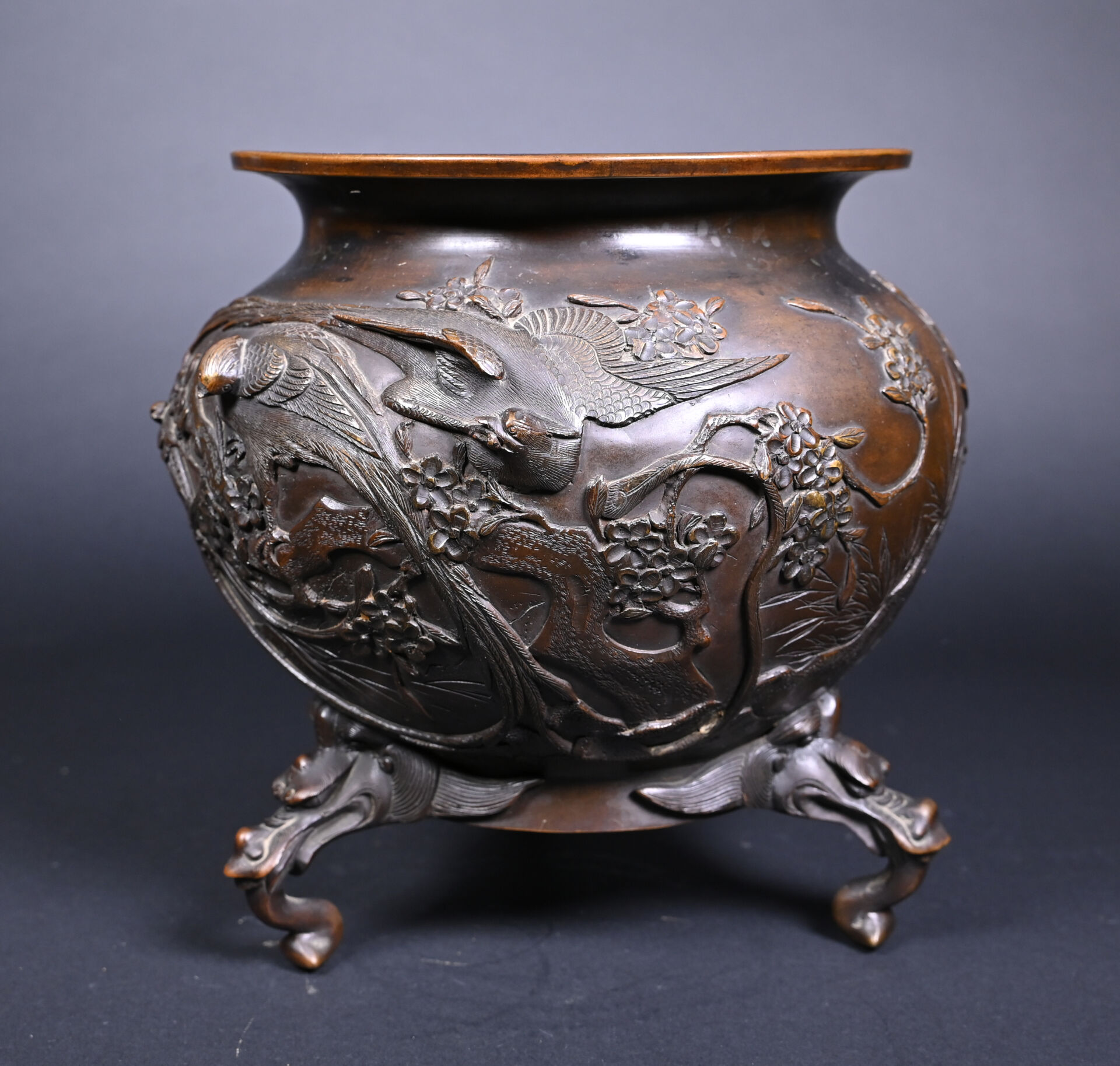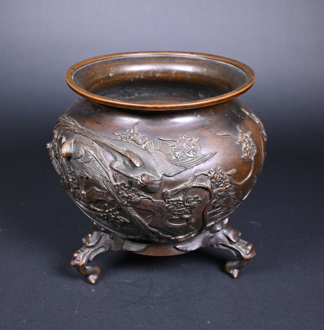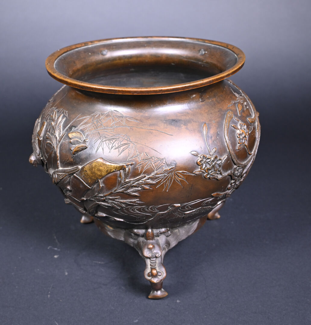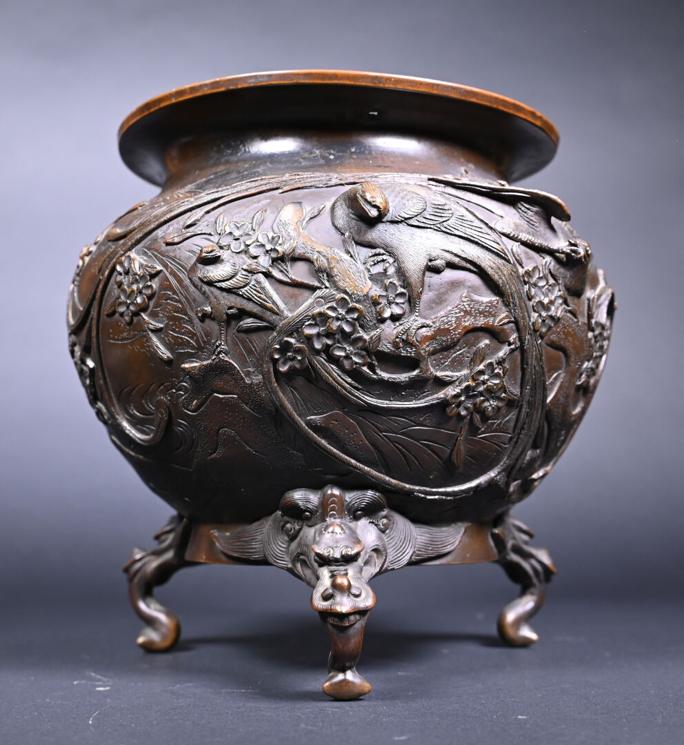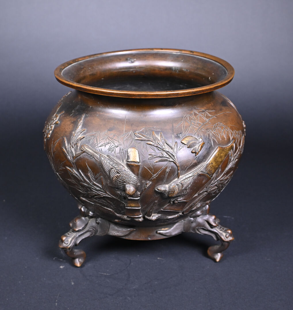 Coupe ou brûle-parfum tripode en bronze patiné brun à décor en relief d’oiseaux branchés, bambous, les pieds à têtes de dragons (un trou sur le col). Japon, époque Meiji. Haut. : 27 cm.