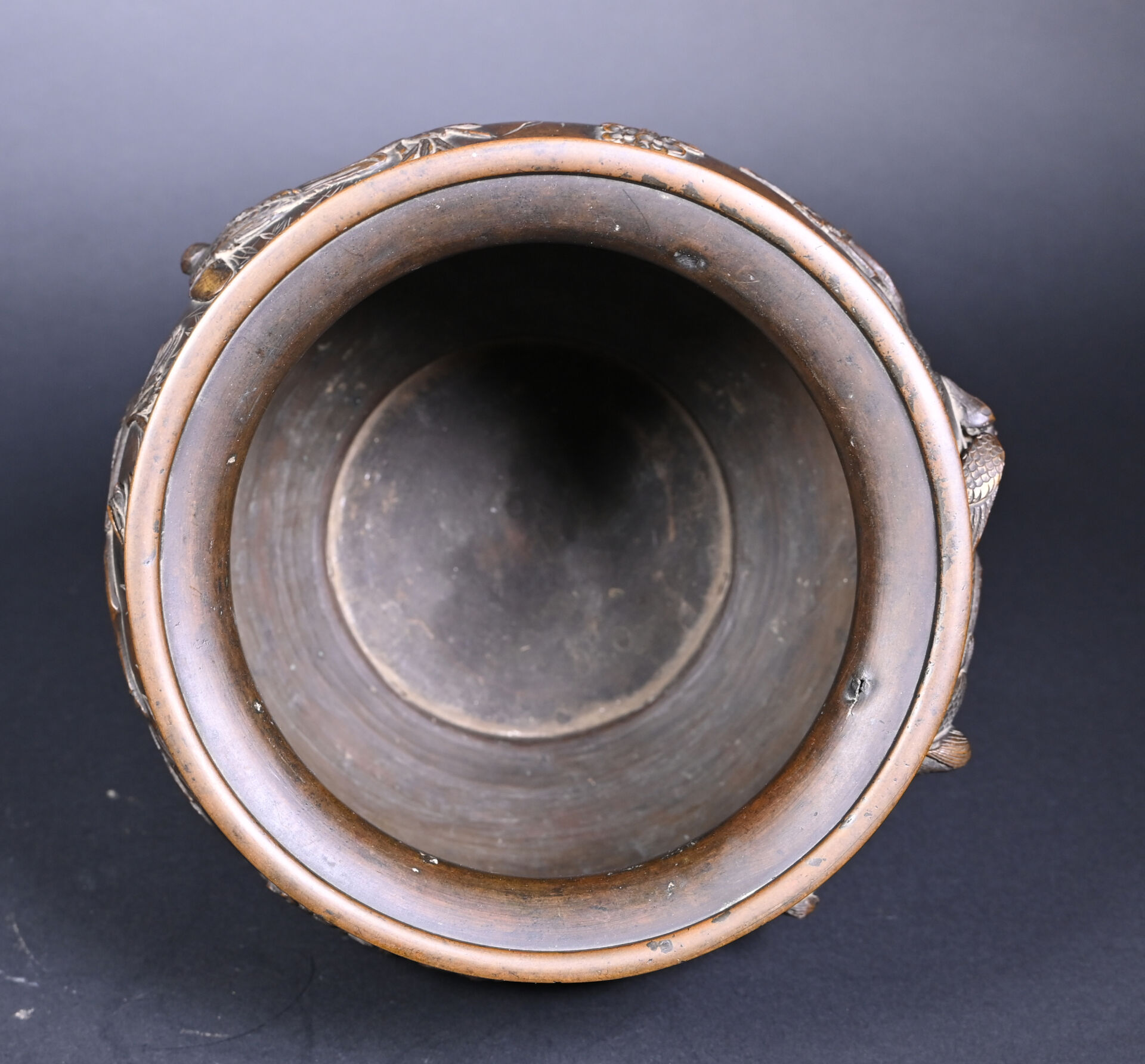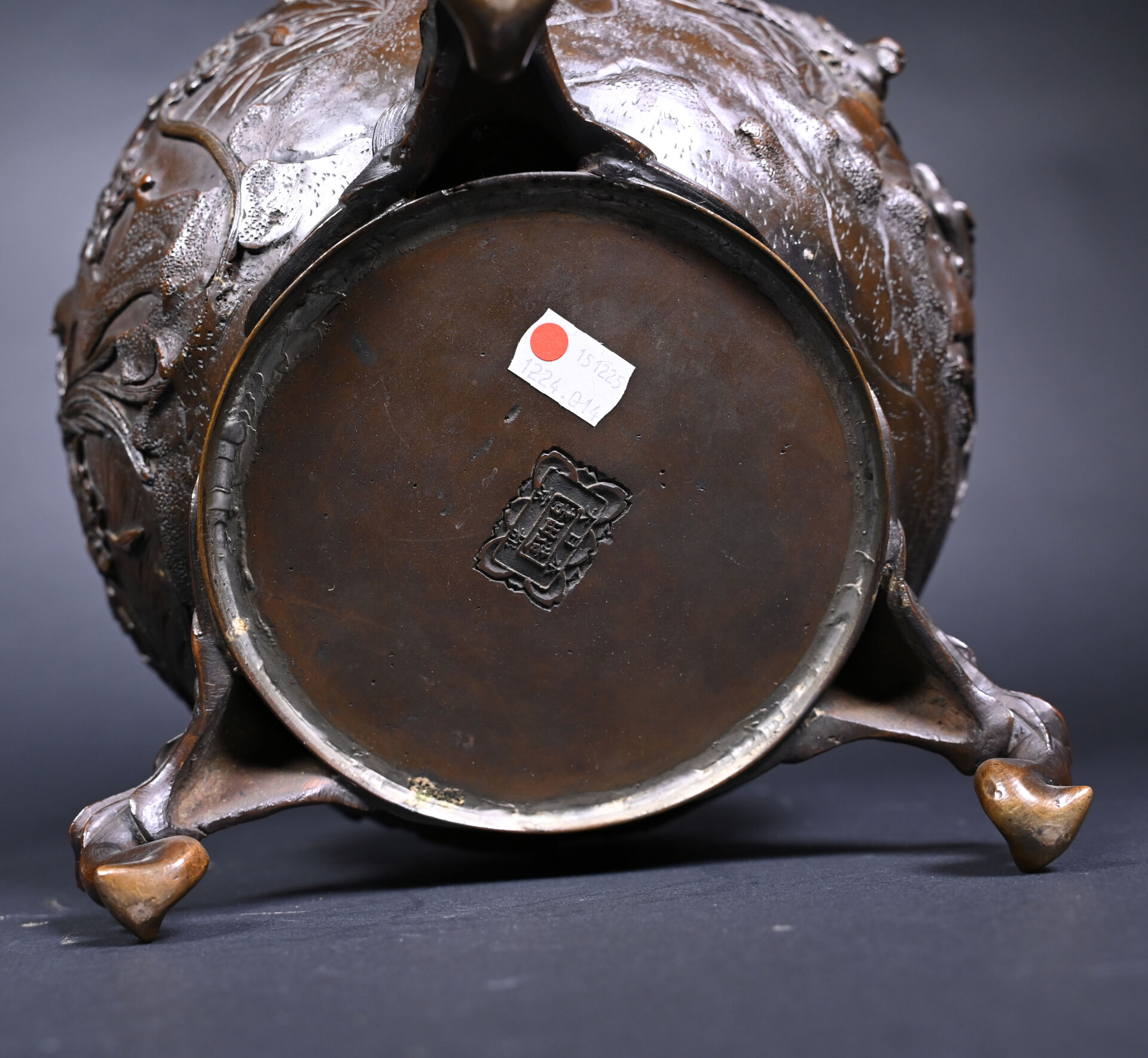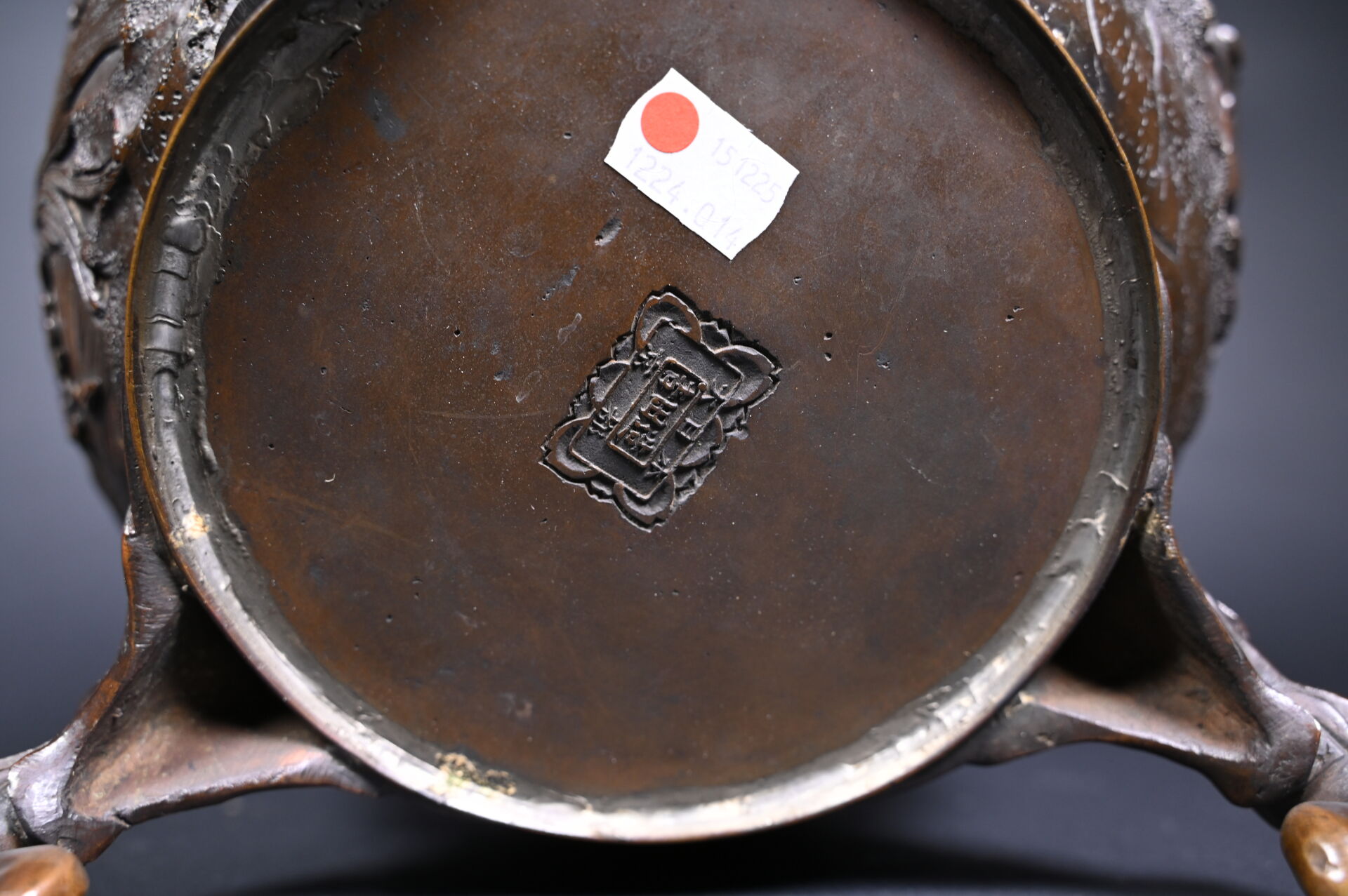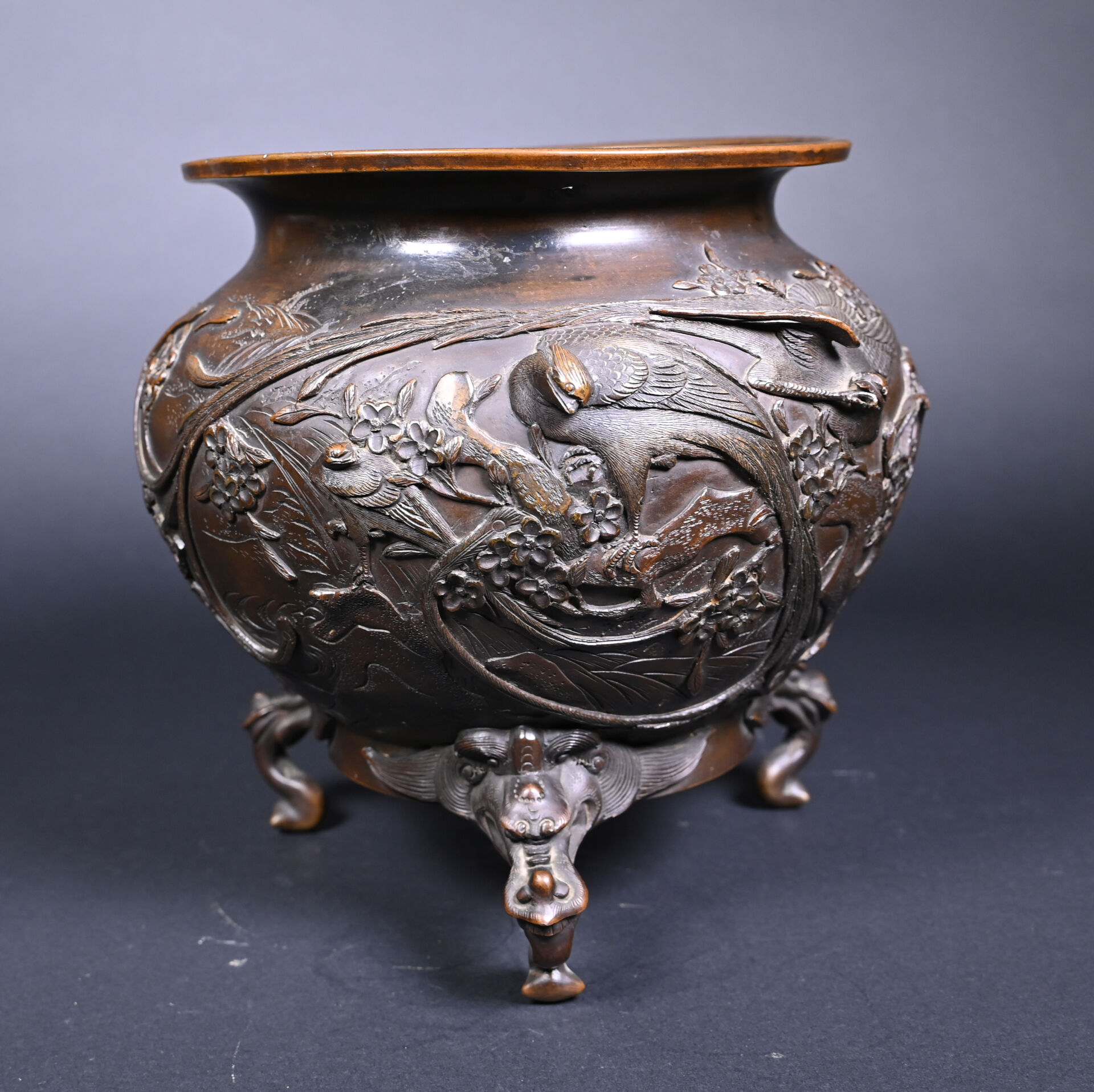Coupe ou brûle-parfum tripode en bronze patiné brun à décor en relief d’oiseaux branchés, bambous, les pieds à têtes de dragons (un trou sur le col). Japon, époque Meiji. Haut. : 27 cm.