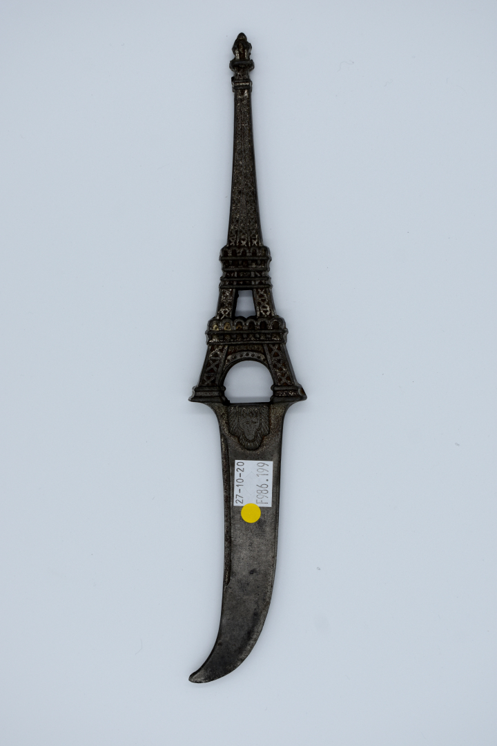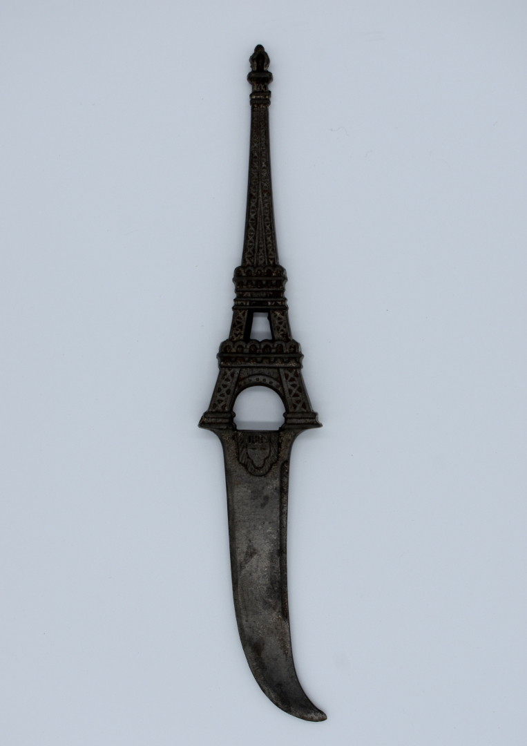 Coupe papier en métal, le manche en forme de Tour Eiffel daté 1889 pour l’exposition universelle. Long. : 28 cm.