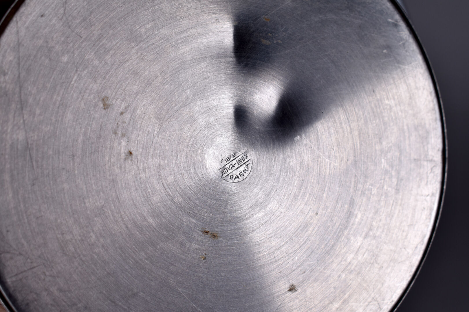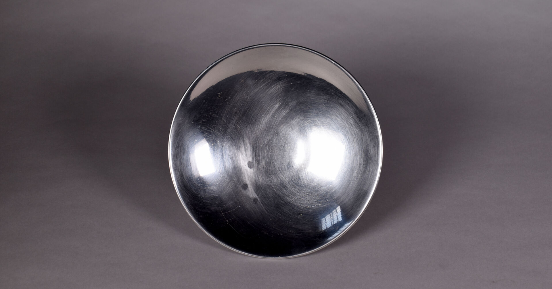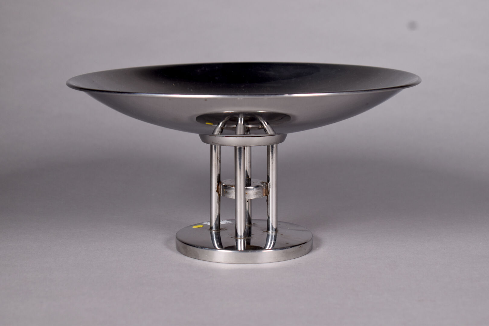 Coupe sur pied en inox à piètement à quatre colonnes, la base circulaire. Haut. : 12,5 cm – Diam. : 25 cm.