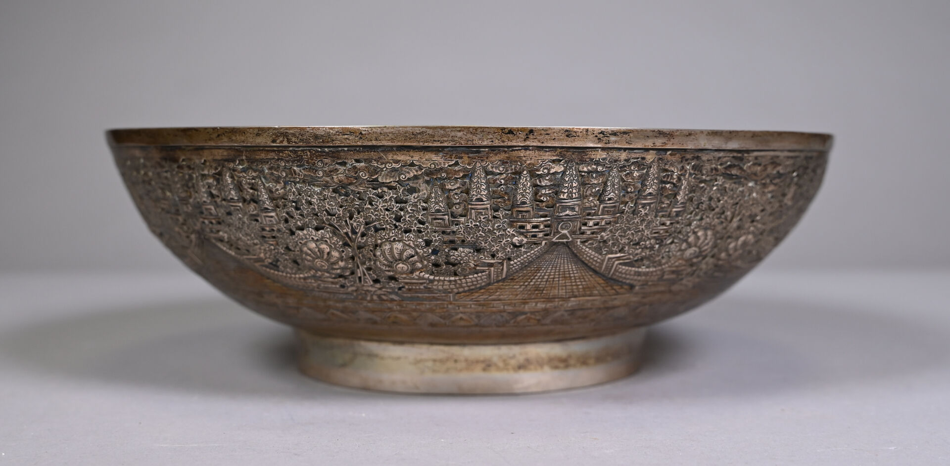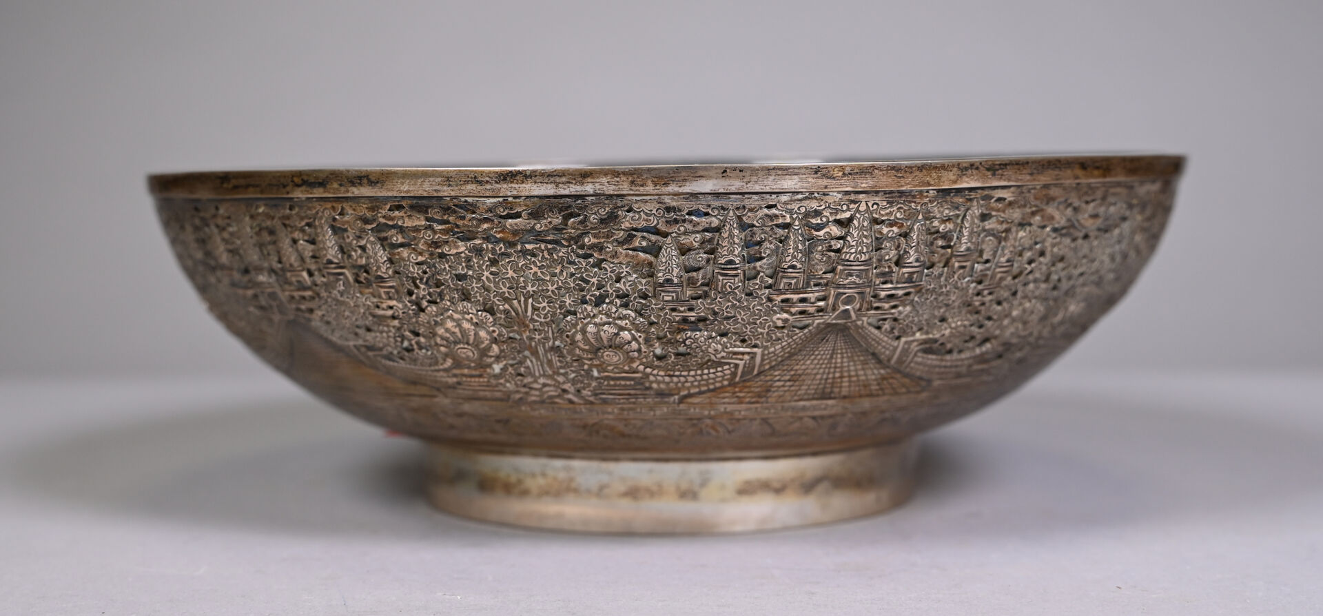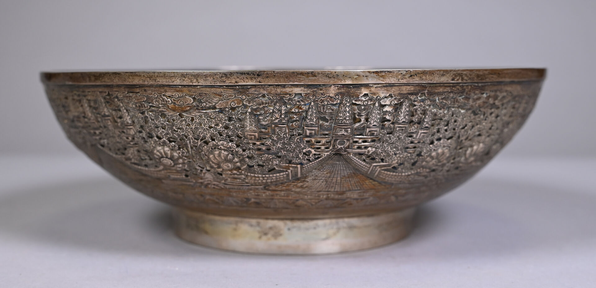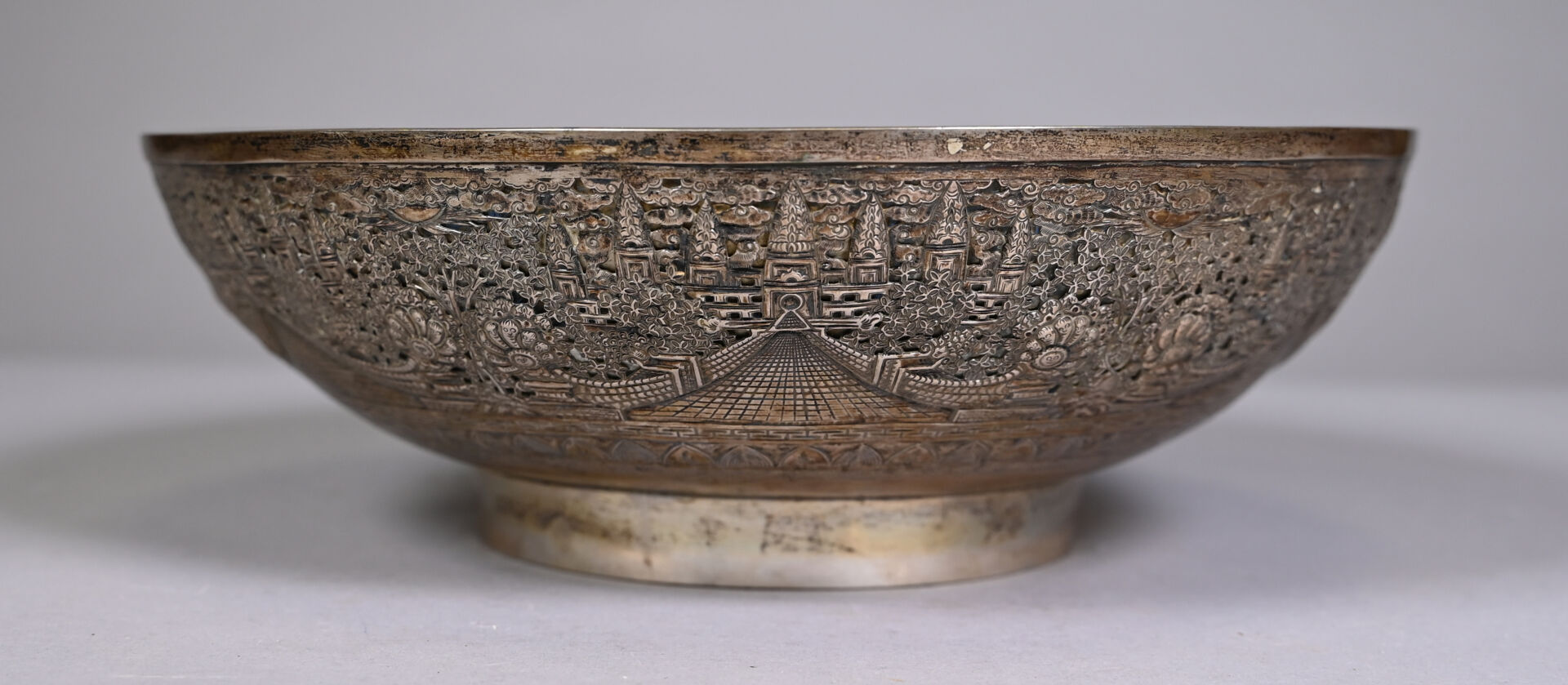 Coupe sur piédouche en argent probablement repoussé, représentant des vues d’Angkor. La base ornée du caractère Thô (longévité). L’intérieur en verre bleu. Indochine, vers 1920. Poids brut : 1375 g. Haut. : 9,5 cm – Diam. : 28,5 cm. Avec un socle en bois sculpté accidenté.