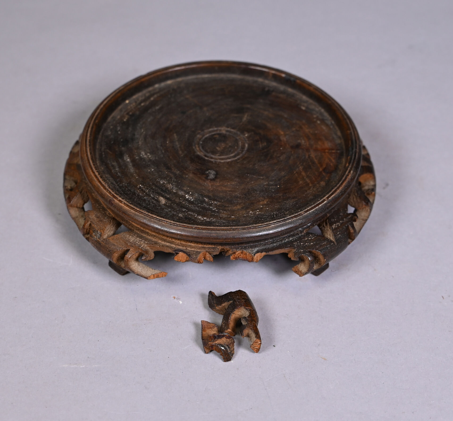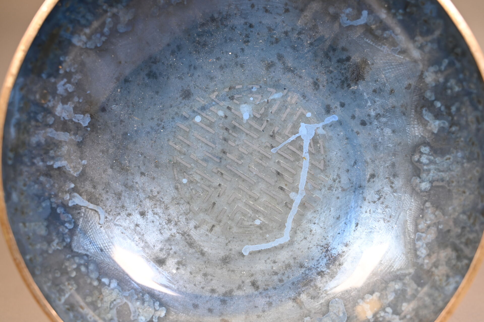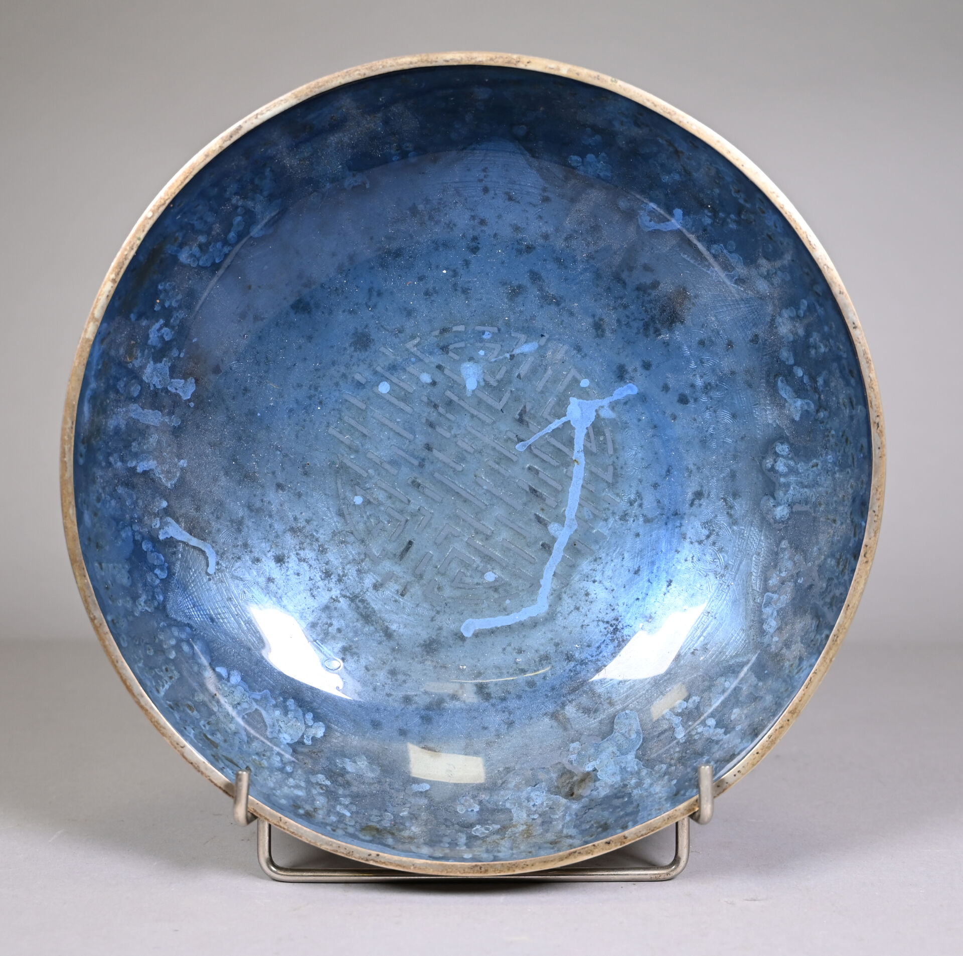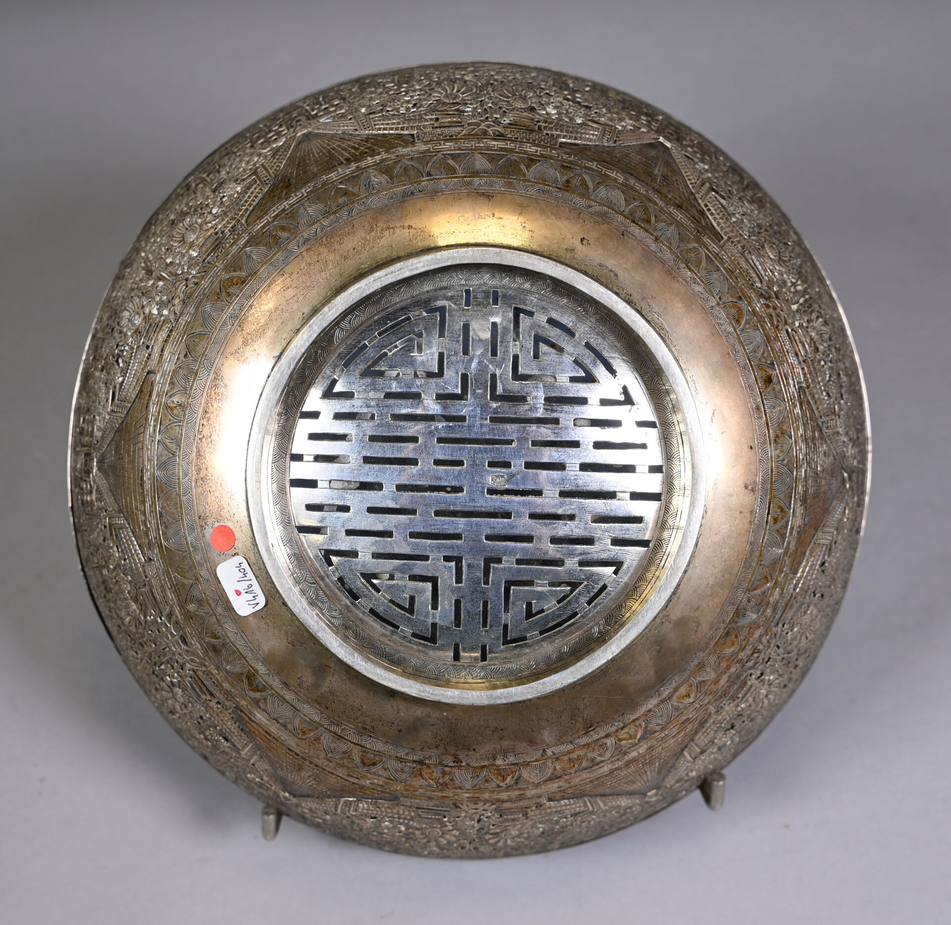 Coupe sur piédouche en argent probablement repoussé, représentant des vues d’Angkor. La base ornée du caractère Thô (longévité). L’intérieur en verre bleu. Indochine, vers 1920. Poids brut : 1375 g. Haut. : 9,5 cm – Diam. : 28,5 cm. Avec un socle en bois sculpté accidenté.
