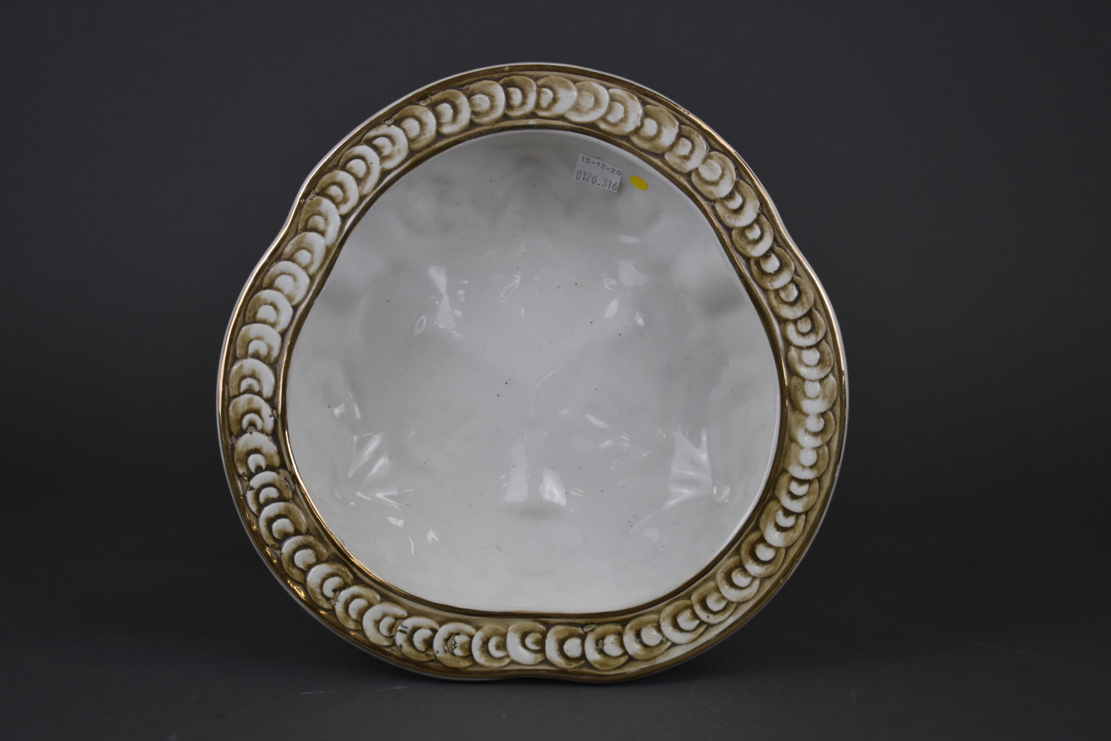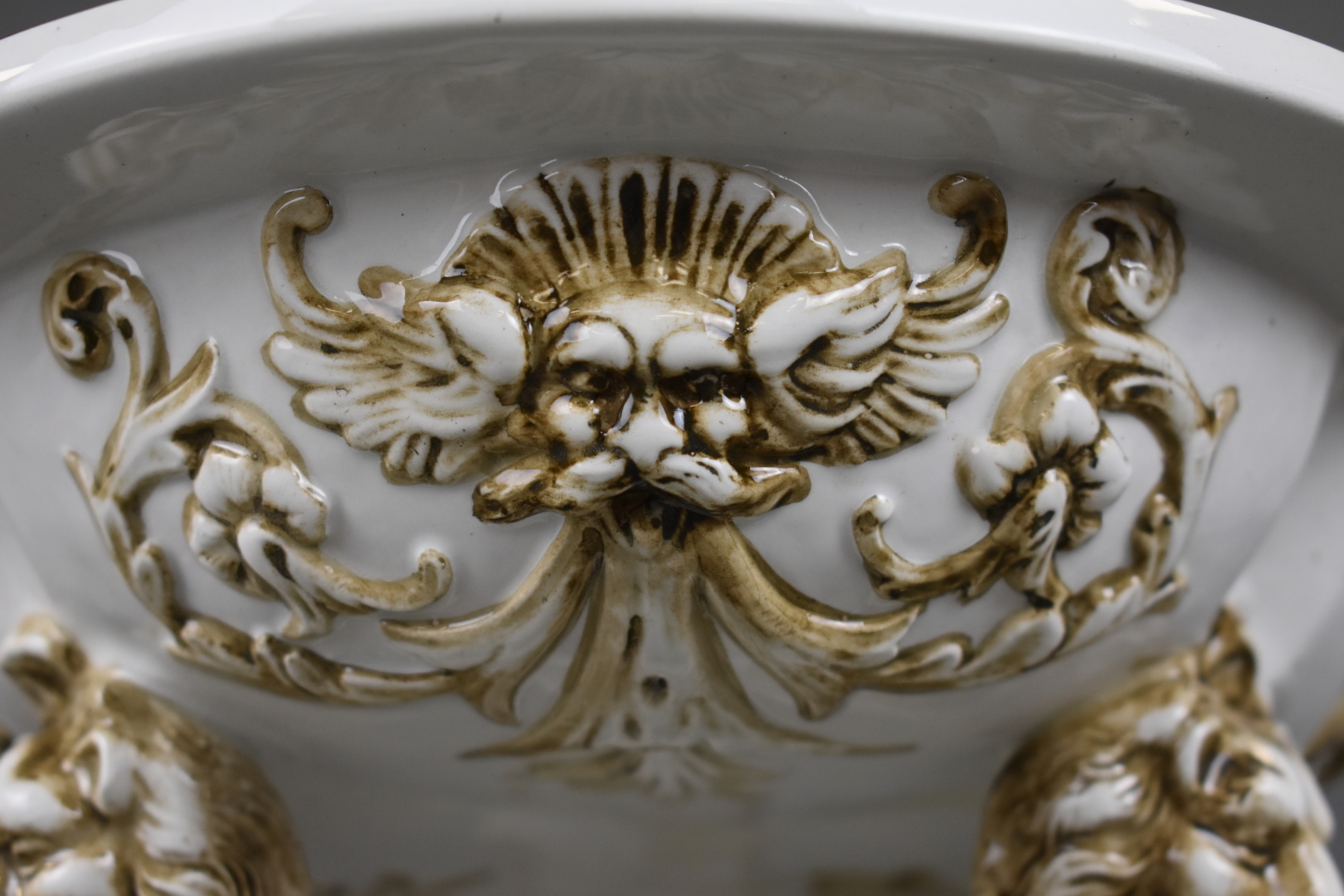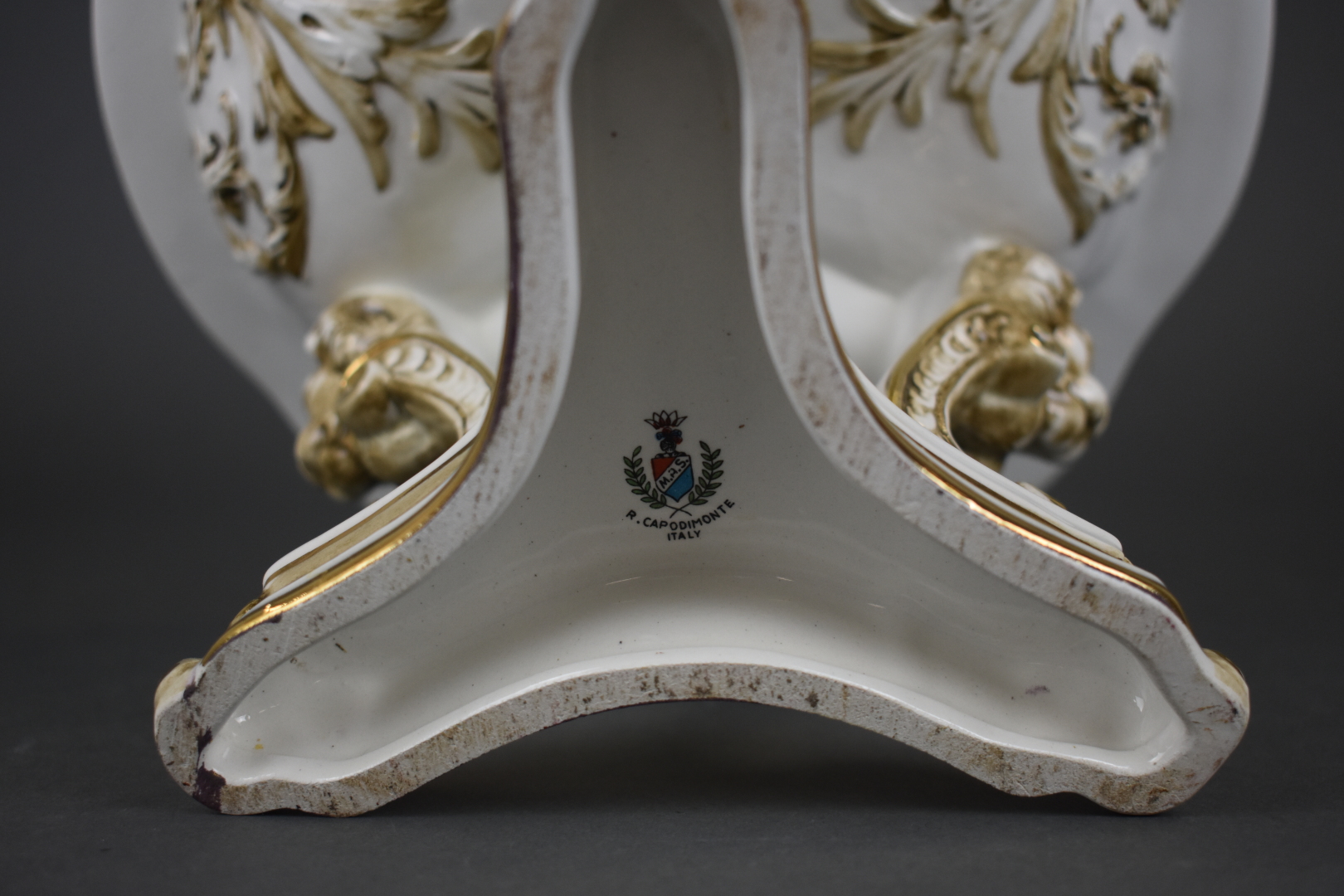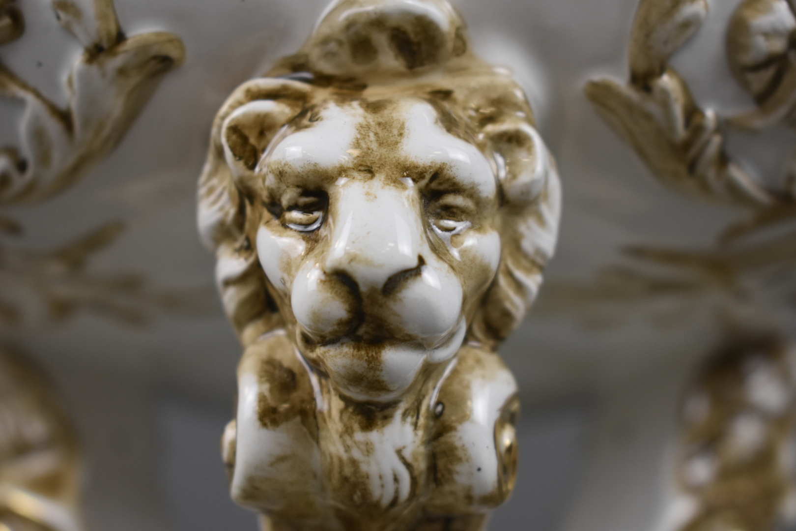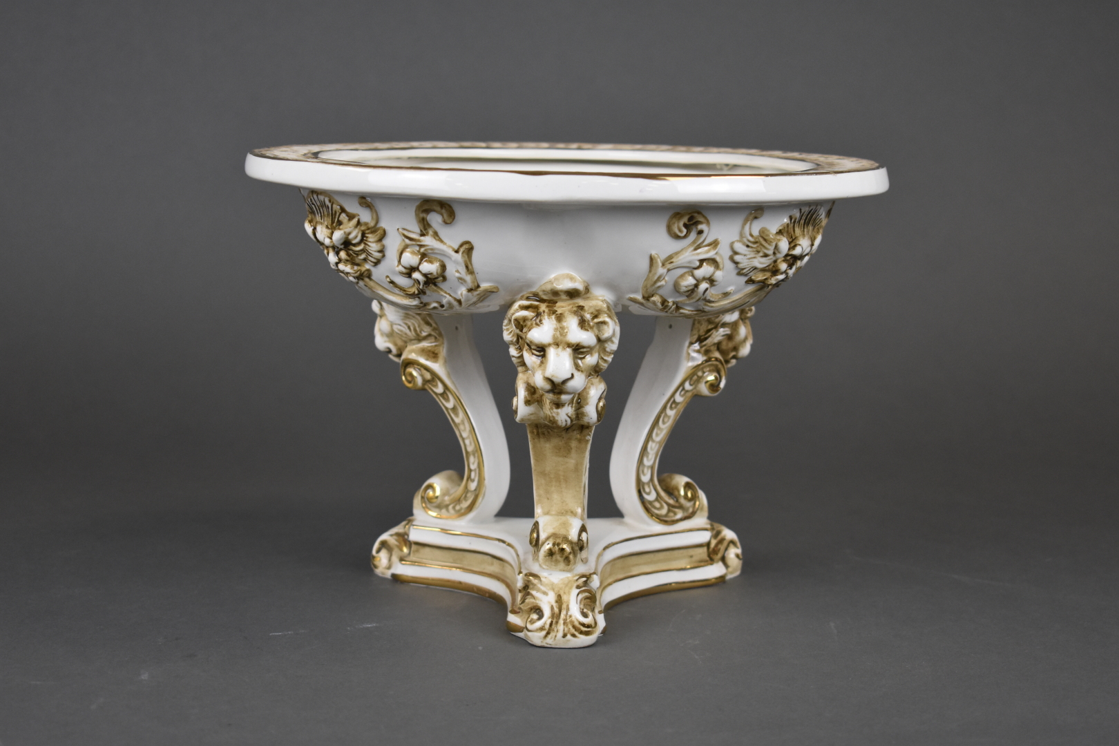 Coupe sur piedouche en porcelaine à décor émaillé brun et or. Les pieds surmontés de têtes de lion sur des consoles. Capodimonte, XXe siècle. Haut. : 18,5 cm.