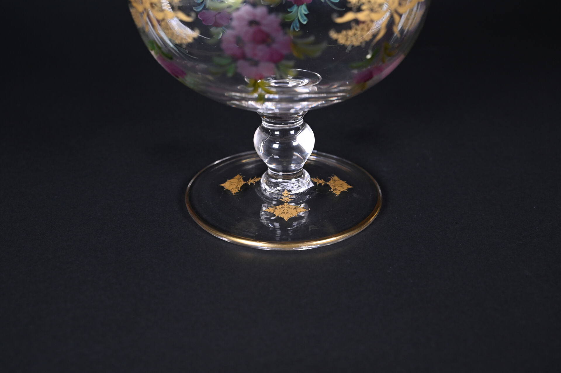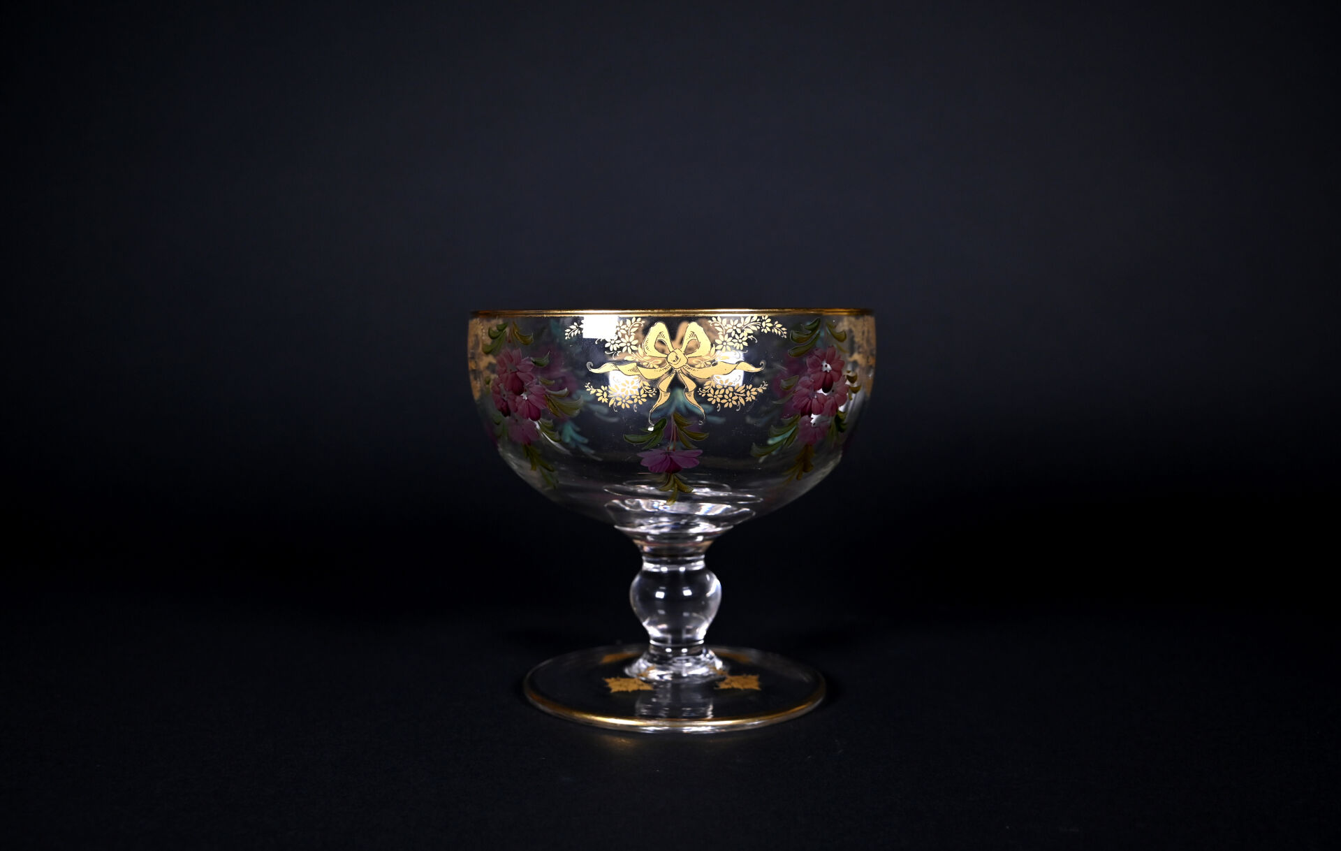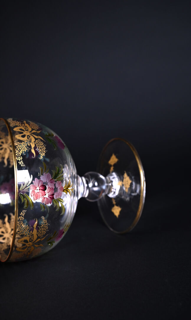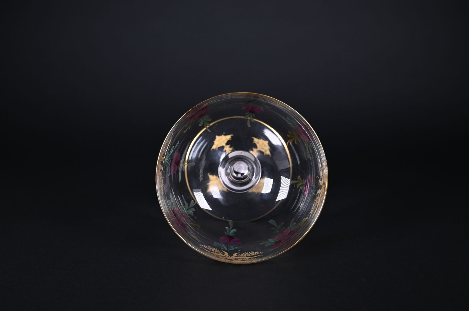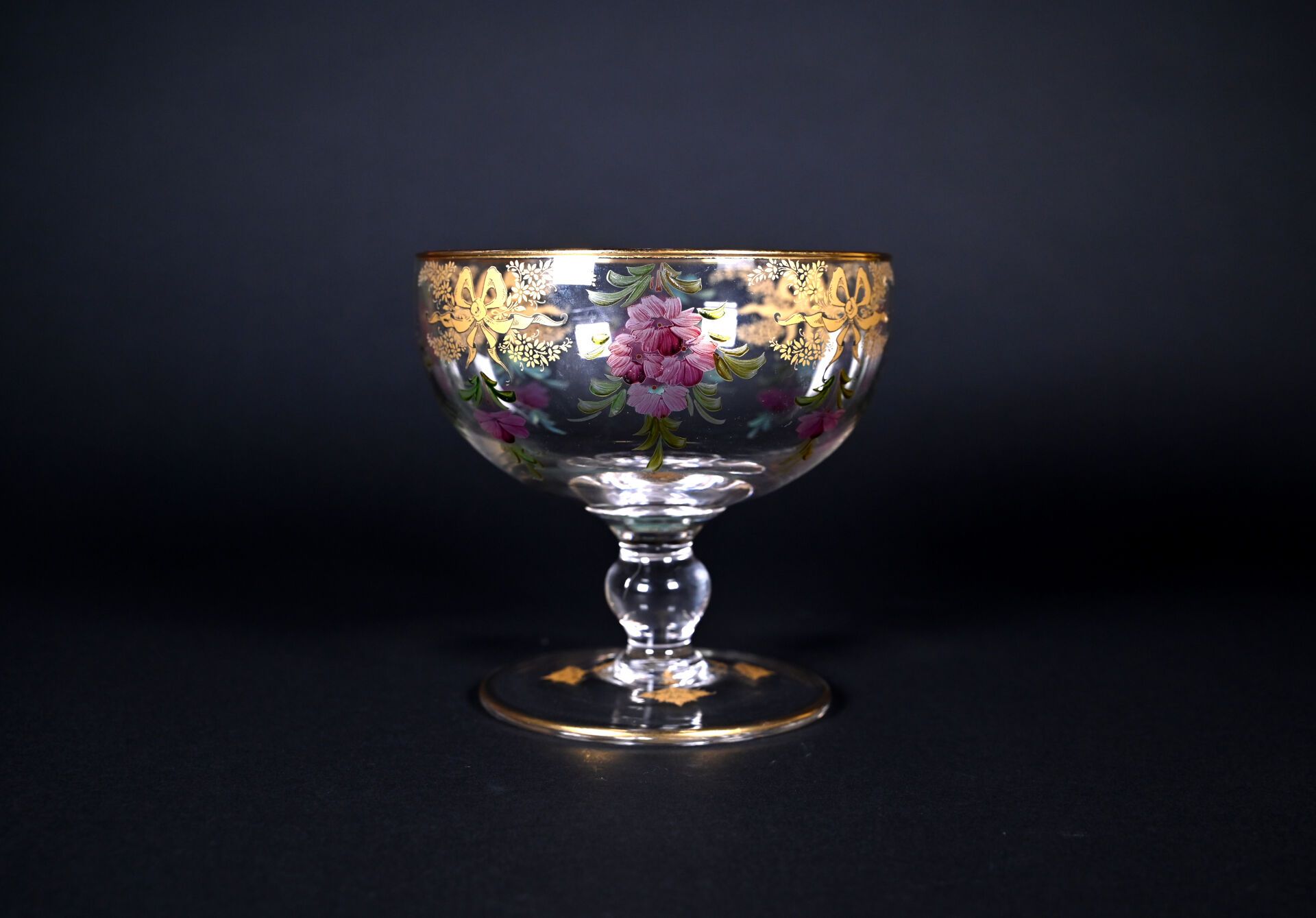 Coupe sur piédouche en verre à décor émaillé peint et dorure à décor de fleurs et rubans noué. Début du XXe siècle. Haut. : 17 cm – Diam. : 17,5 cm.