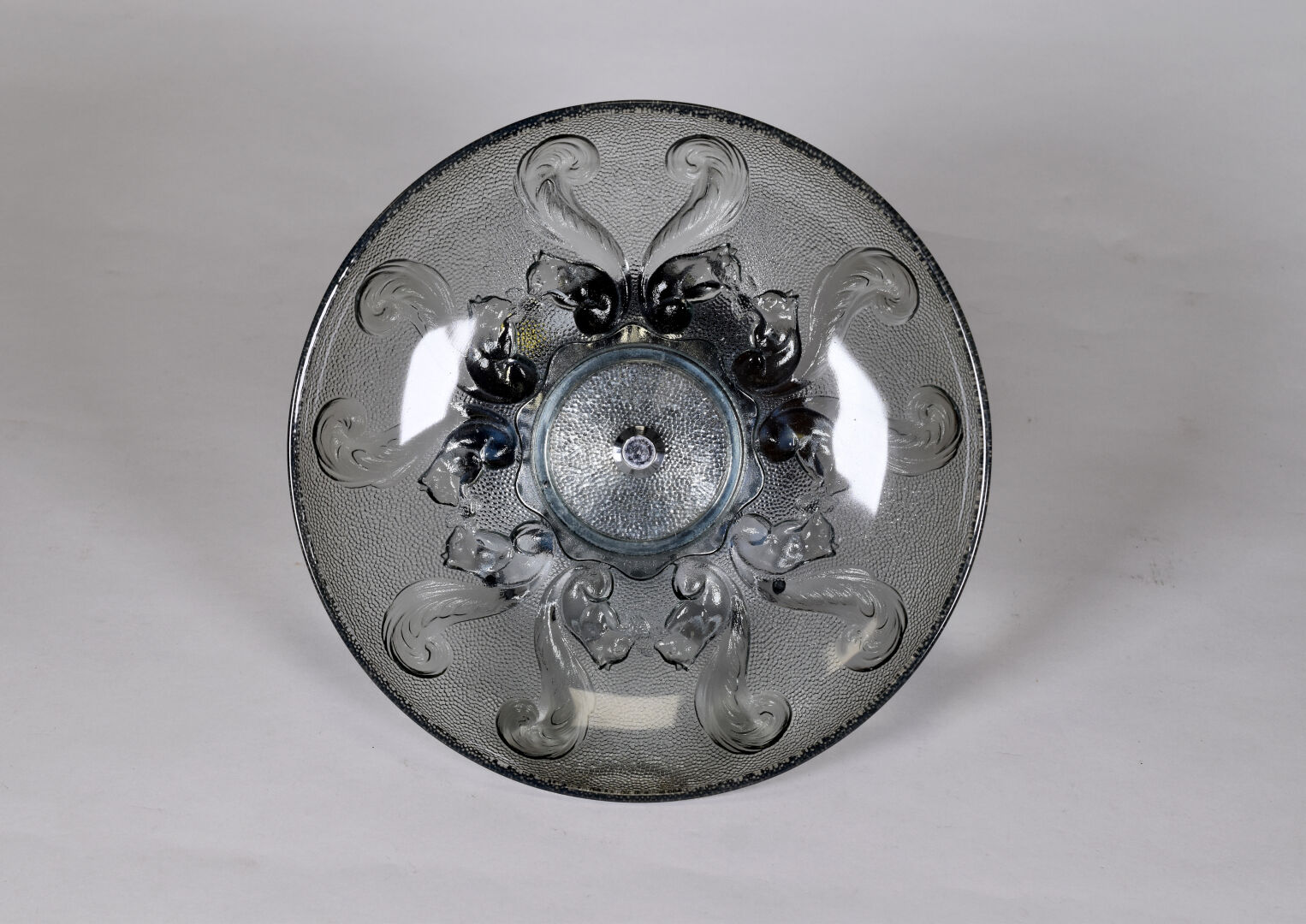 Coupe sur piedouche en verre moulé à décor d’écureuils, la base en métal chromé. Vers 1940. Haut. : 10 cm – Diam. : 32 cm.