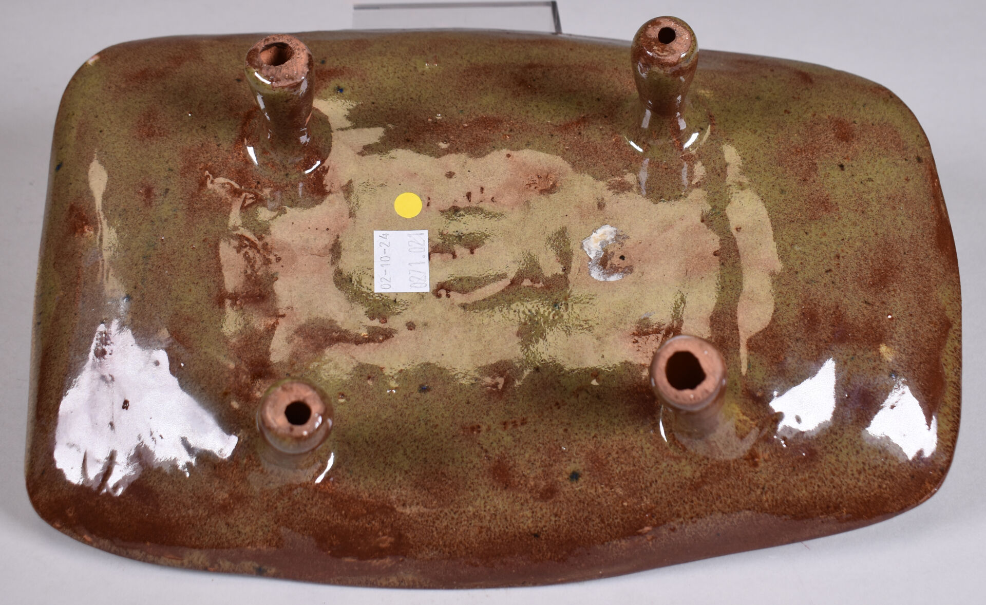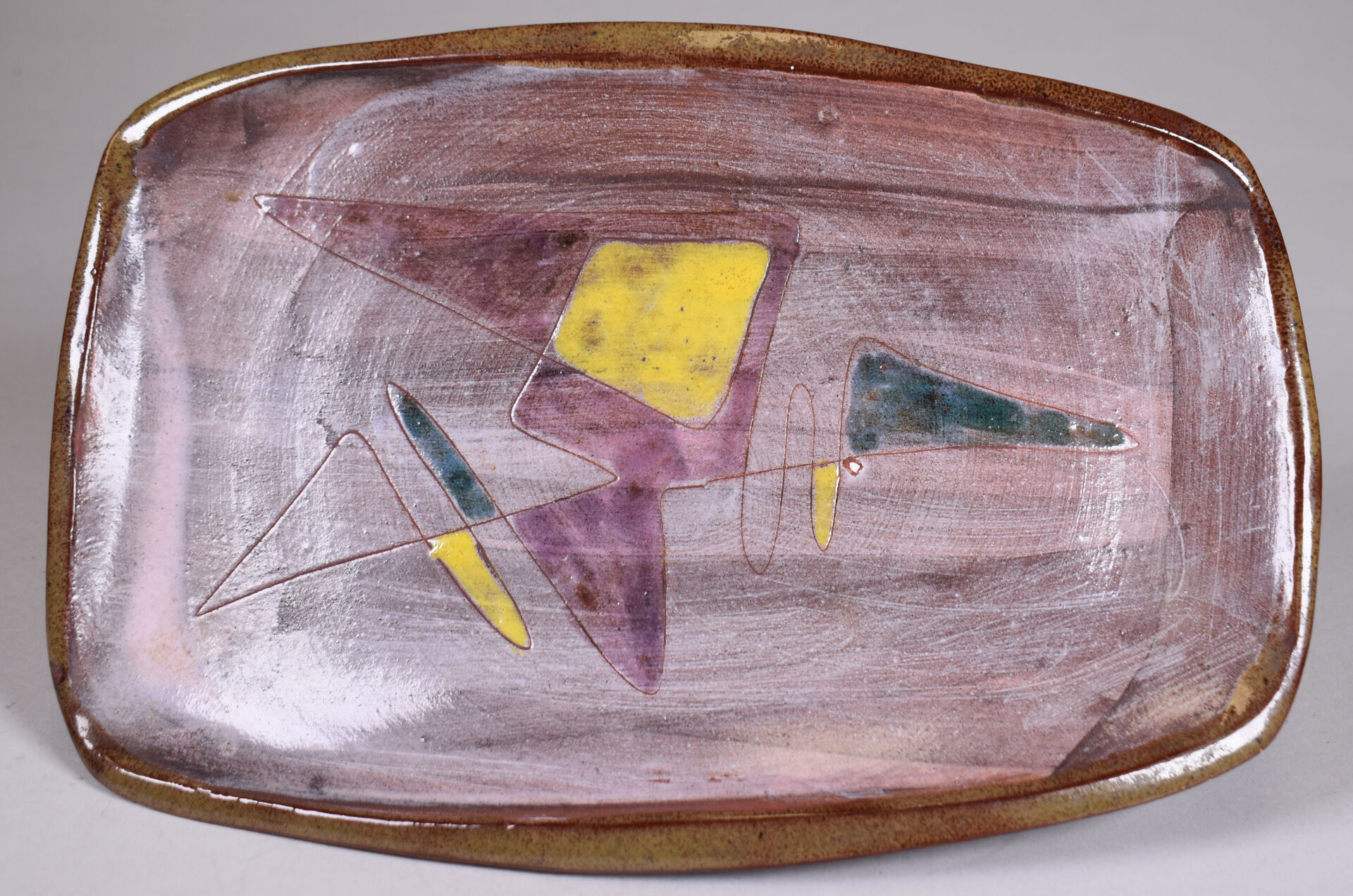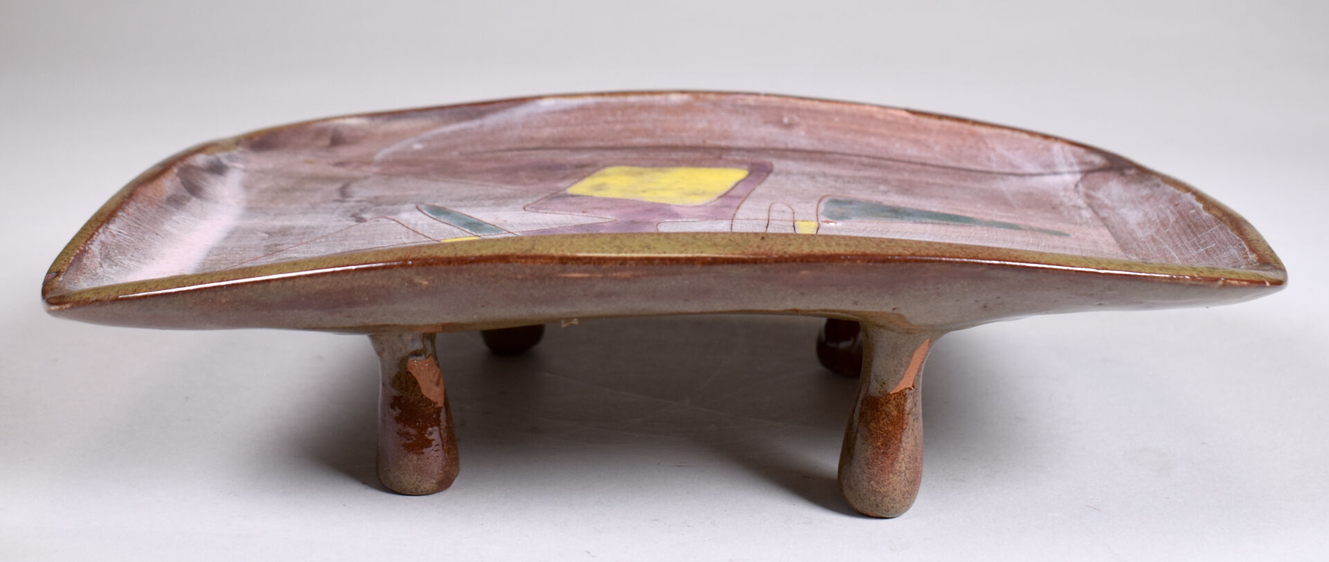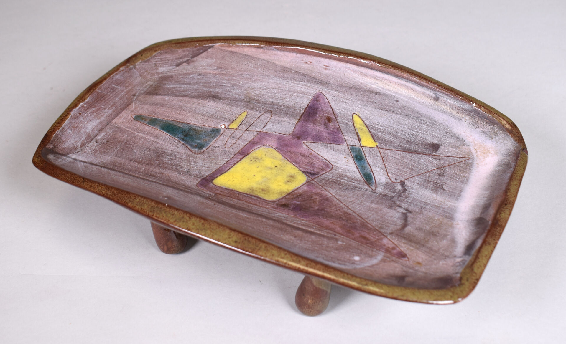 Coupe sur pieds en terre cuite à décor émaillé d’un motif géométrique sur fond ocre. Probablement Vallauris, vers 1950 / 1960. Haut. : 8 cm.