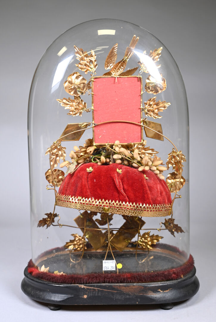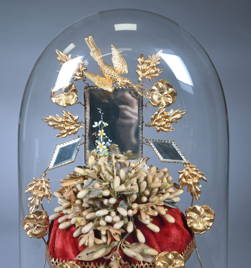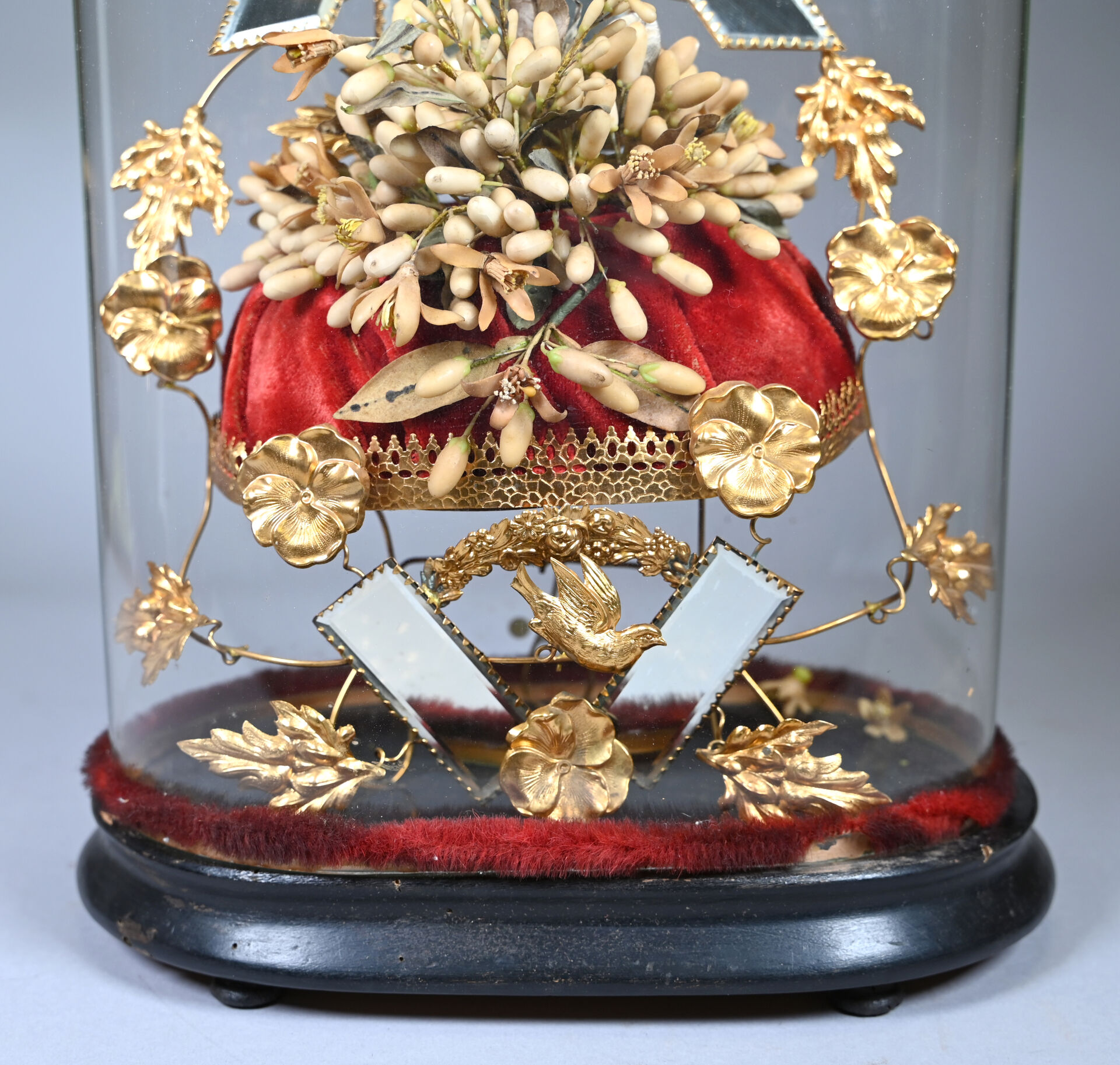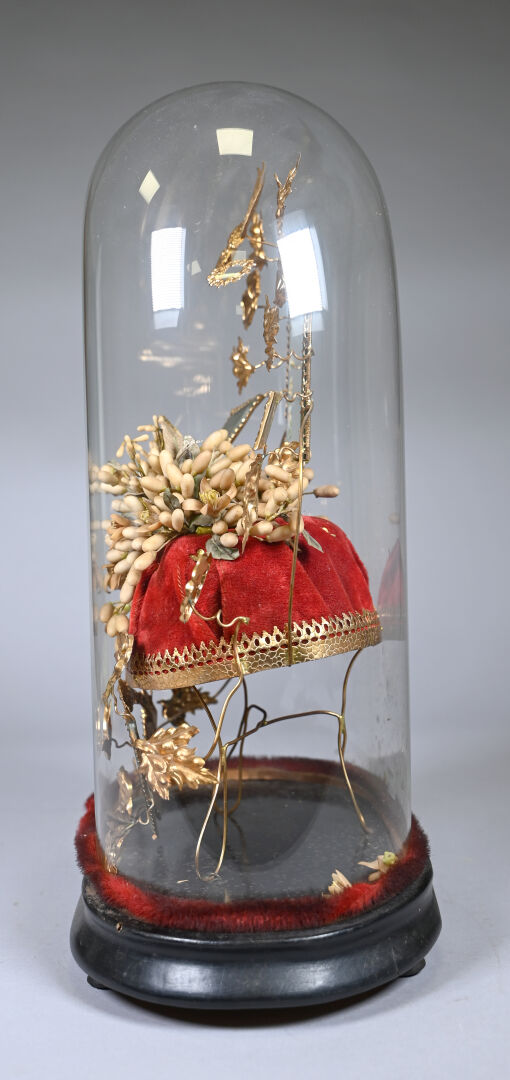 Couronne de mariée en cire, tissu, métal doré (manques) sous globe. Fin du XIXe siècle. Haut. totale : 49 cm.